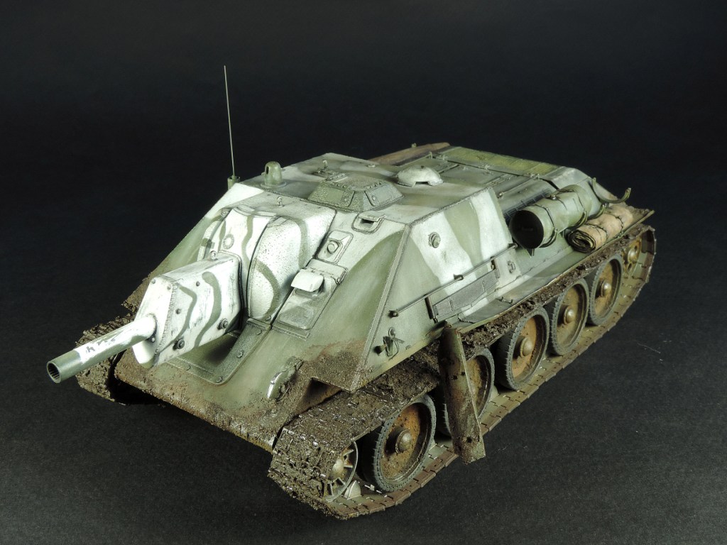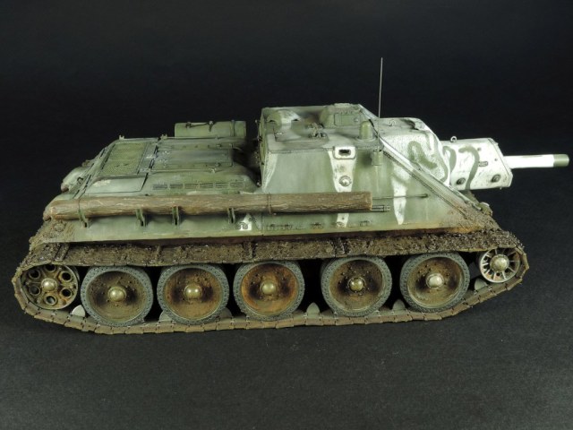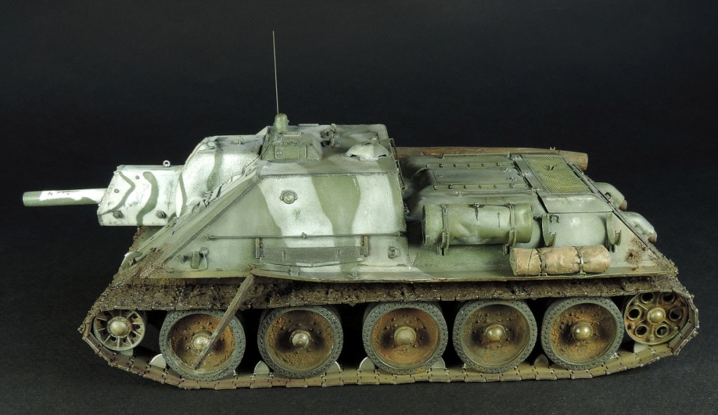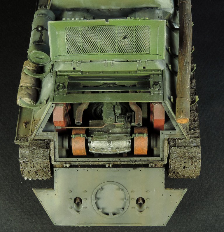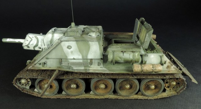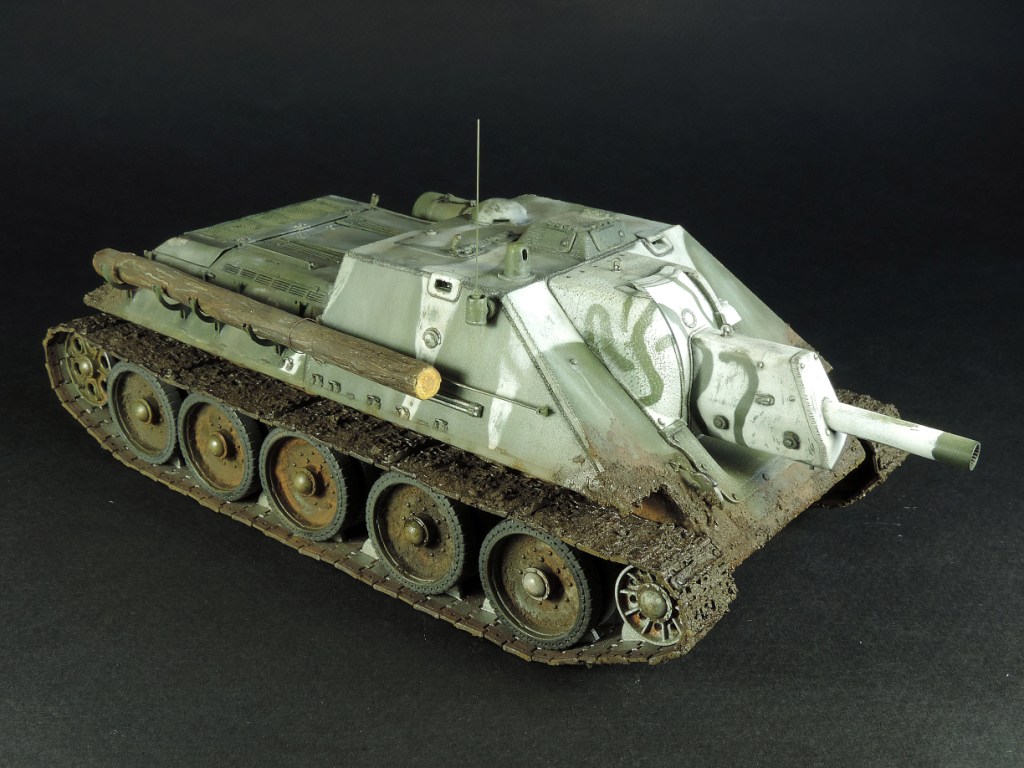 Так как был собран моторный отсек, пришлось сделать все люки и крышки на корме рабочими, но всё равно многого не видно. Не смог устоять и опять закидал самоходку грязью, по задумке это ранняя весна, распутица. Конечно на подставке она смотрелась бы на много удачнее, но в планах её не было изначально.