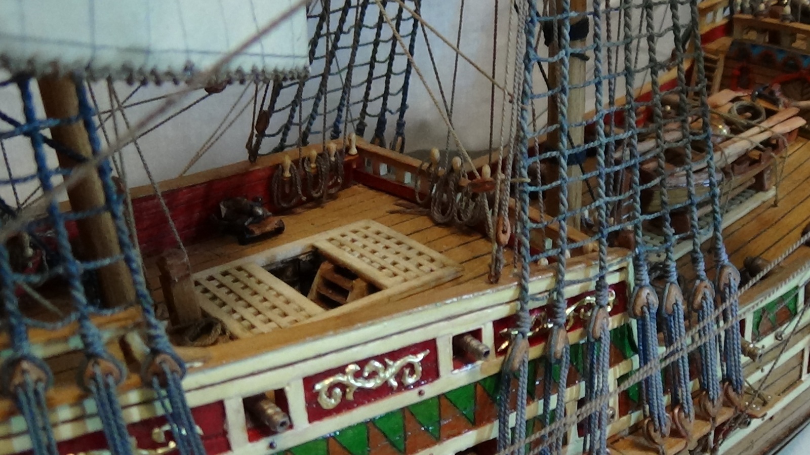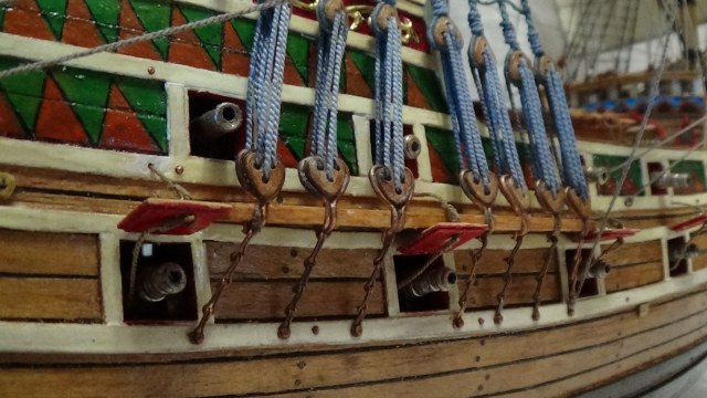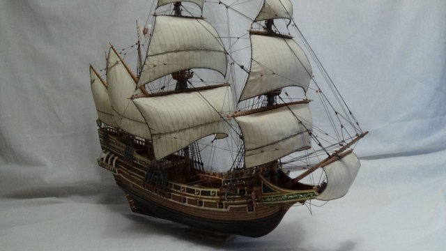 Модель строилась по технологии названной О.Курти-"слоеный пирог". Стволы пушек, якоря, фигура дракона отлиты из олова и тонированы.