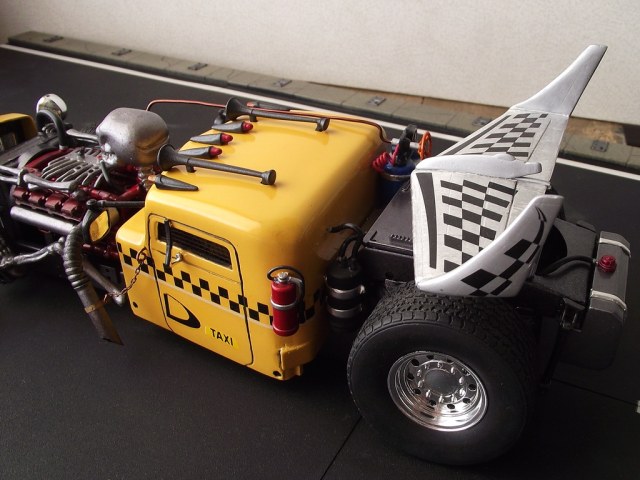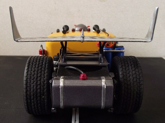 Преимущественно использованы детали от моделей грузовиков: рама от Фрейтлайнера, кабина от Петербилта, двигатель V8 от Мерседеса, задний мост и подвеска от ДАФа. Колёса: передние - Ниссан, задние - ревелловские "суперсинглы". Скелетик долго прозябал на дверце холодильника, пока не попался мне "под руку"! )))