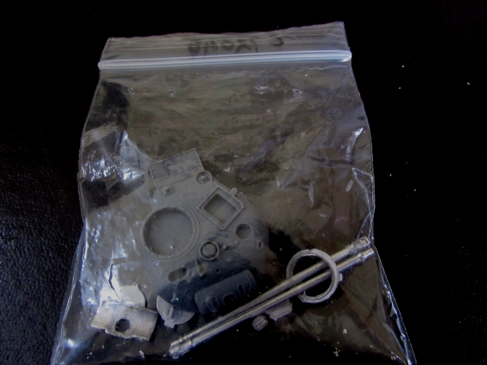 Итак, модель. Упакована в прозрачный пакетик. Этикетка была, но почему-то на израильский "Супер Шерман". В пакетике - смоляная башня, и люки и ствол из силумина.