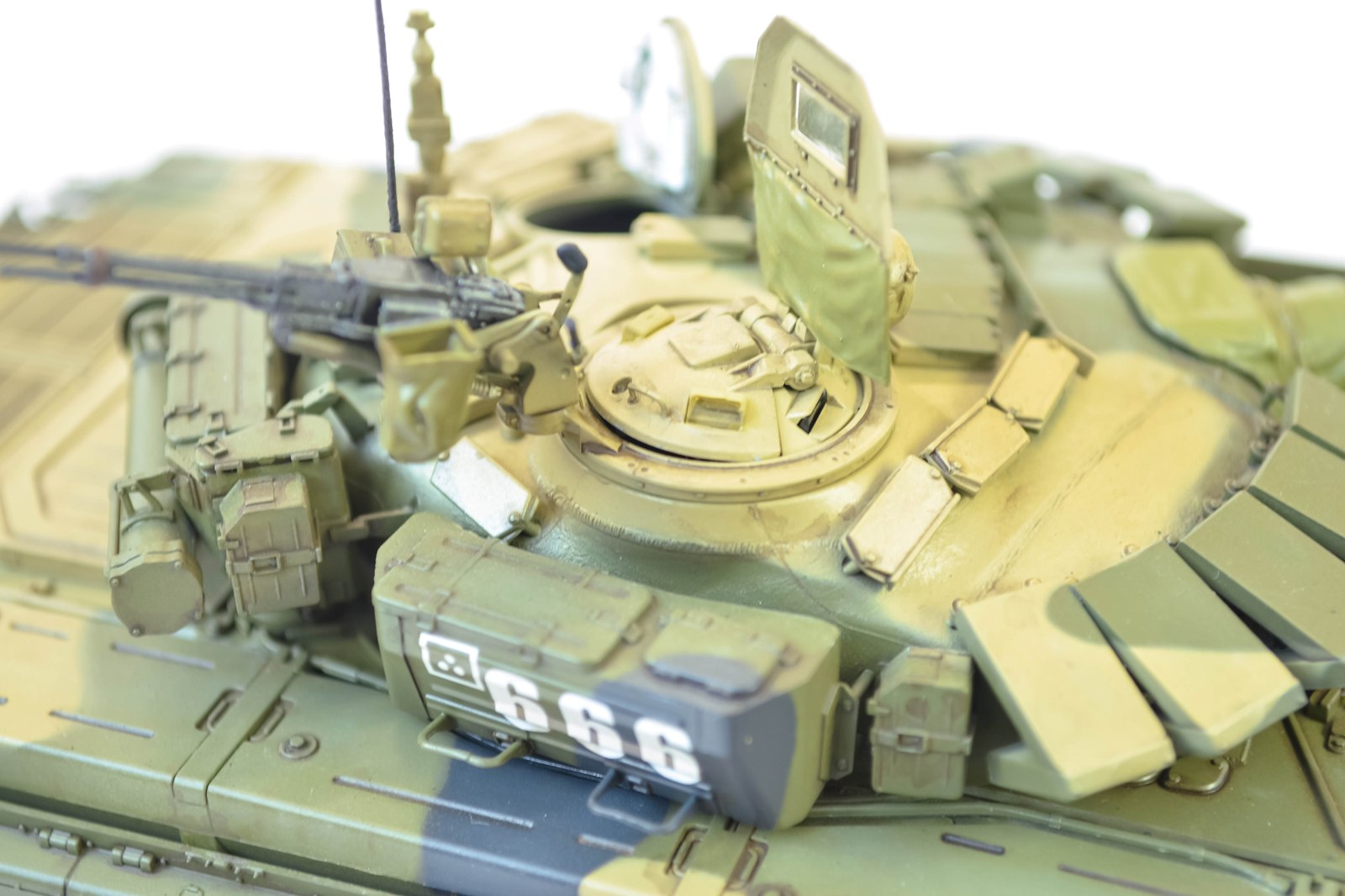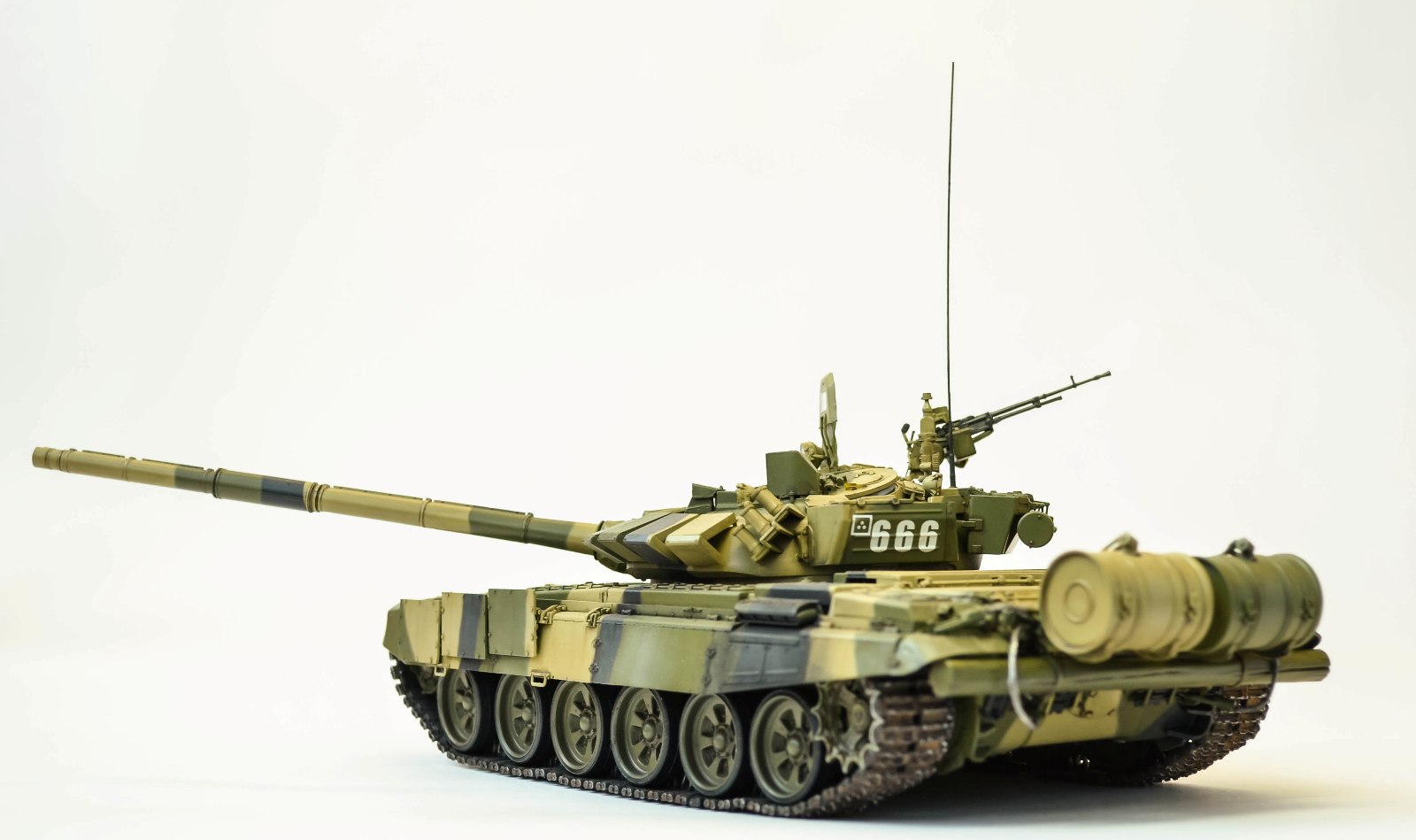 Модель танка Т-72 Б3 от фирмы Менг.Набор великолепный ,все стыкуется отлично,правда есть на некоторых мелких деталях облой.Сборка полностью из коробки.Тросы из проволки родные давались ниткой.По инструкции борт 666 полностью зеленый я решил покрасить в трехцветный.Фигурку пока не покрасил,опыта мало еше пока.