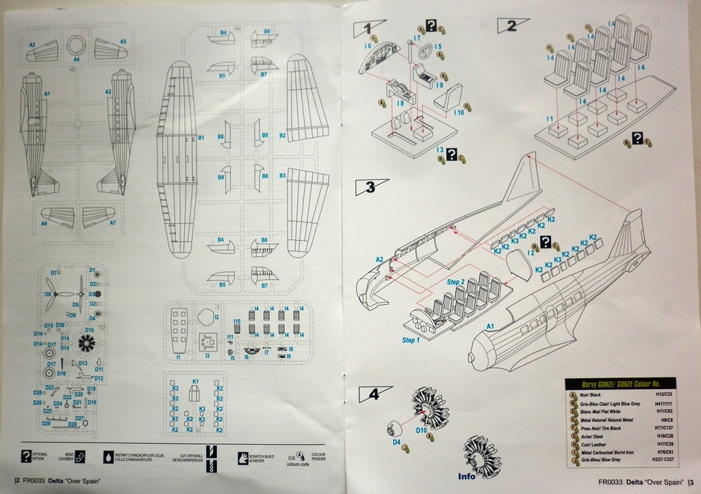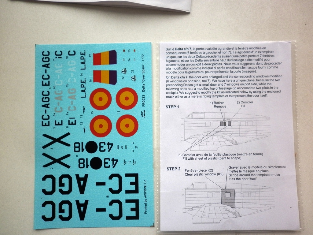 Инструкция цветная, отпечатанная на мелованной бумаге, неплохо описывает процесс сборки базового варианта и 4 схемы окраски самолета в разные периоды службы в Испании. Небольшой вкладыш описывает манипуляции с дверью и содержит саму наклейкую