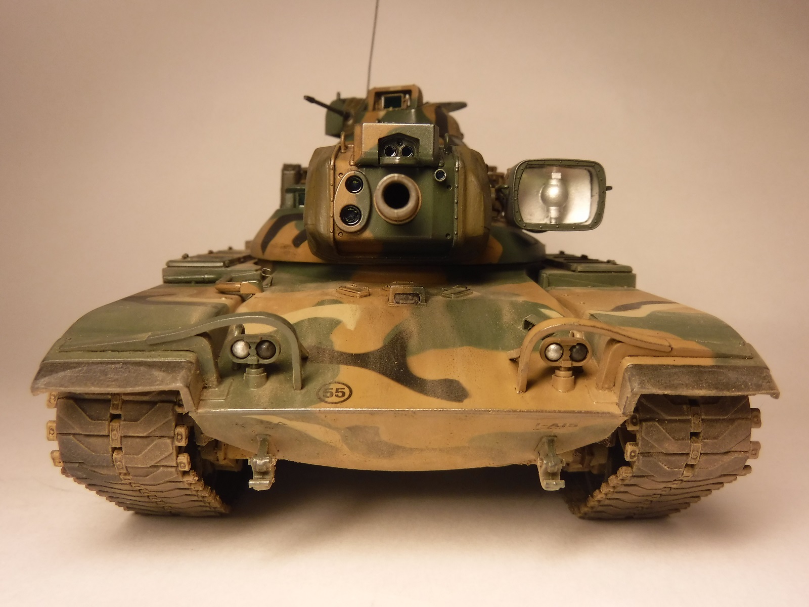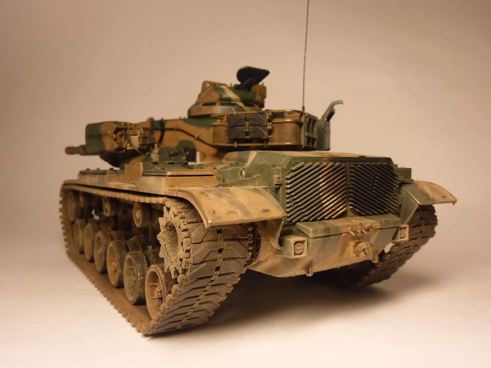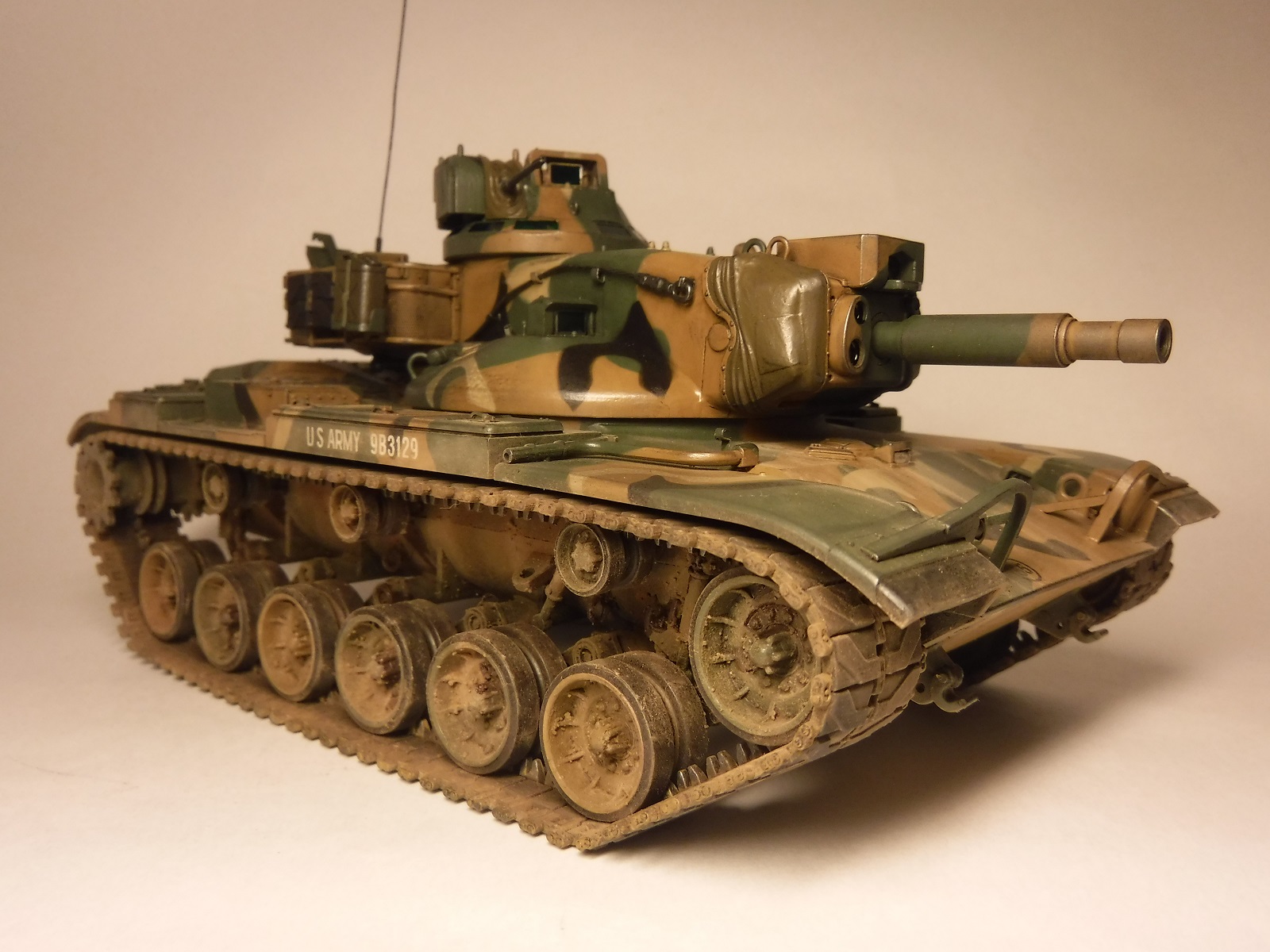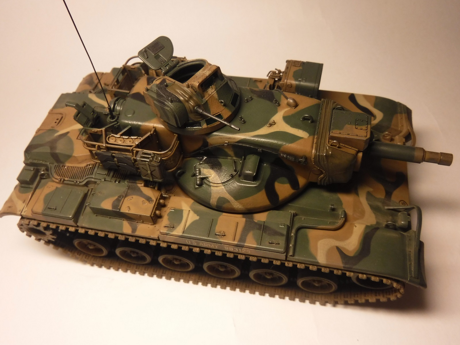 Привет! M60A2 выпускался в период с 1972 года по 1974 год, общее число выпущенных машин 526. Установлена новая башня со 152-мм орудием — пусковой установкой, позволяющим вести стрельбу как обычными артиллерийскими снарядами, так и противотанковыми управляемыми ракетами «Шилейла» (на дальность до 3000 м). Орудие стабилизировано в двух плоскостях наведения. В систему управления огнём входит лазерный прицел-дальномер и электронный баллистический вычислитель, пассивные приборы ночного видения. Танки М60А2 находились в подразделениях американских войск в ФРГ. Судя по сообщениям зарубежной прессы, они показали недостаточную эффективность и особенно надёжность вооружения, поэтому было решено переоборудовать их в другие варианты. Набор не плохой,присутствует травление. Кое-где пришлось пошпаклевать,особенно в нижней части корпуса. Красил камо в 4 цвета красками Mr.Hobby. Смывки свои. Пигменты Wilder,Zip maket.Почти весь из коробки... Моя первая работа на Каропке и шестая вообще... Не судите строго..! )