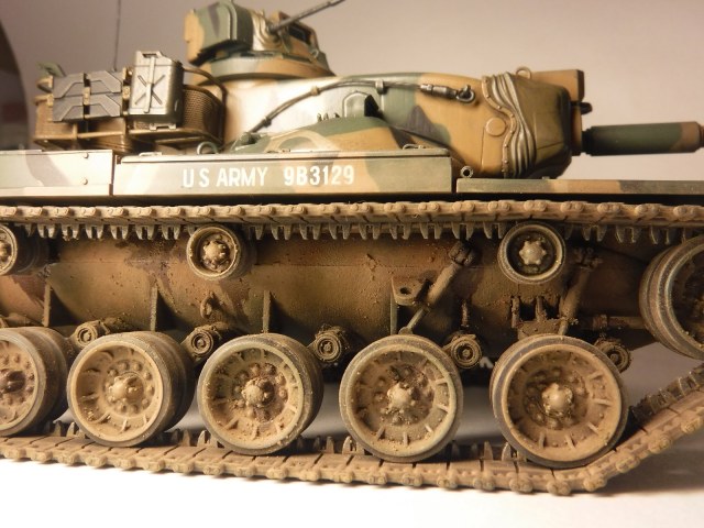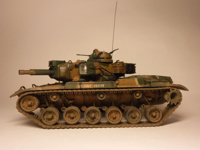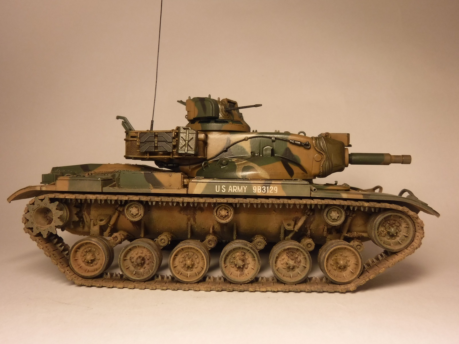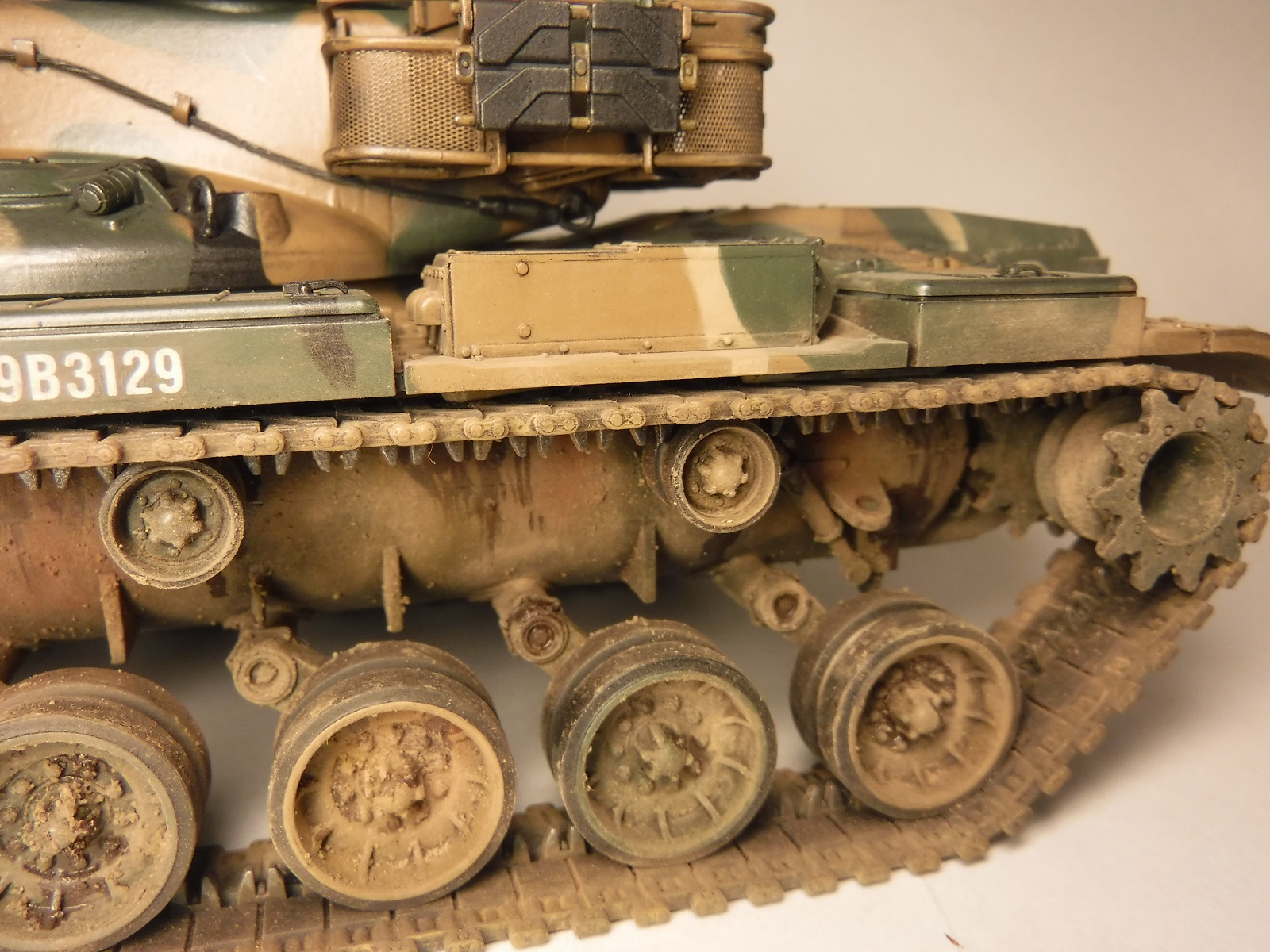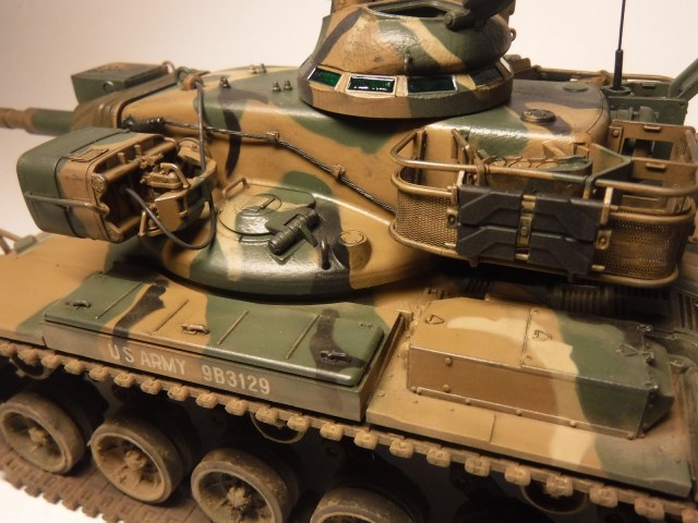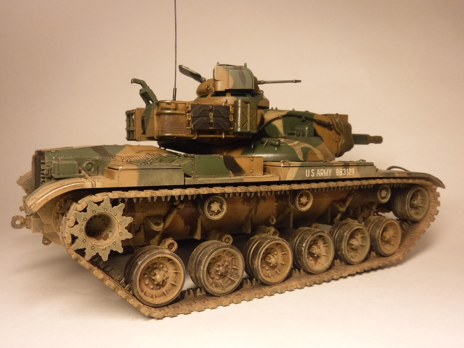 Привет! M60A2 выпускался в период с 1972 года по 1974 год, общее число выпущенных машин 526. Установлена новая башня со 152-мм орудием — пусковой установкой, позволяющим вести стрельбу как обычными артиллерийскими снарядами, так и противотанковыми управляемыми ракетами «Шилейла» (на дальность до 3000 м). Орудие стабилизировано в двух плоскостях наведения. В систему управления огнём входит лазерный прицел-дальномер и электронный баллистический вычислитель, пассивные приборы ночного видения. Танки М60А2 находились в подразделениях американских войск в ФРГ. Судя по сообщениям зарубежной прессы, они показали недостаточную эффективность и особенно надёжность вооружения, поэтому было решено переоборудовать их в другие варианты. Набор не плохой,присутствует травление. Кое-где пришлось пошпаклевать,особенно в нижней части корпуса. Красил камо в 4 цвета красками Mr.Hobby. Смывки свои. Пигменты Wilder,Zip maket.Почти весь из коробки... Моя первая работа на Каропке и шестая вообще... Не судите строго..! )