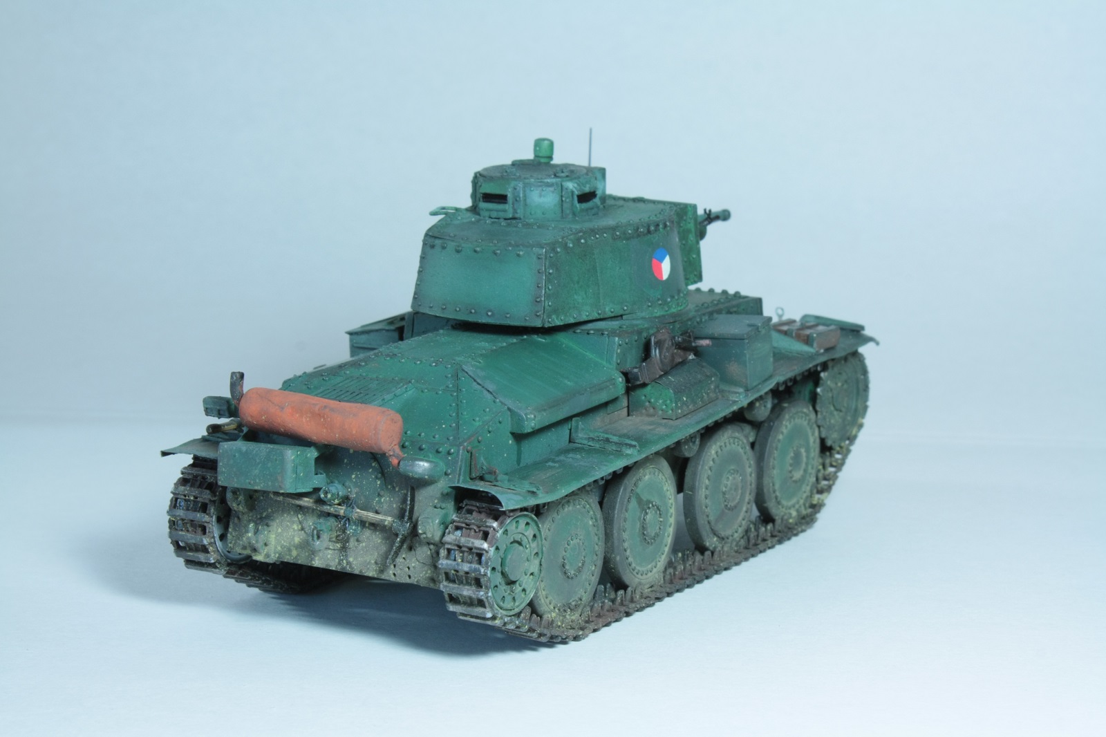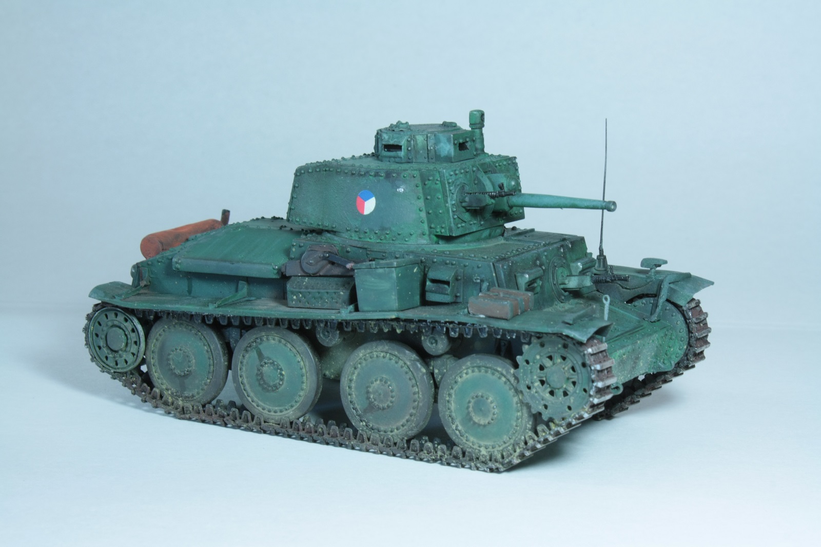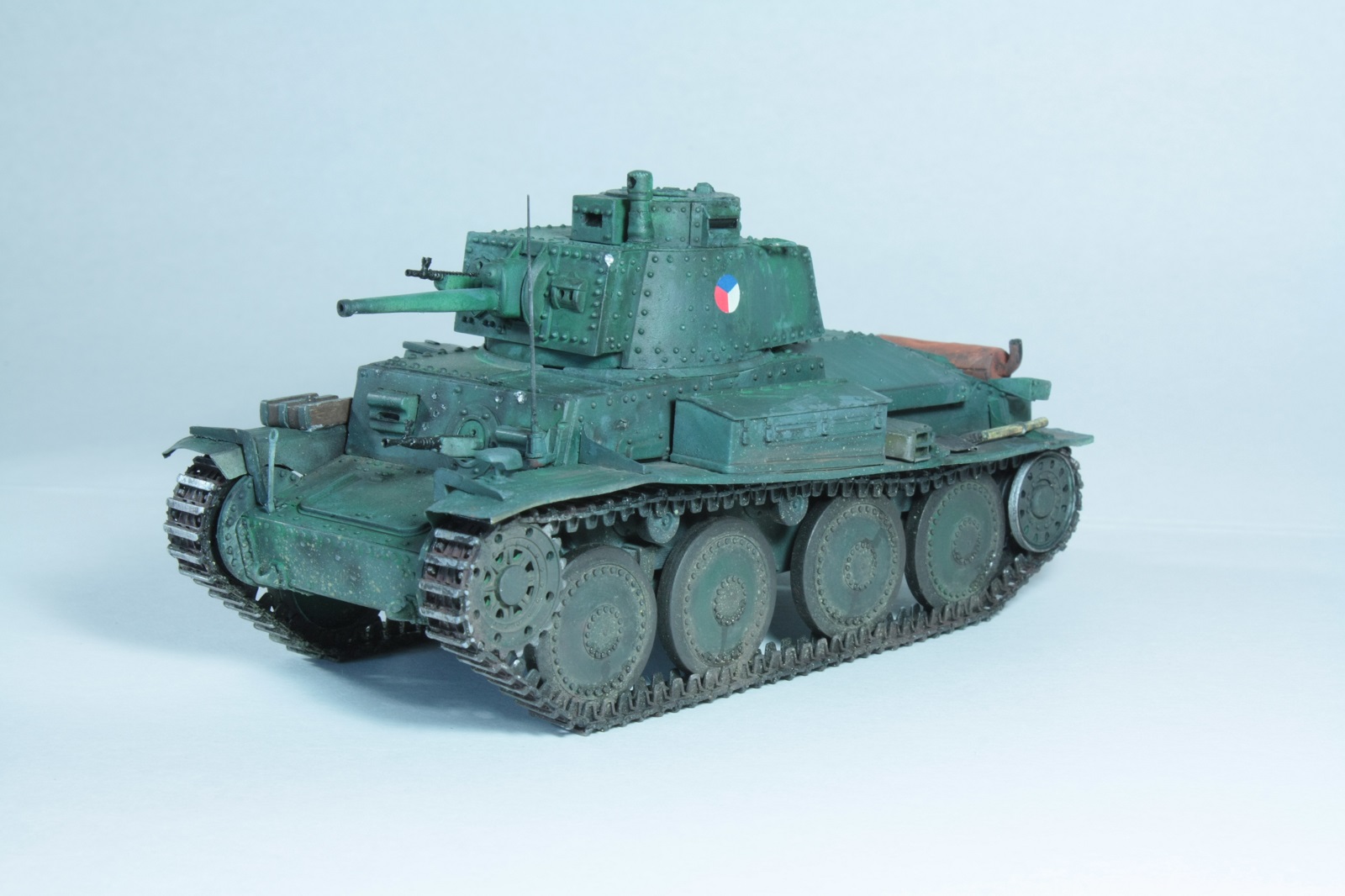 С фарой Нотек, немецким антенным вводом, конвойным фонарем (слабо похож и стекла неокрашены, но всё же), ящиком с гранатометами, домкрат тоже вроде немецкий (пятка куда-то потерялась). Что-то не сходится))) Наверное это все-таки уже Pz.Kpfw.38(t).