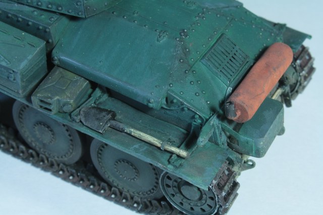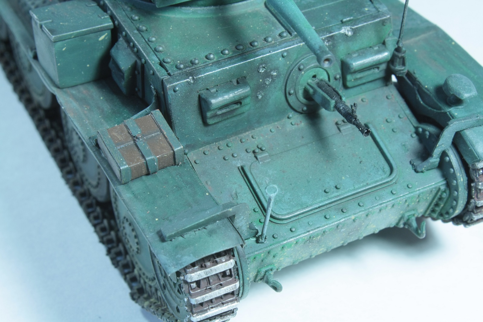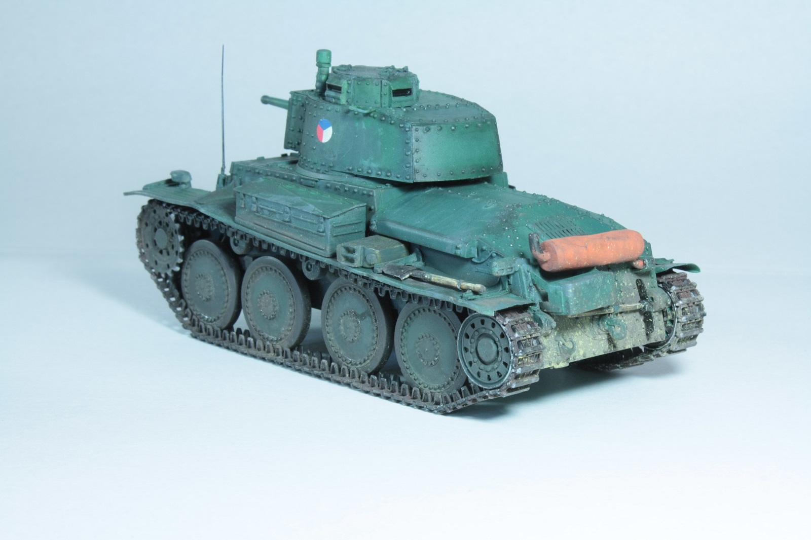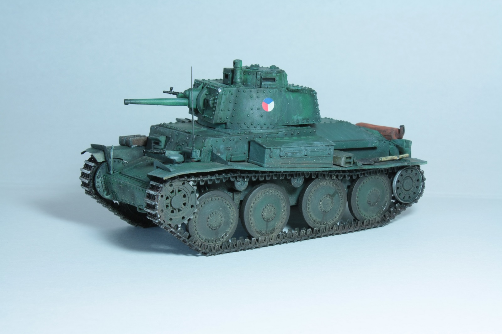 С фарой Нотек, немецким антенным вводом, конвойным фонарем (слабо похож и стекла неокрашены, но всё же), ящиком с гранатометами, домкрат тоже вроде немецкий (пятка куда-то потерялась). Что-то не сходится))) Наверное это все-таки уже Pz.Kpfw.38(t).