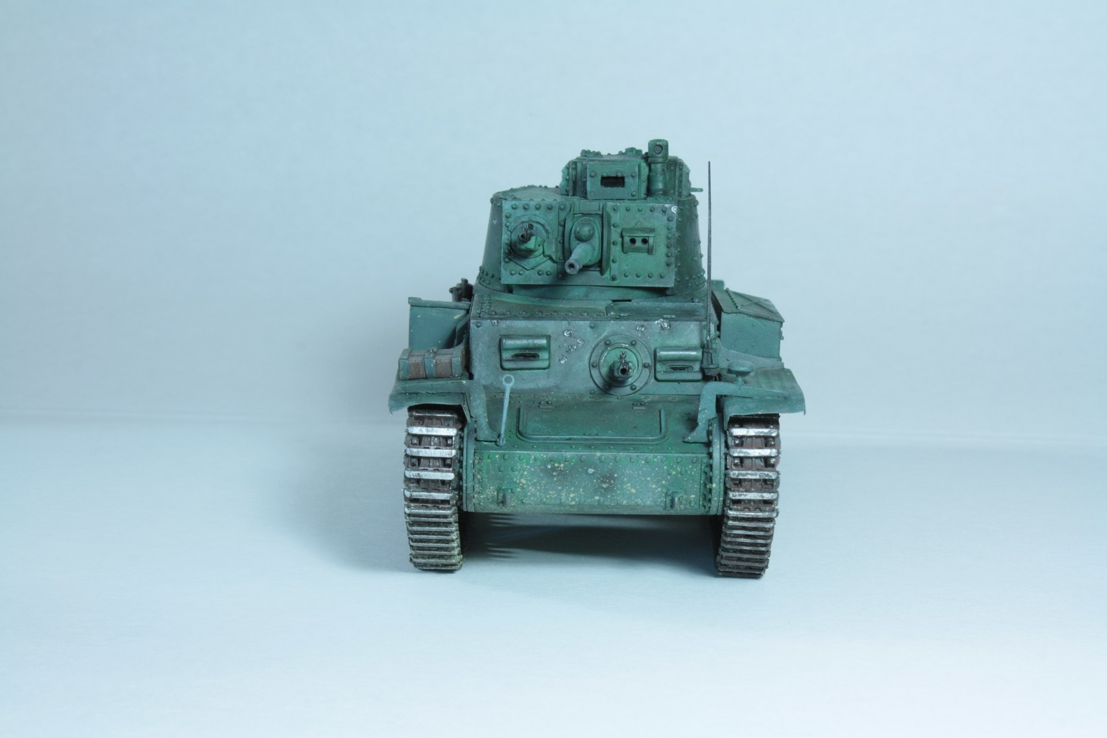 В общем, смесь черно зеленого, темно зеленого и какого то светлого оттенка. Попытка окрасить в необычный цвет, ибо оригинально чешский же танк.