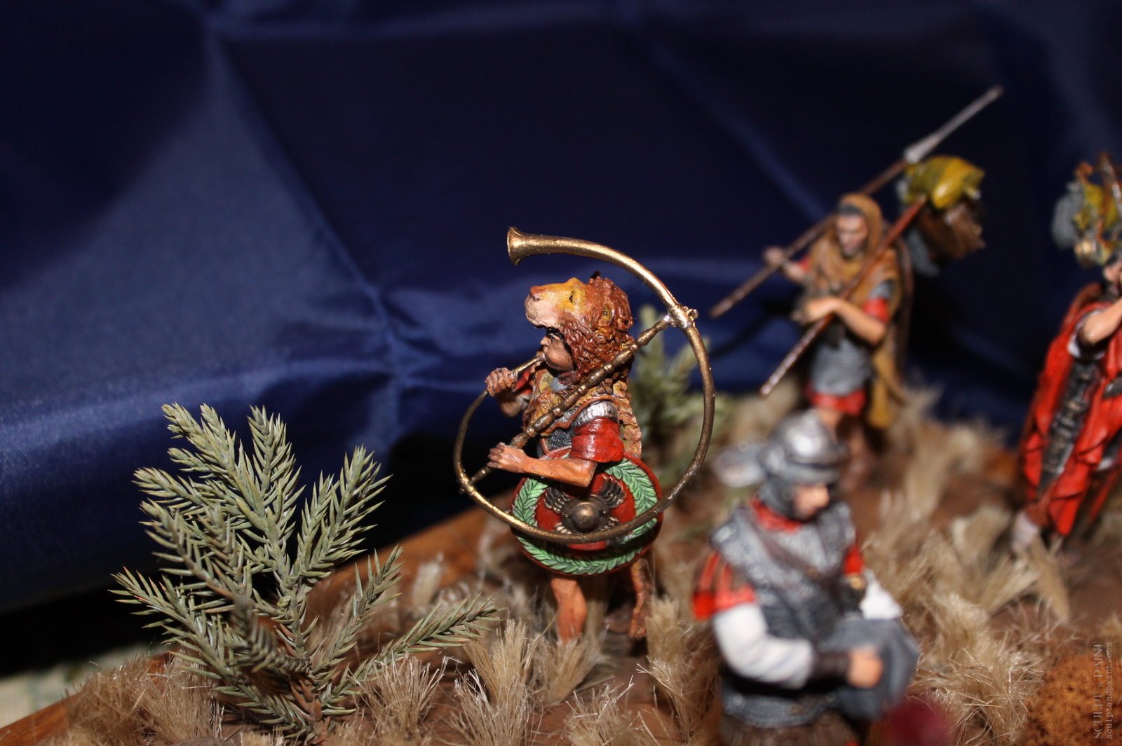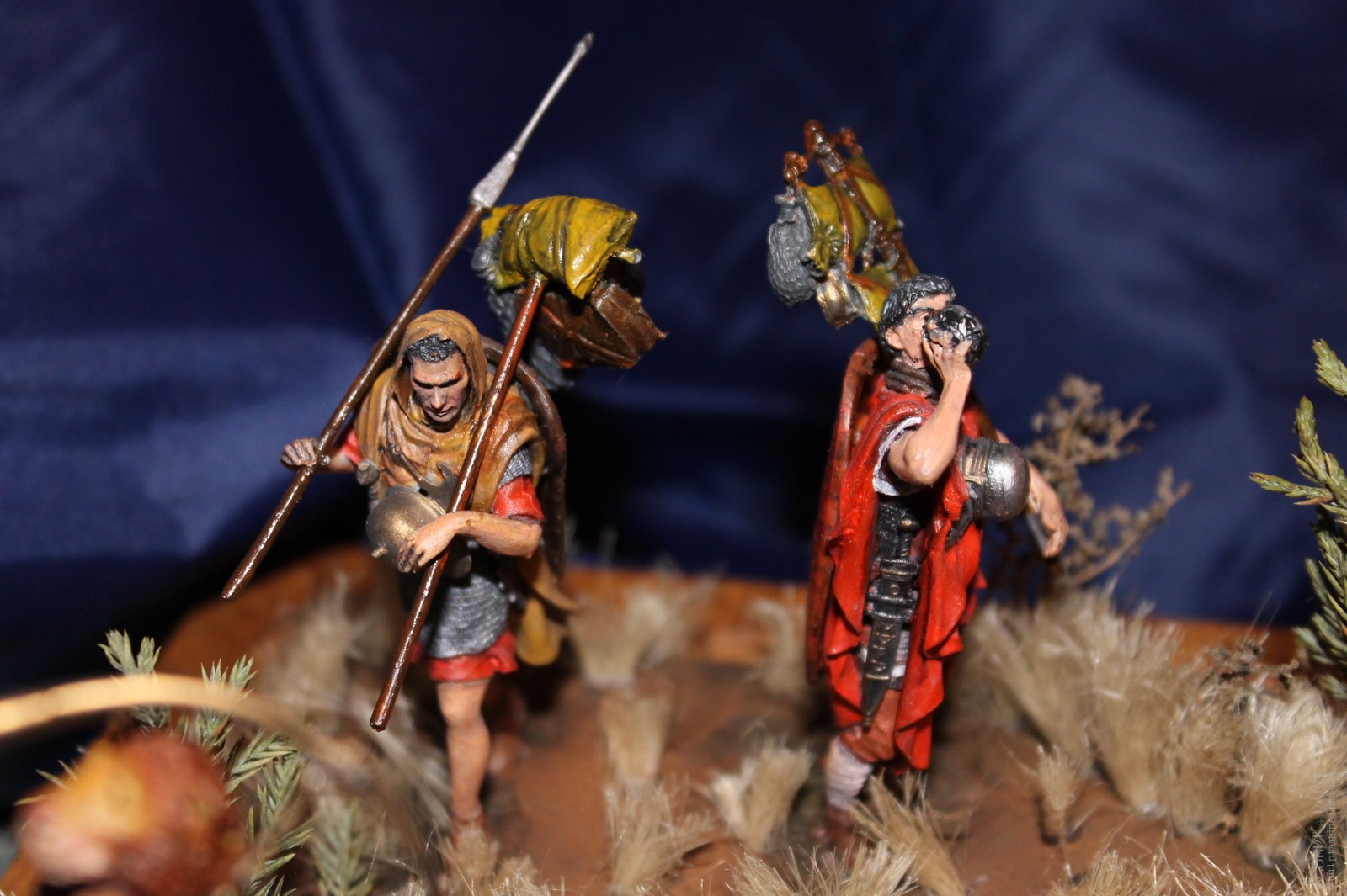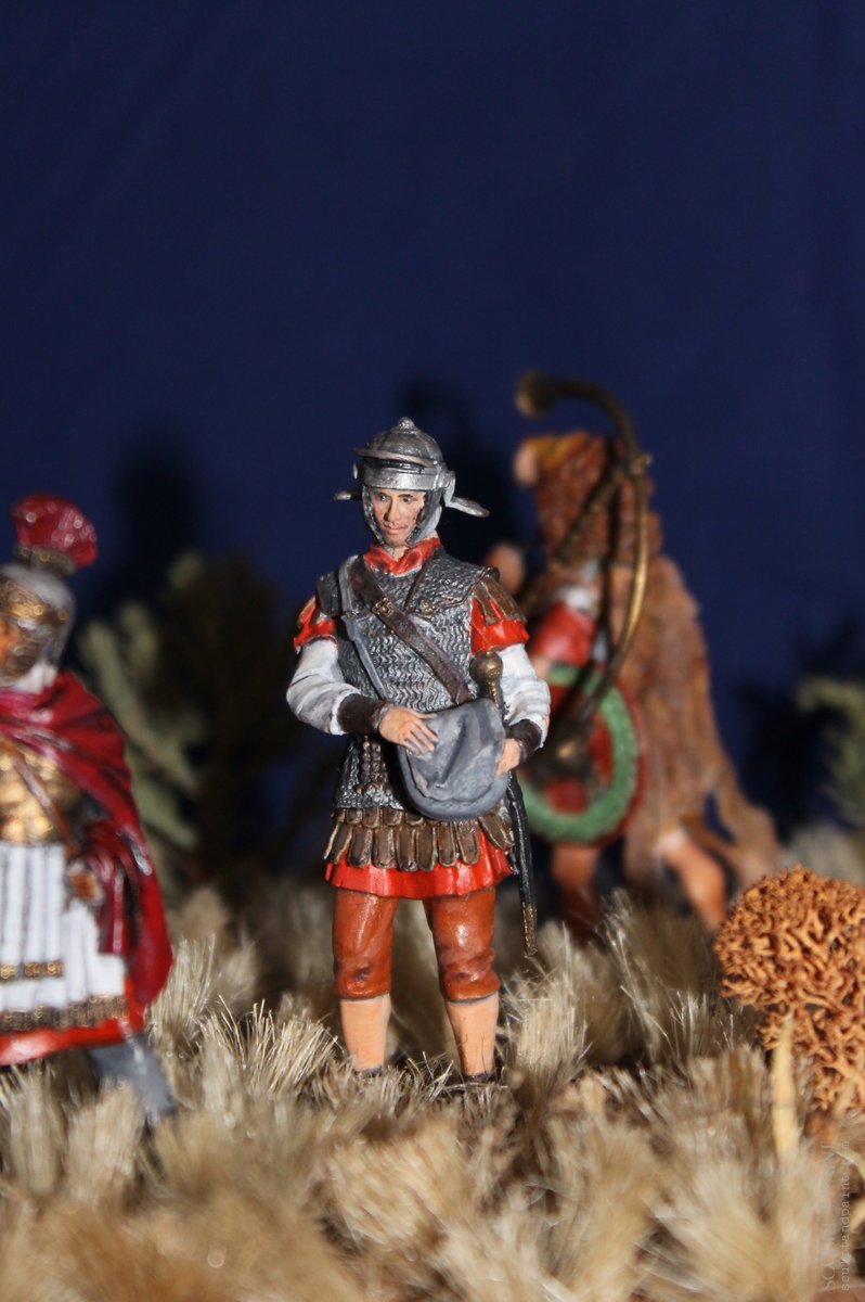 Римский легион в походе периода дакийских войн Домициана и Трояна, робота окрашена акрилом и маслом, подставка салоны самодел, трава сантехнический льон. Размер фирурок 60мм.)