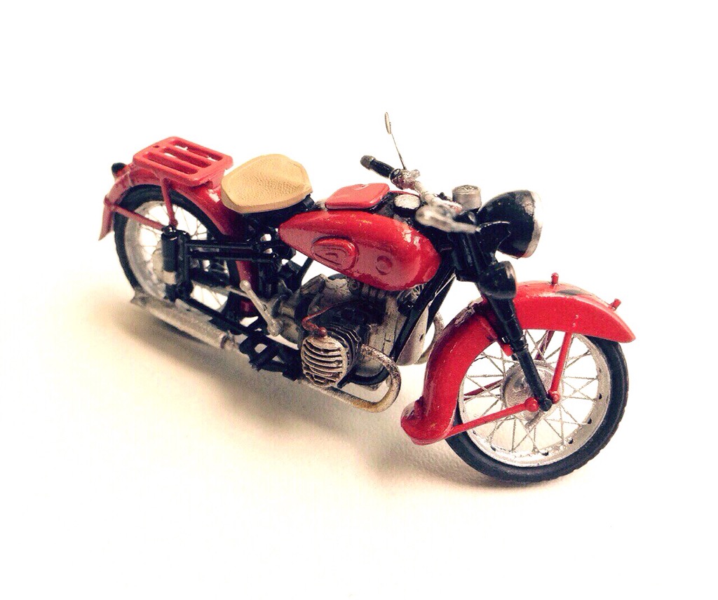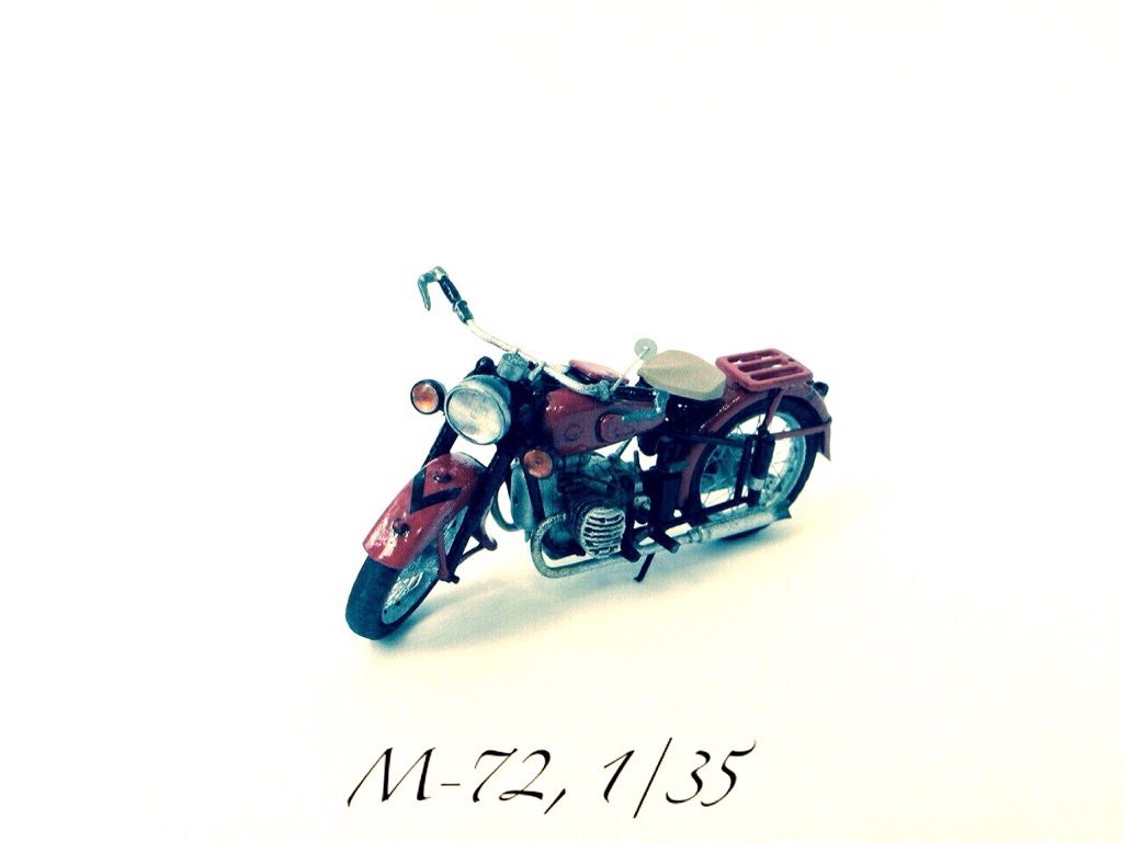 Модель М-72 от Звезды, сделанная на гражданский вариант. Добавлены несколько мелочей, таких как свет, свечные провода, боковое зеркало, спидометр. Заменены были спицы на травление. Прототип отсутствует, лепил с головы. Приятного просмотра.
