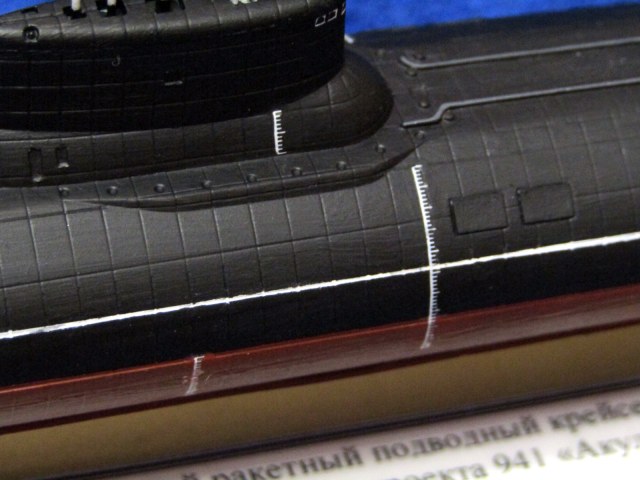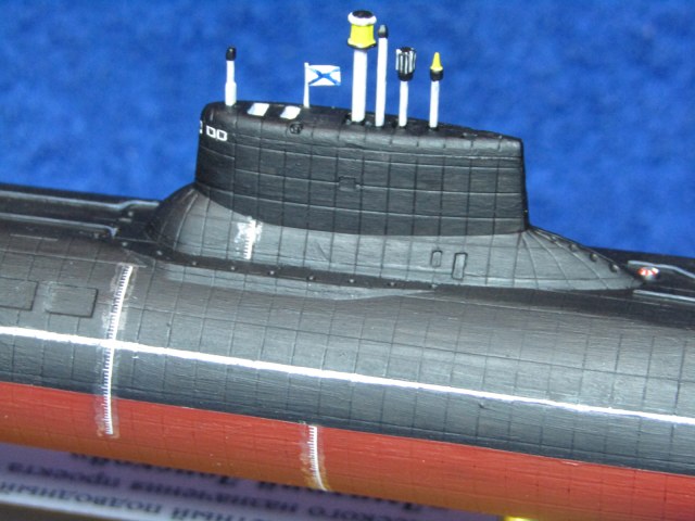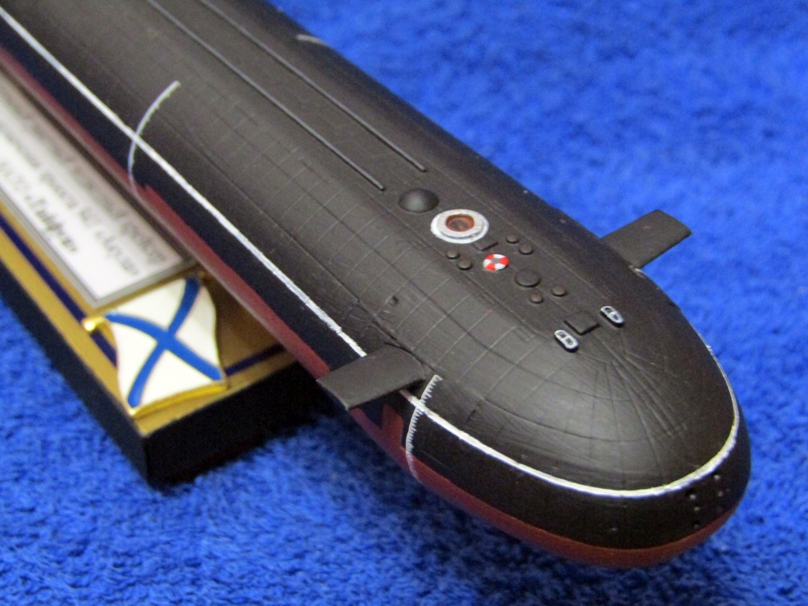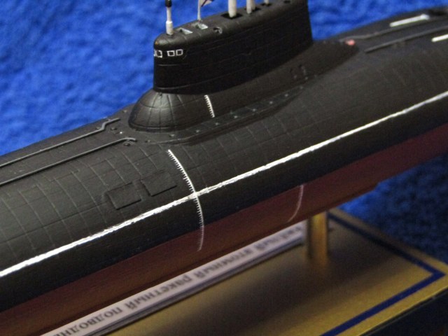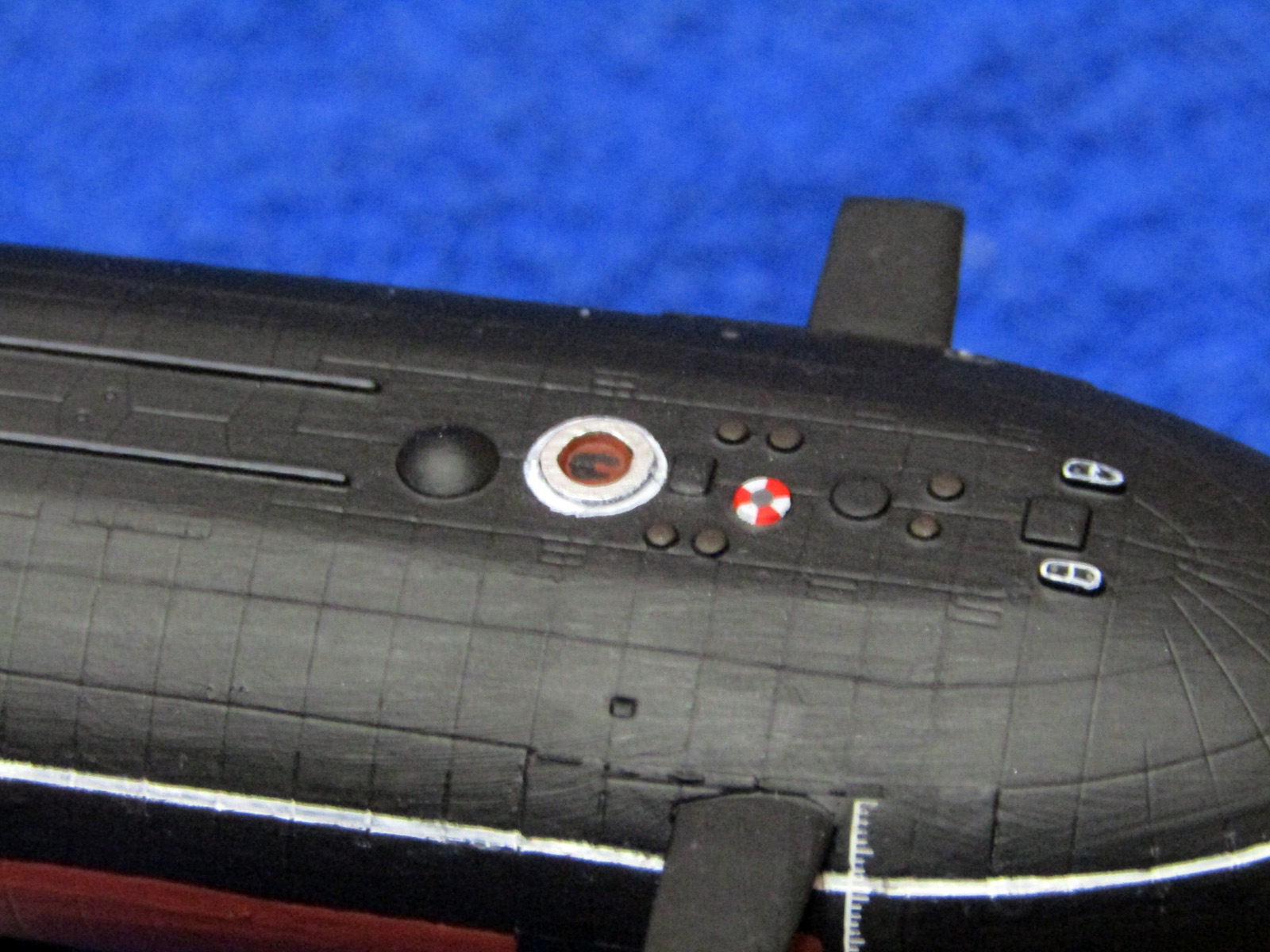 Видны следы окраски кистью. Вокруг аварийных люков в носу и в корме располагается комингс-площадка из полированного металла, а вот вокруг нее уже белая окантовка. У "Дмитрия Донского" корма лодки округлой формы - вечером выложу фото. Форма кормового оперения лодки неверна в принципе (производитель скосячил). Не высверлены каналы выпуска гибки антенн на кормовом оперении (это выступающие прутки). Отсутствуют скуловые кили на подводной части. Не понял что за полукруглый выступ за носовым аварийным люком. Бортовые аппарели (квадратные углубления по бортам перед рубкой) следовало тонким пластиком выровнять заподлицо с корпусом - на прототипе они не утоплены. Ну а про декали вы и сами отметили. Чтобы исключить серебрение декалей, их необходимо наносить на глянцевую поверхность.