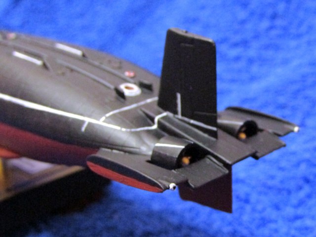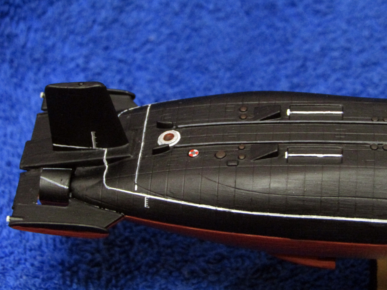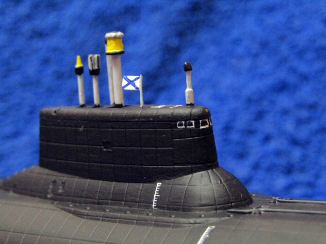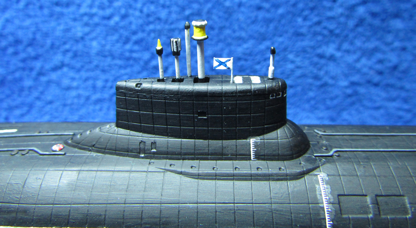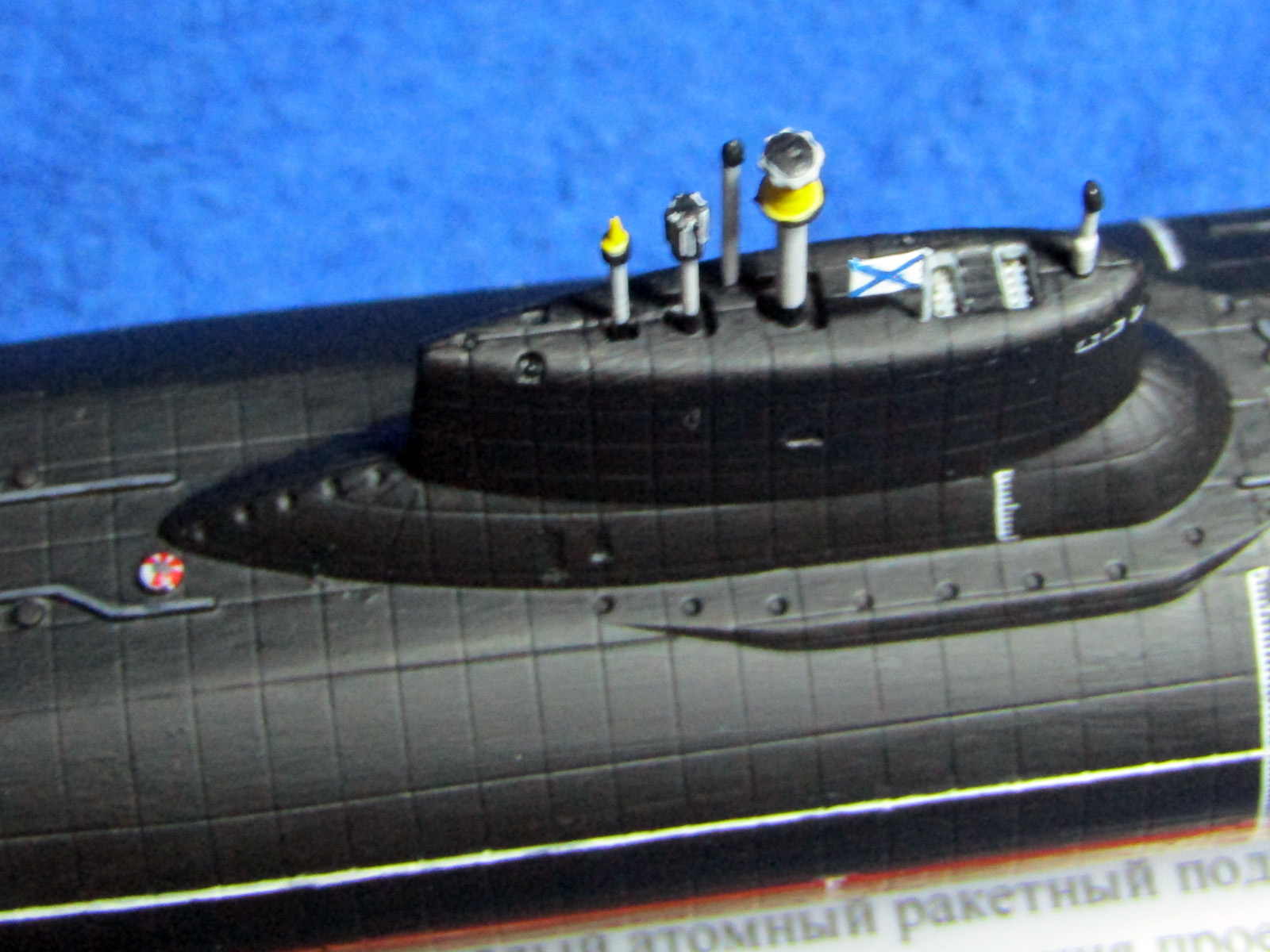 Видны следы окраски кистью. Вокруг аварийных люков в носу и в корме располагается комингс-площадка из полированного металла, а вот вокруг нее уже белая окантовка. У "Дмитрия Донского" корма лодки округлой формы - вечером выложу фото. Форма кормового оперения лодки неверна в принципе (производитель скосячил). Не высверлены каналы выпуска гибки антенн на кормовом оперении (это выступающие прутки). Отсутствуют скуловые кили на подводной части. Не понял что за полукруглый выступ за носовым аварийным люком. Бортовые аппарели (квадратные углубления по бортам перед рубкой) следовало тонким пластиком выровнять заподлицо с корпусом - на прототипе они не утоплены. Ну а про декали вы и сами отметили. Чтобы исключить серебрение декалей, их необходимо наносить на глянцевую поверхность.