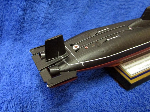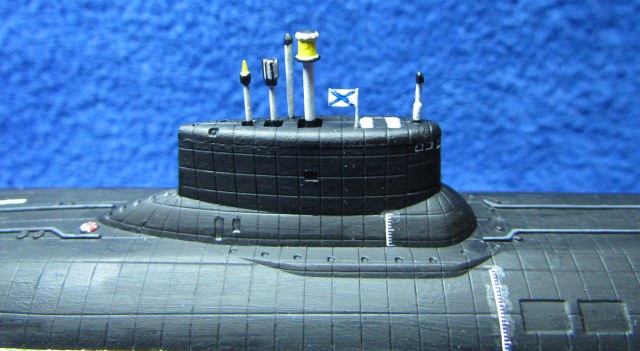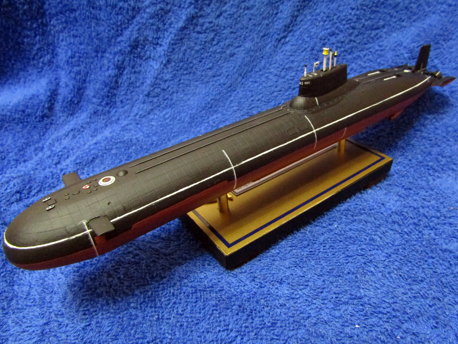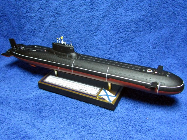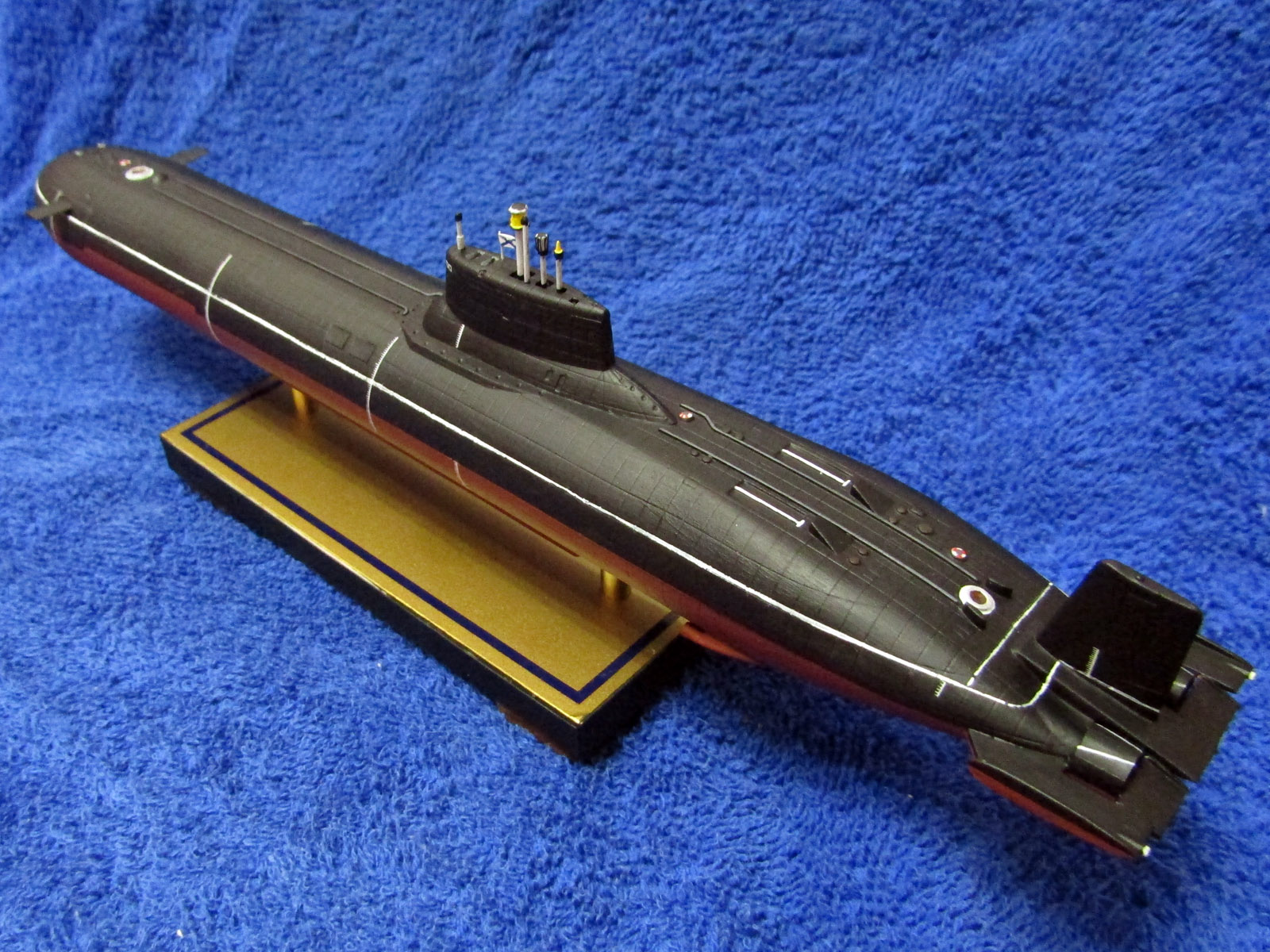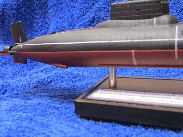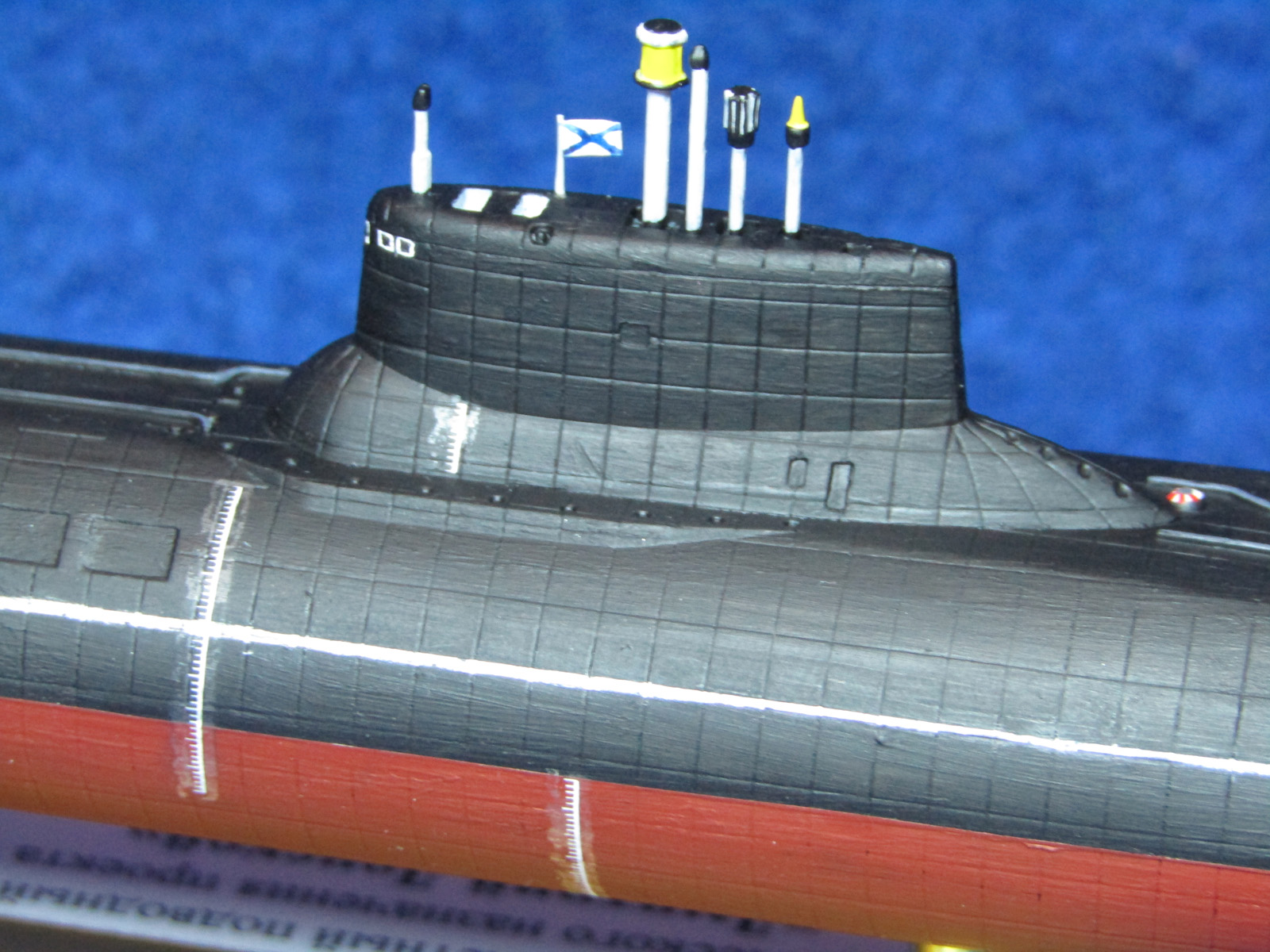 Ну вот, поборов свое самолюбие и прислушавшись к Вашим советам и замечаниям, я решился и чуть подкорректировал данную модель. Подлодку в 700-м масштабе строил впервые. Качество деталей хорошее, никакого облоя, утяжин и всякой подобной гадости нет. Из дополнений: Андреевский флаг на рубке, высверлил каналы выпуска гибки антенн на кормовом оперении (выступающие прутки), изготовил скуловые кили, бортовые аппарели (квадратные углубления по бортам перед рубкой) выровнял почти заподлицо с корпусом, изготовил с нуля подставку. Ватерлиния покрашена вручную при помощи клейкой ленточки, которая выступила в роли маски. Верх корпуса красил черной темперой, низ эмалью от revell. Вся модель покрывалась матовым лаком от того-же revell. Изначально нанес декали на матовую поверхность, из-за чего получил эффект их "серебрения", но потом исправил (серебренные участки покрыл краской в цвет с корпусом). Покраска корпуса конечно оставляет желать лучшего так как я пользуюсь только кистью. Весь корпус вторым слоем покрыл матовым лаком дабы приглушить неровности покраски. По матчасти конечно-же не все косяки устранил (загадочная выпуклость за спасательным люком, хвостовое оперение и т.д.) так как побоялся испортить "товарный вид" модели. Как и обещал выкладываю новые фотки, а также часть старых для сравнения. Приятного просмотра...