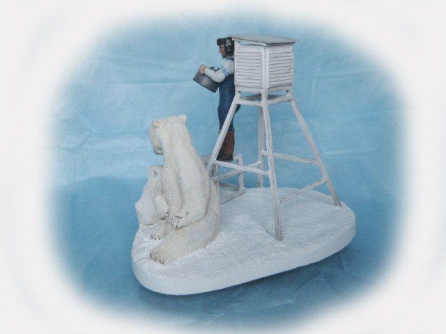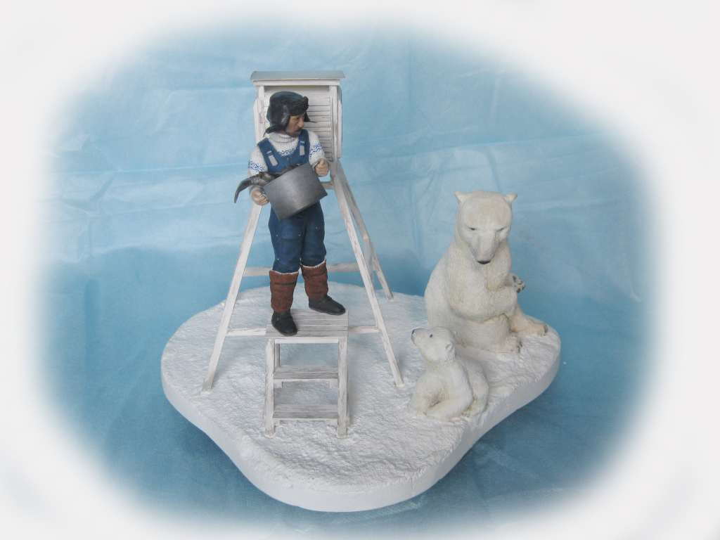 Работа конечно великолепна, но сюжет... Обратите внимание на медведицу. Она явно учит Умкы(у) охотится, - выжидает, типа, давай Умкы(а), фас на дядю... Другой момент - по имени "Умкы". Возможно сам полярник произносит так имя медвежонка в силу своего происхождения из бывших южных республик бывшего Советского Союза..., все возможно, но реально только одно - дяде с кастрюлей стопудово пришел белый полярный лисиц.