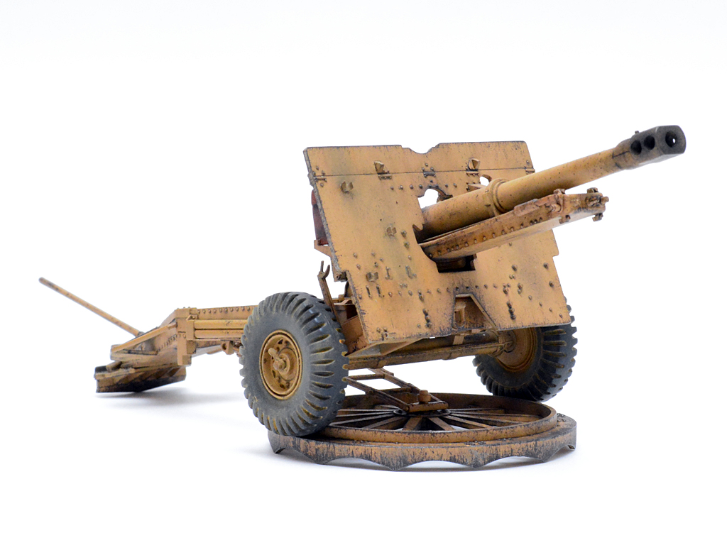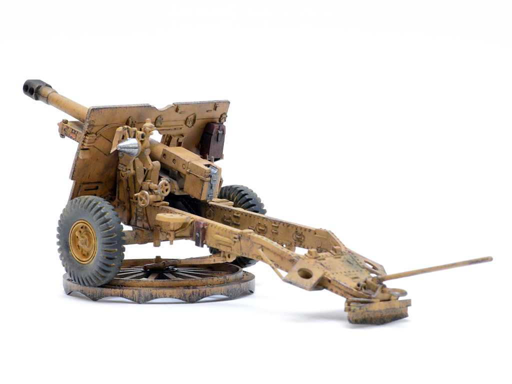 Я пытался сделать крючья на спицах поворотного круга / опорной плиты, но ничего дельного и похожего на оригинал, к сожалению, пока не получилось (уж очень они мелкие). Поэтому на время оставил эти попытки. Поднакоплю опыта, обязательно доработаю, ... ну или соберу новую модель. Благо тягач под нее уже ждет своей очереди на доработку и окраску, так что орудию этому в транспортном положении обязательно быть!