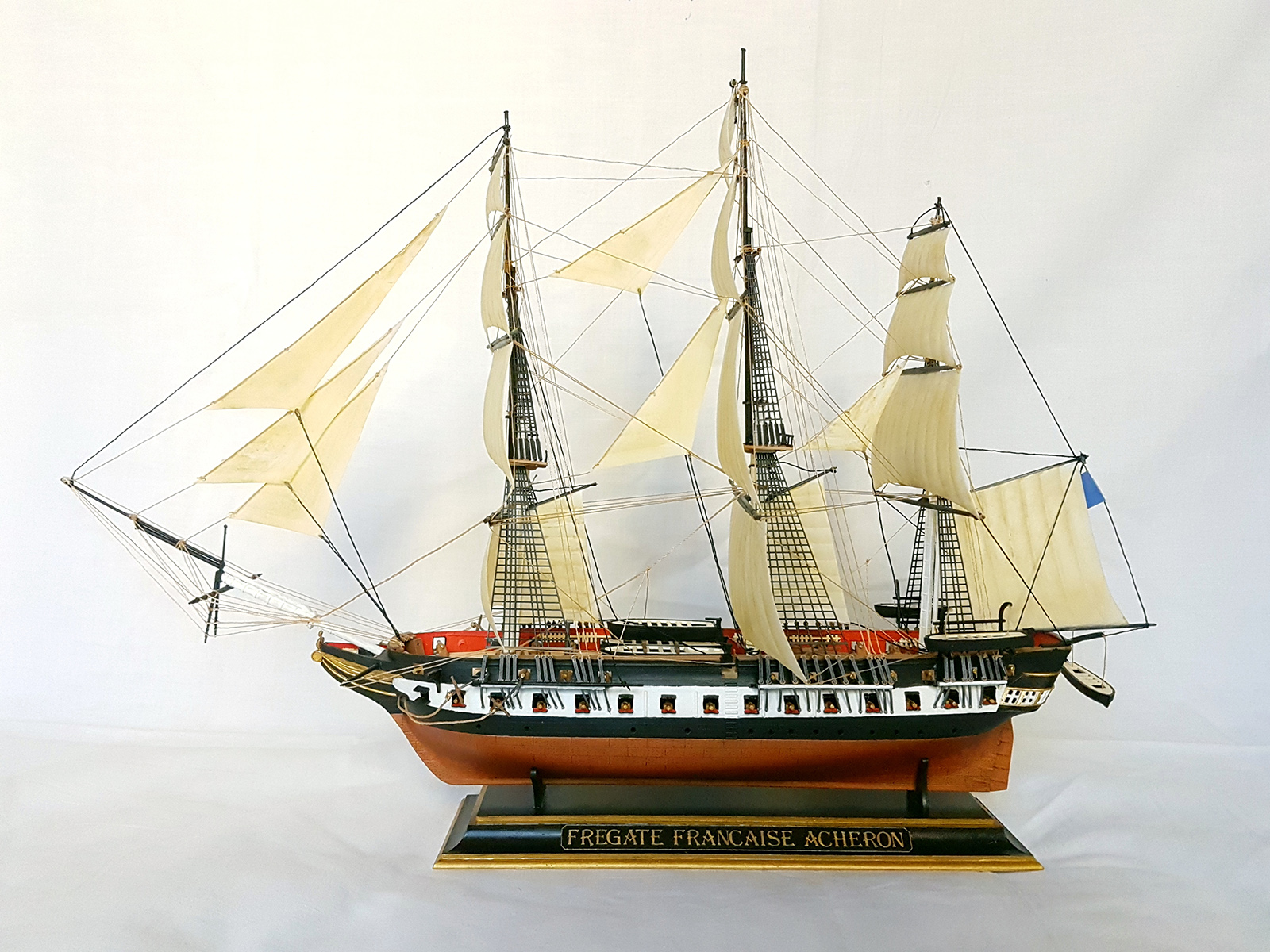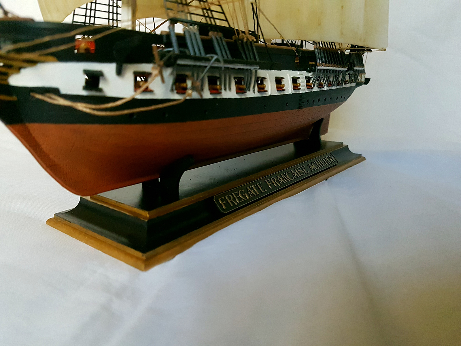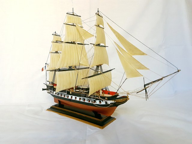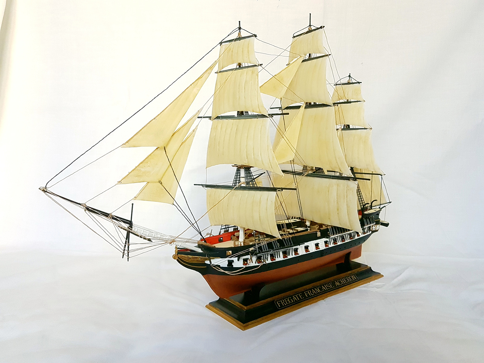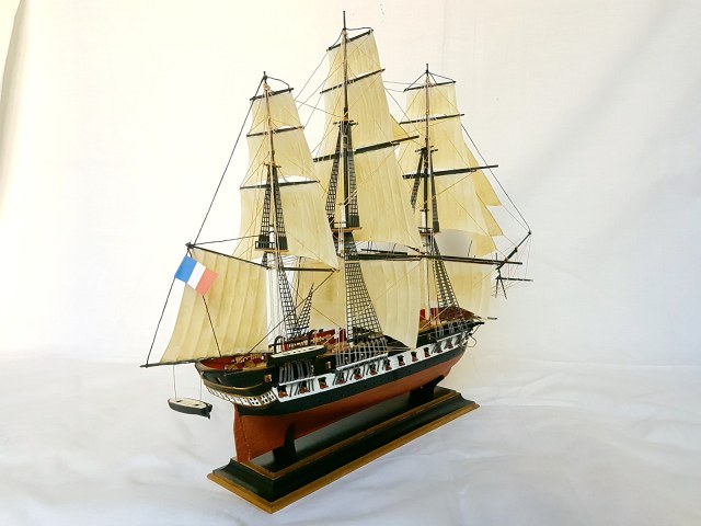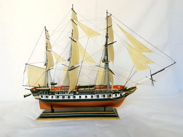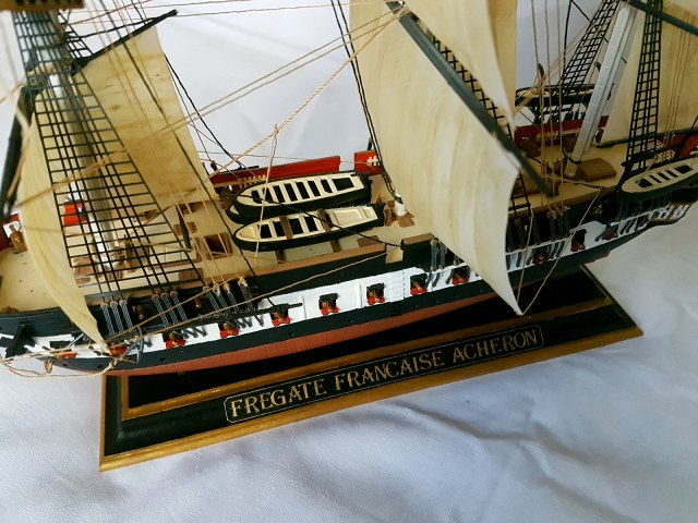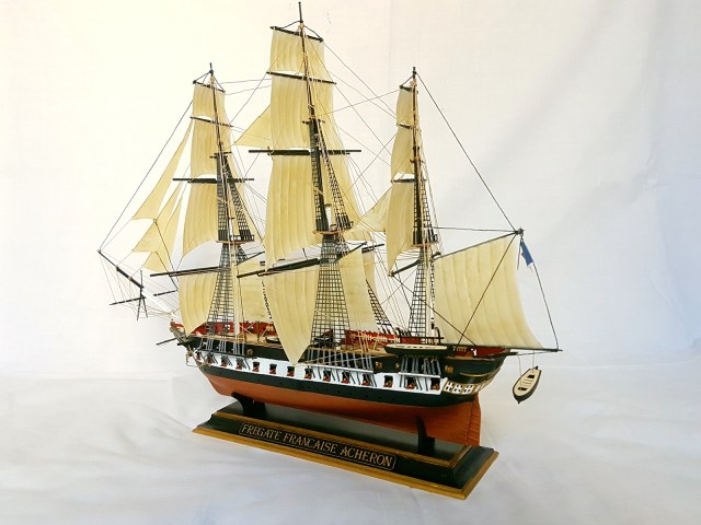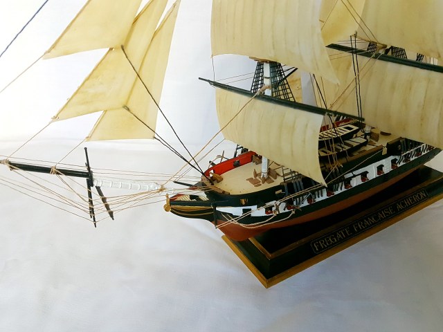 Модель легендарного французского фрегата эпохи наполеоновских войн Ашерон, прославившегося активными действиями против английских китобоев и каботажных судов возле берегов Южной Америки и ставшим настоящим кошмаром для британских моряков. Мощное парусное вооружение делало корабль практически неуловимым для кораблей противника, а бортовой залп орудий фрегата буквально сметал все с палубы вражеских кораблей. Модель легендарного французского фрегата эпохи наполеоновских войн "Ашерон" в наши дни приобрела популярность благодаря фильму «Хозяин морей».