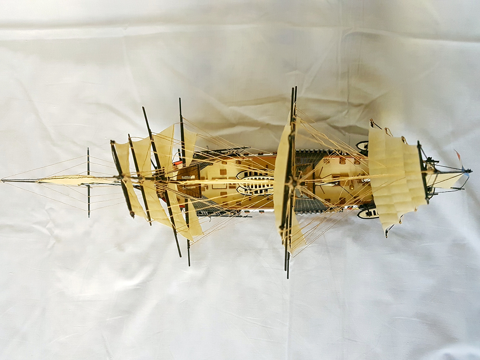 Собирал модель чуть больше года, с достаточно большим перерывом. Паруса пластиковые из набора. Такелаж доработал, т.к. по схеме получился слишком скудным.