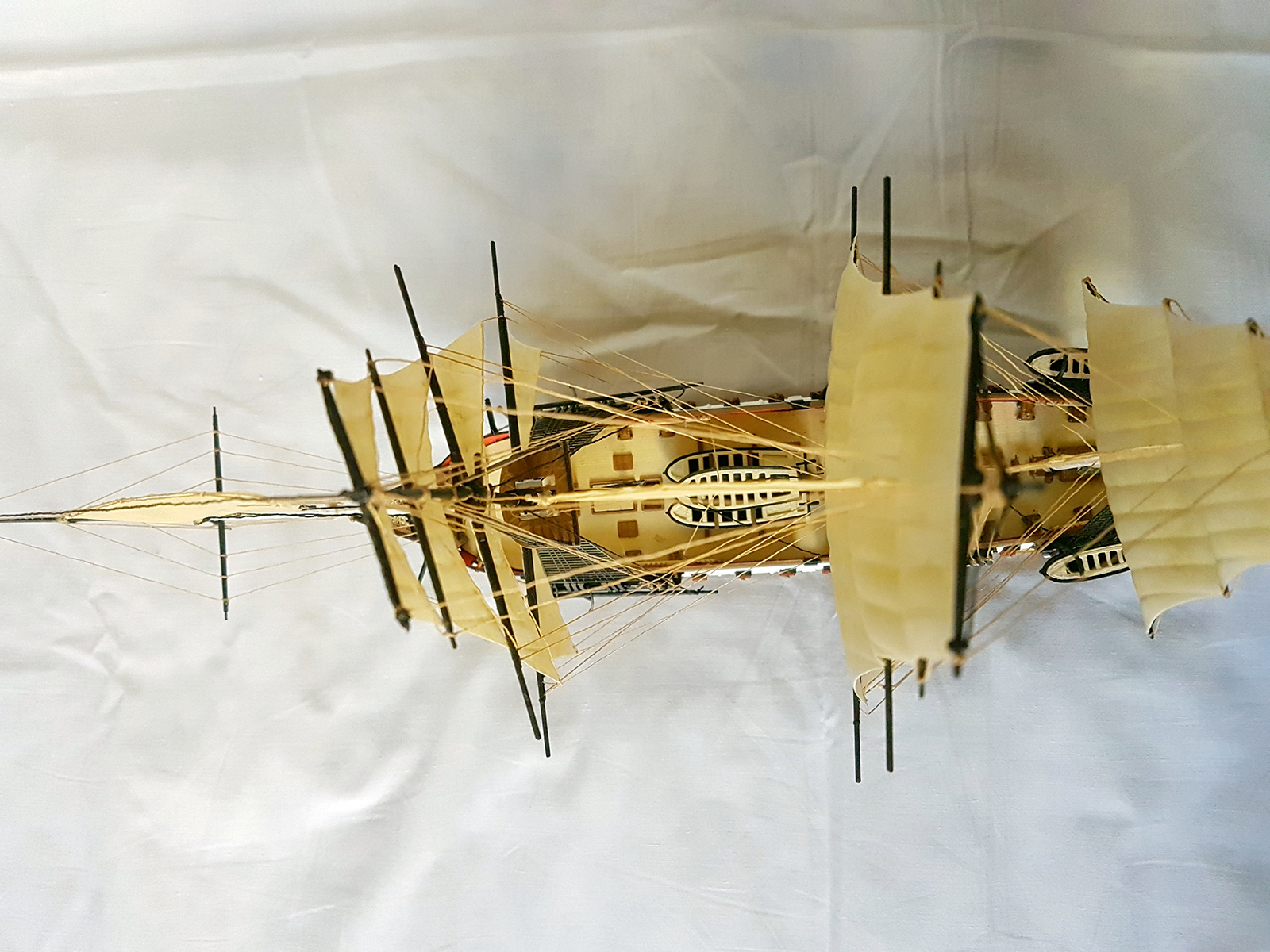 Не будем сильно придираться к начинающему. Пока песочница. Все пластиковые парусники грешат такелажем и "жестяными" парусами. Паруса мне не понравились, не естественные. Реи на фоке почему-то в разных плоскостях и т.д. Да много косячков, но поддержим коллегу. Была бы открыта ветка сборки, то многих огрехов можно было избежать.