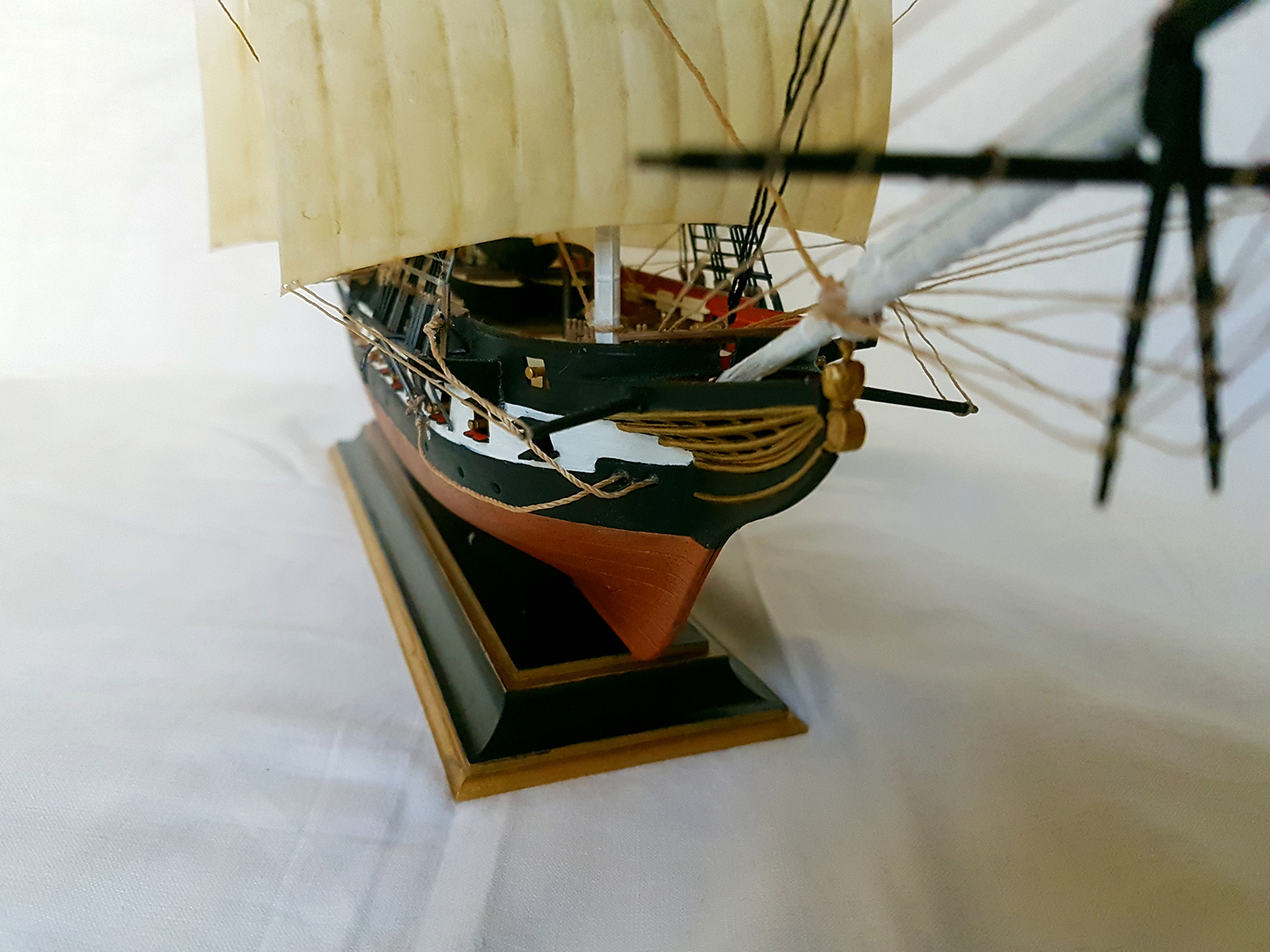 Модель получилось очень даже приятной. Окраска и сборка да, получились весьма аккуратно, рангоут ровный. Однако есть какая-то незавершенность в работе и все по мелочам из которых и складывается образ модели.