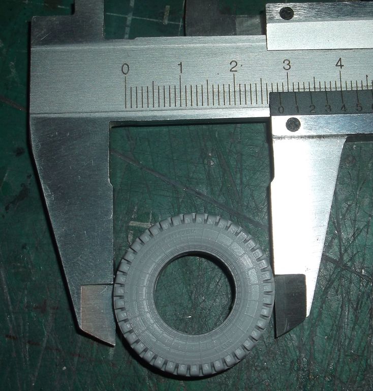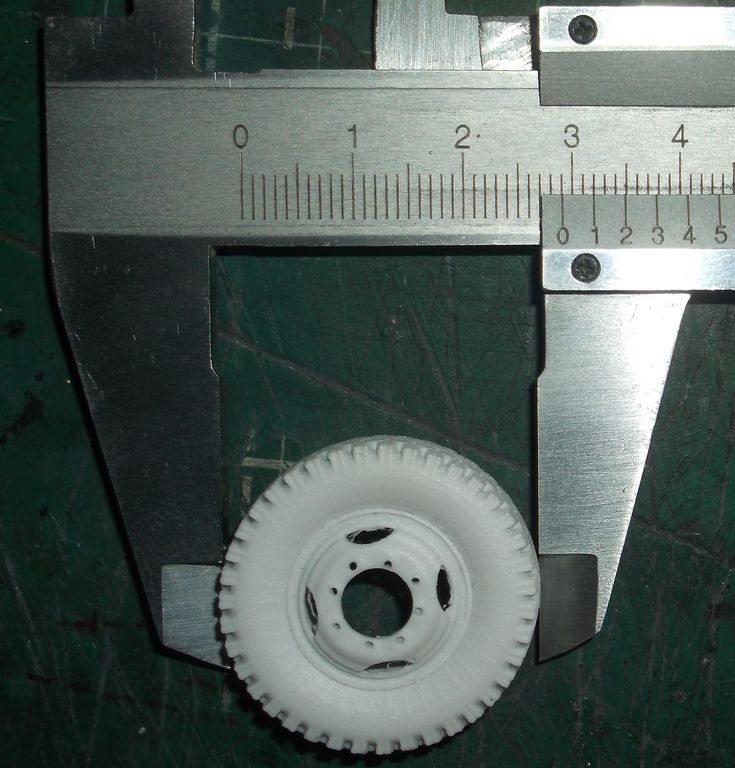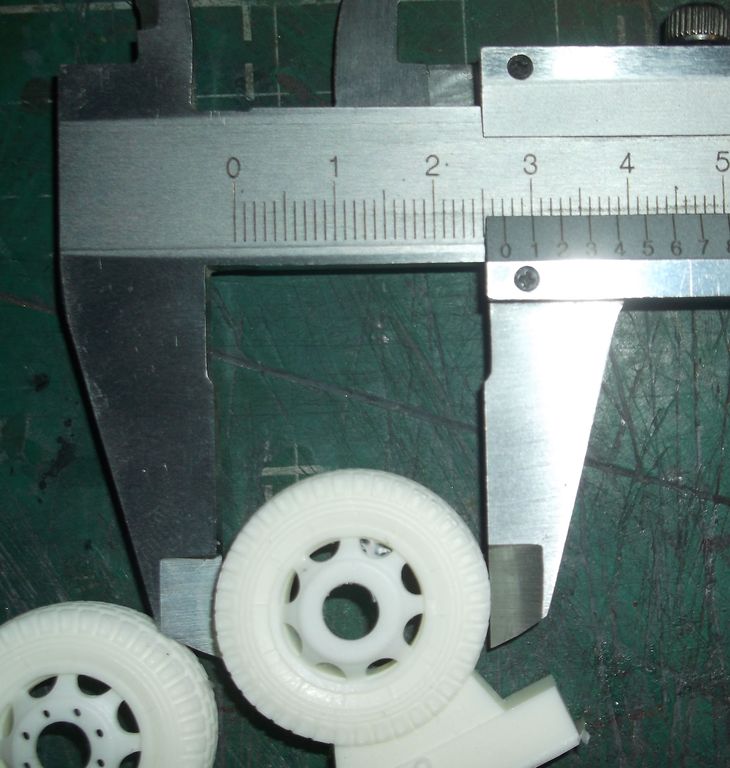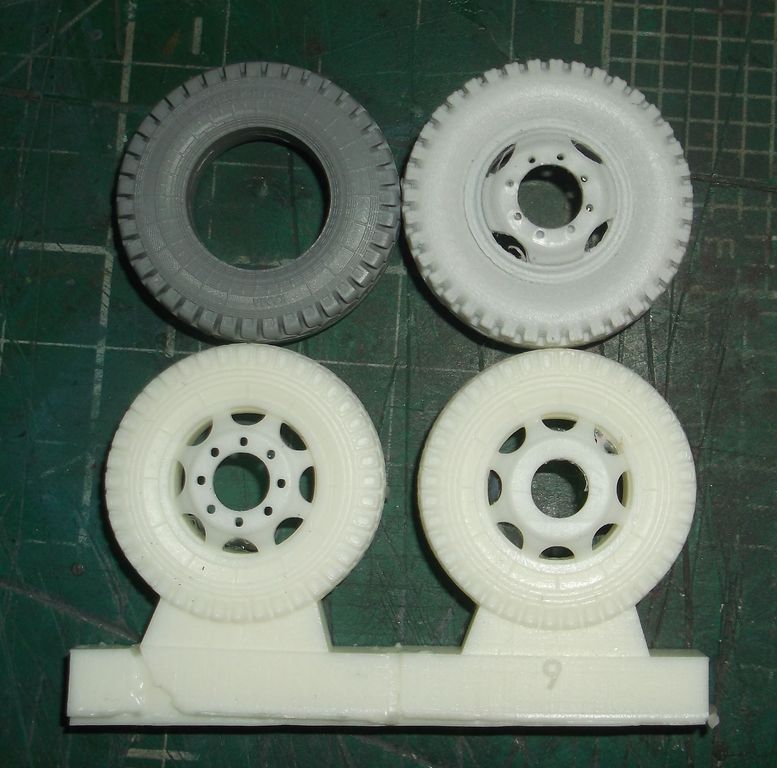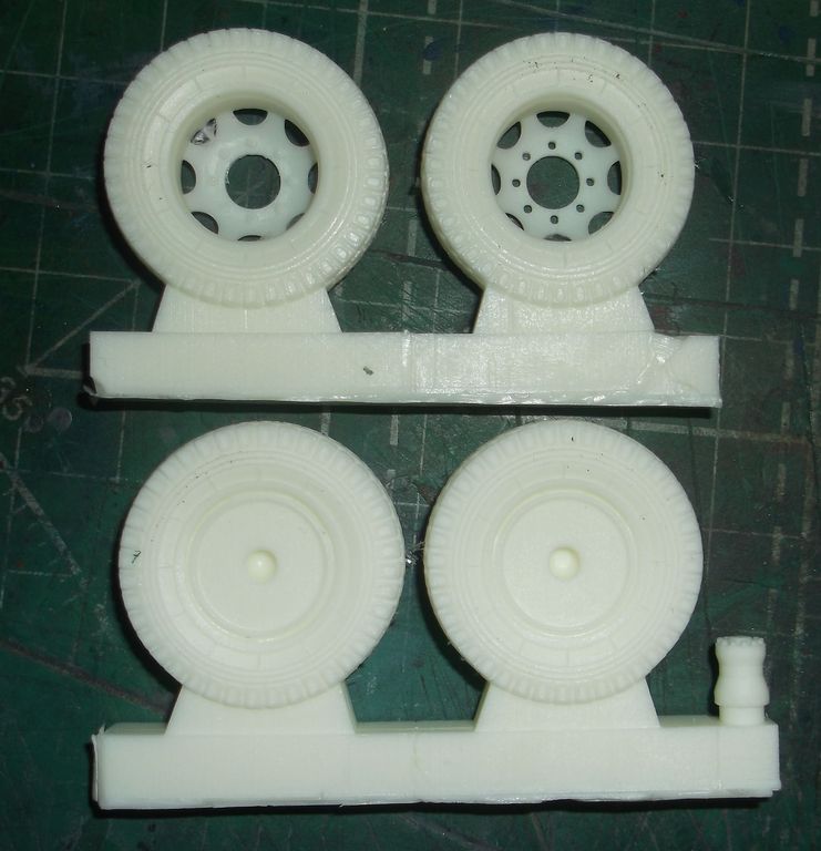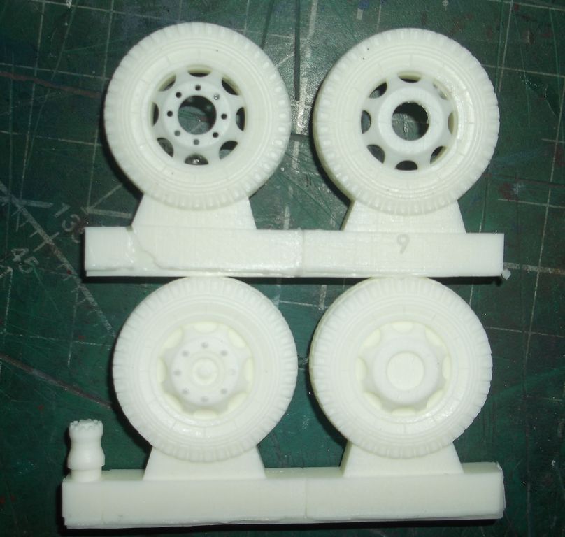 Колёсики аккуратно отлиты без каких-либо дефектов. Особенно понравились гайки на передних колёсах. Ажурные. На задних немного подкачали. Надписей на боковинах нет. При снятии колеса с литника образуется большая "лысина". С этим придётся что-то делать. Наверное аккуратно пропиливать.