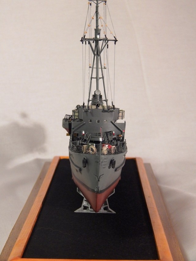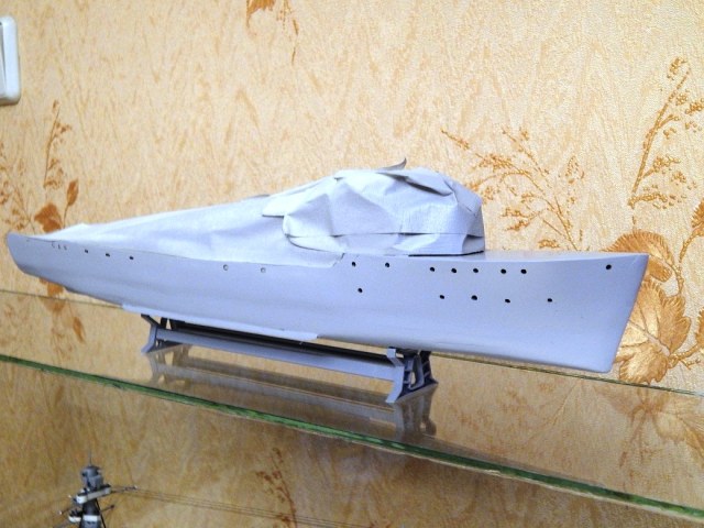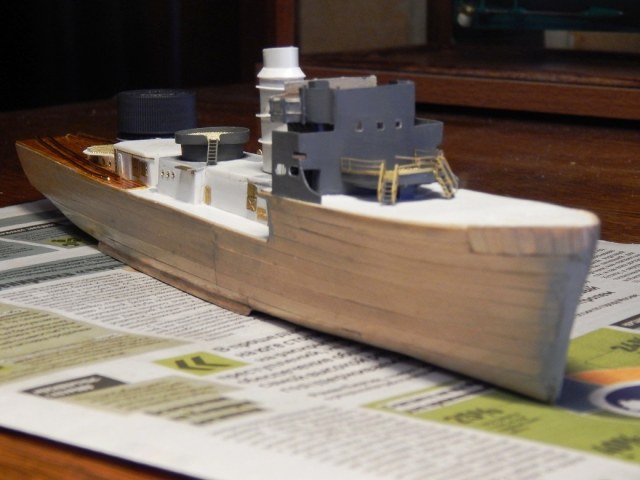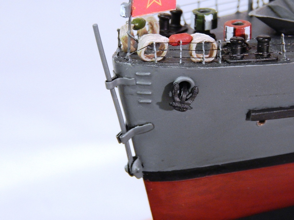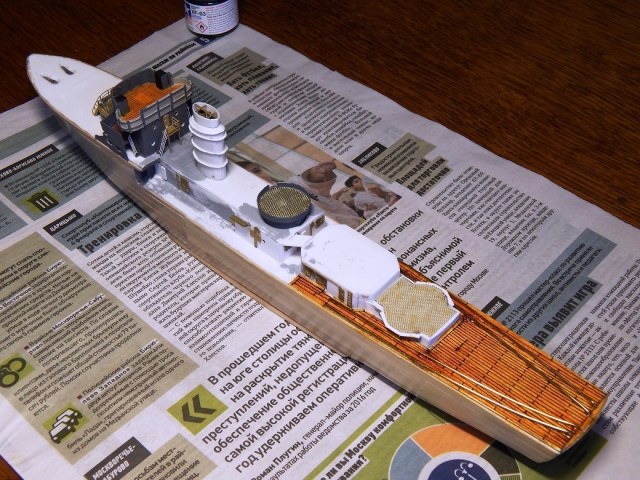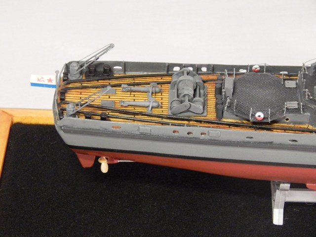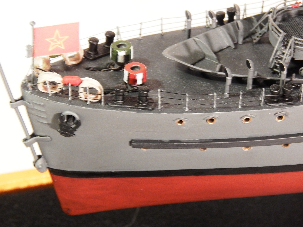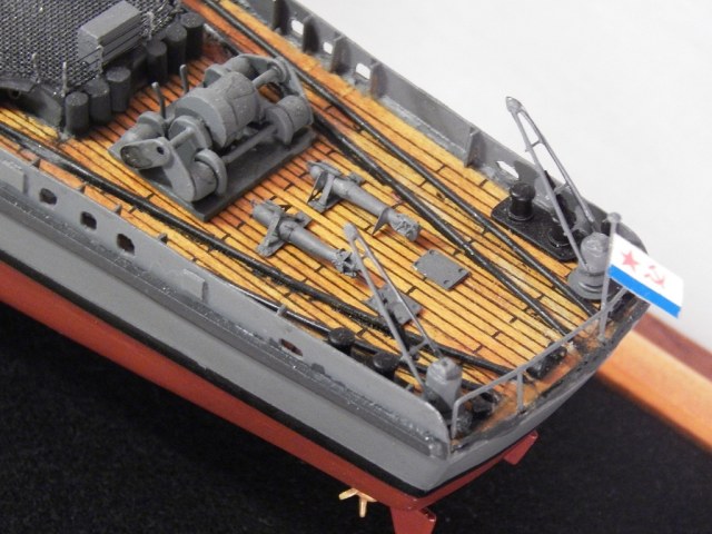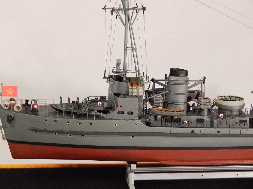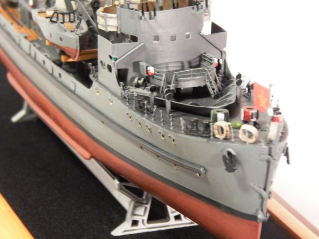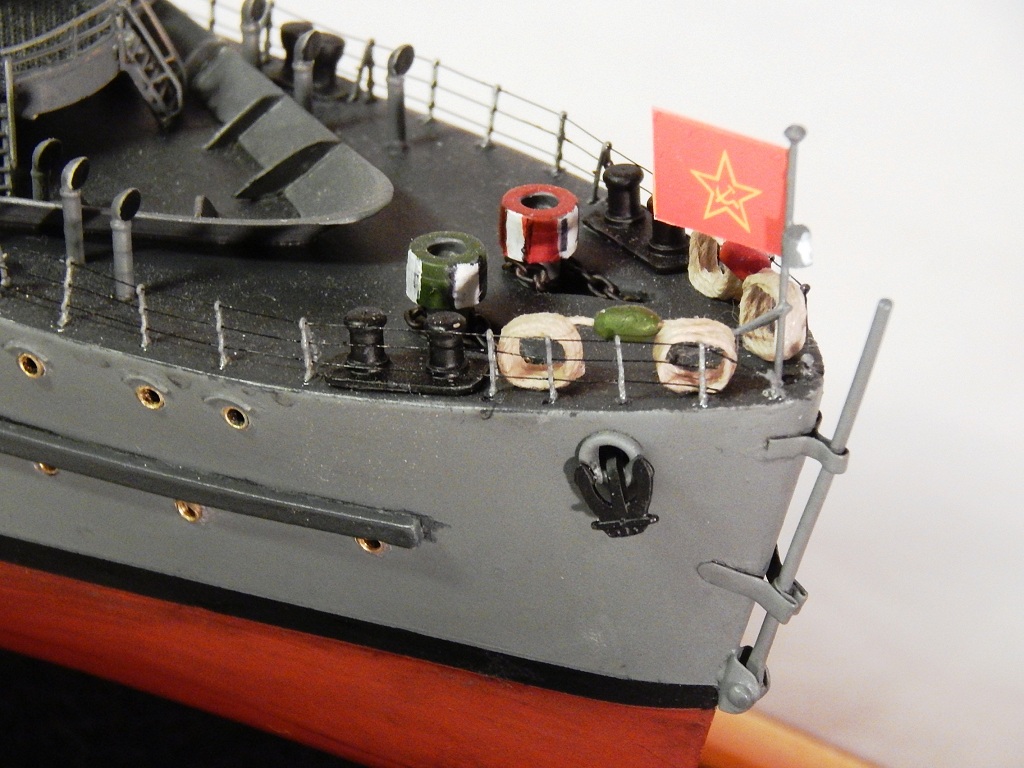Но гюйс ему не полагается,а вот вымпел на гафеле нужен,шток якоря не должен быть гнутым .Не понравились леера,минные рельсы и много чего.Кнехты от "Бисмарка",конечно,в одном масштабе,но это кнехты ЛК,а не ТЩ.Не понравилась покраска. Ведь проще на открашенный корпус и палубу устанавливать покрашенные надстройки. Будет намного аккуратнее . не понимаю стремления моделистов собрать всё на палубу,а потом пыхтеть с покраской. Но корабль КРАСИВ.
