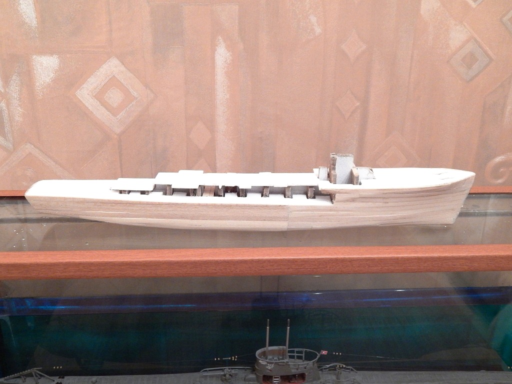 Продольный и поперечный набор выполнен из 3 мм оргалита, далее шпангоуты обклеивались липовыми рейками толщ.1 мм. с дальнейшей шлифовкой. Поскольку 2/3 длины корпуса приходятся на фальш-борт, решил эту проблему наклейкой на длину модели заготовок из модельного пластика т. 0,4 мм по ватер-линию. Далее шпатлёвка, шлифовка, окраска корпуса.