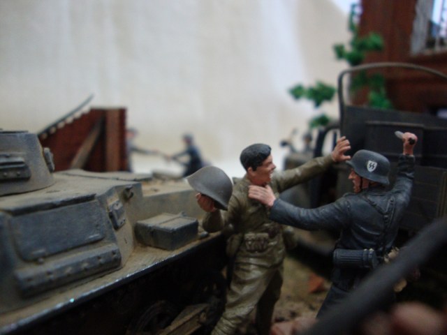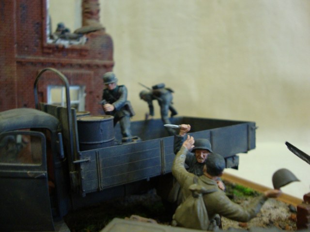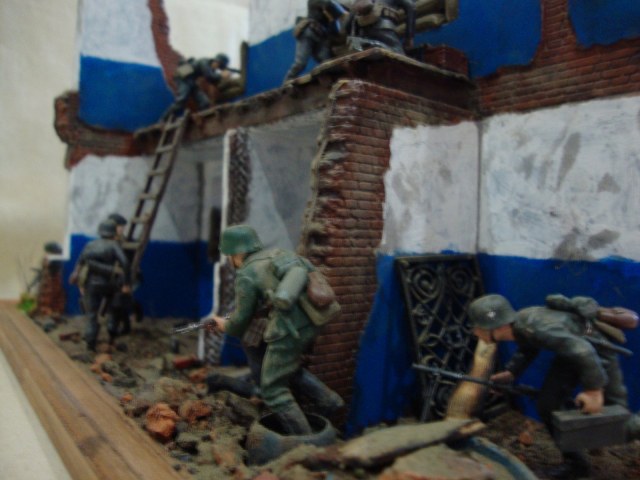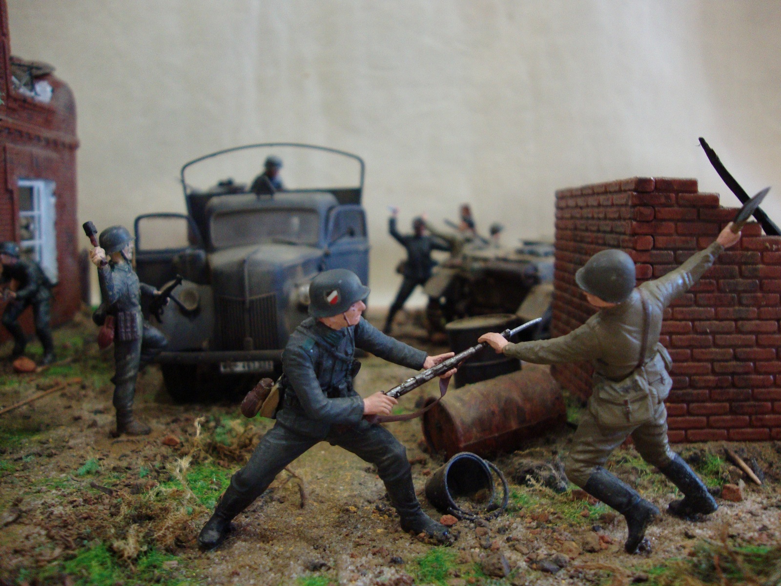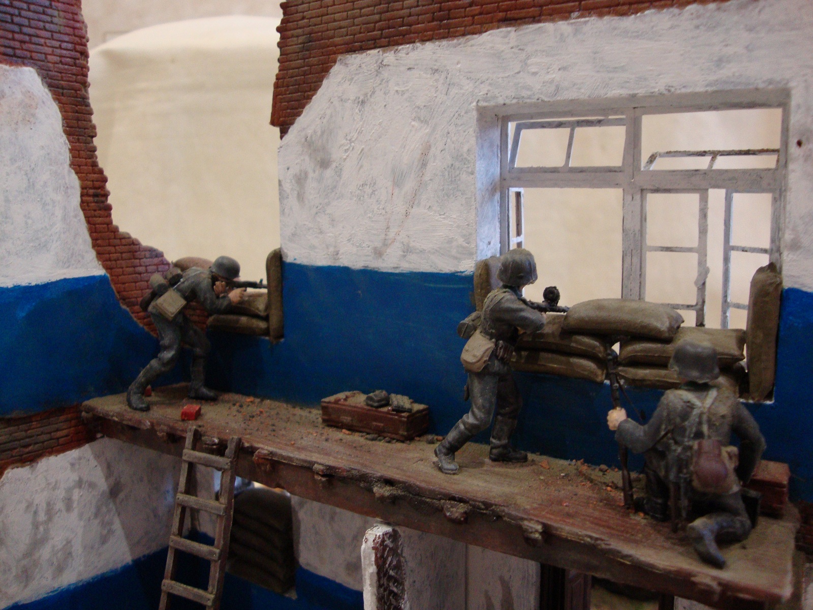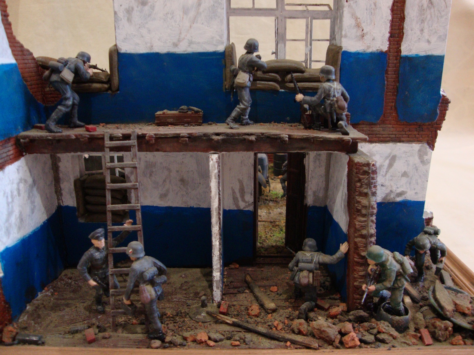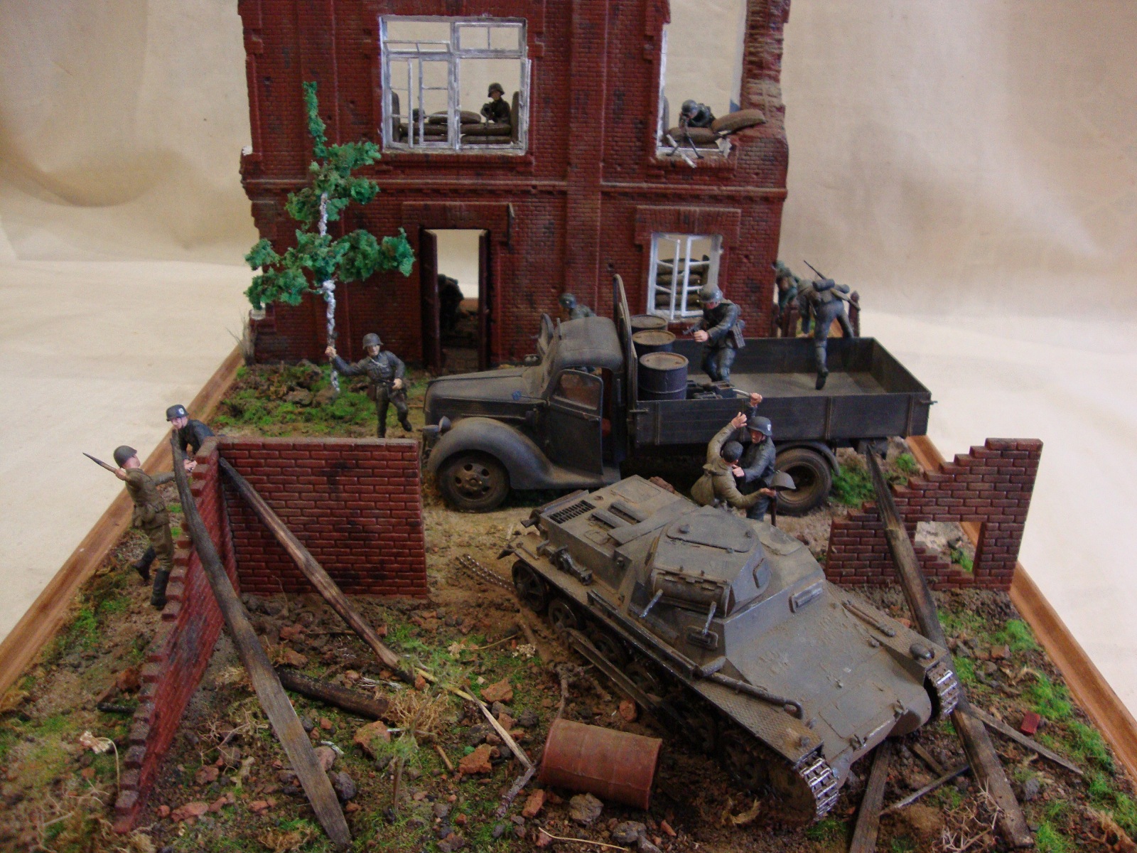 На втором фото ганс собрался бросить берёзу))) Задумка мне понравилась, но ощущается нехватка на переднем фоне обломков от кирпичного строения. Побольше бы разбросанных деталей,стену сделать более разбитой,пару следов от пуль, танк разбивающий стену. Ну вы меня поняли)) С уважением!