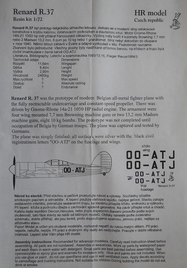 Модель из смолы от фирмы HR Model в масштабе 1/72 (арт.7285) упакована в картонную коробку с боковым открытием. Качество литья среднее, присутствуют незначительные дефекты. Некоторые элементы расшивки ошибочно показаны внутренним кроем. Часть мелких деталей придётся изготовить самостоятельно. Двигатель пролит неудовлетворительно и потребует замены. Cтойки шасси отлиты в двух вариантах на выбор – вместе с колёсами и отдельно. Ваку-фонарь отличного качества. Декали смотрятся неплохо. Инструкция достаточно информативна и наглядна.