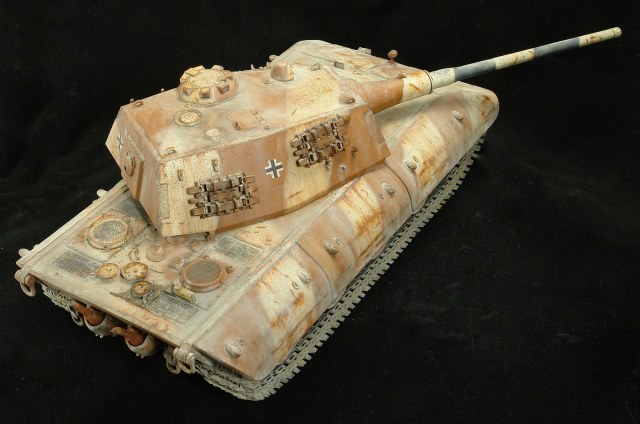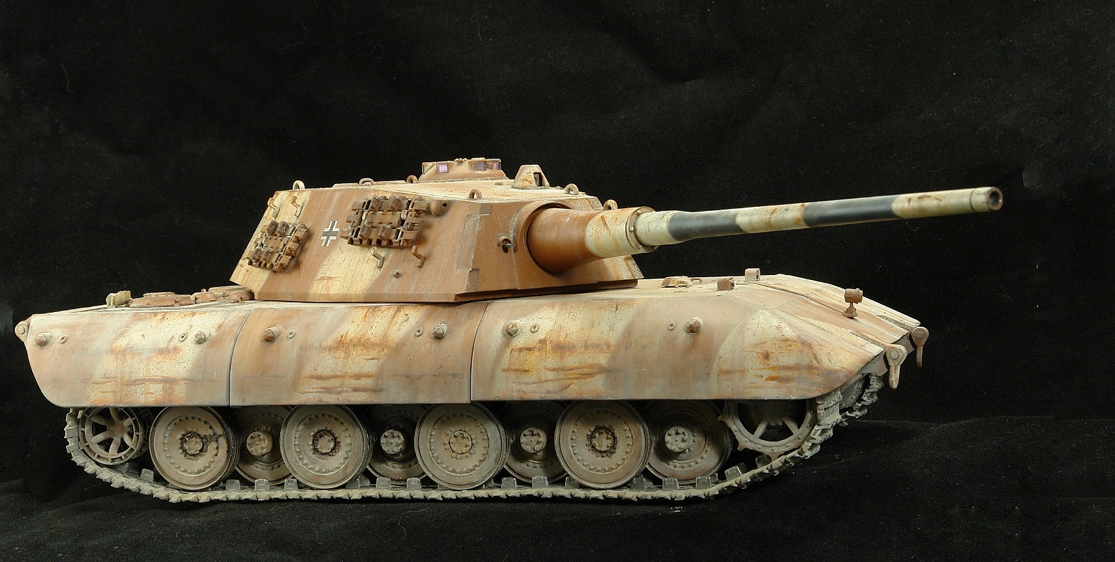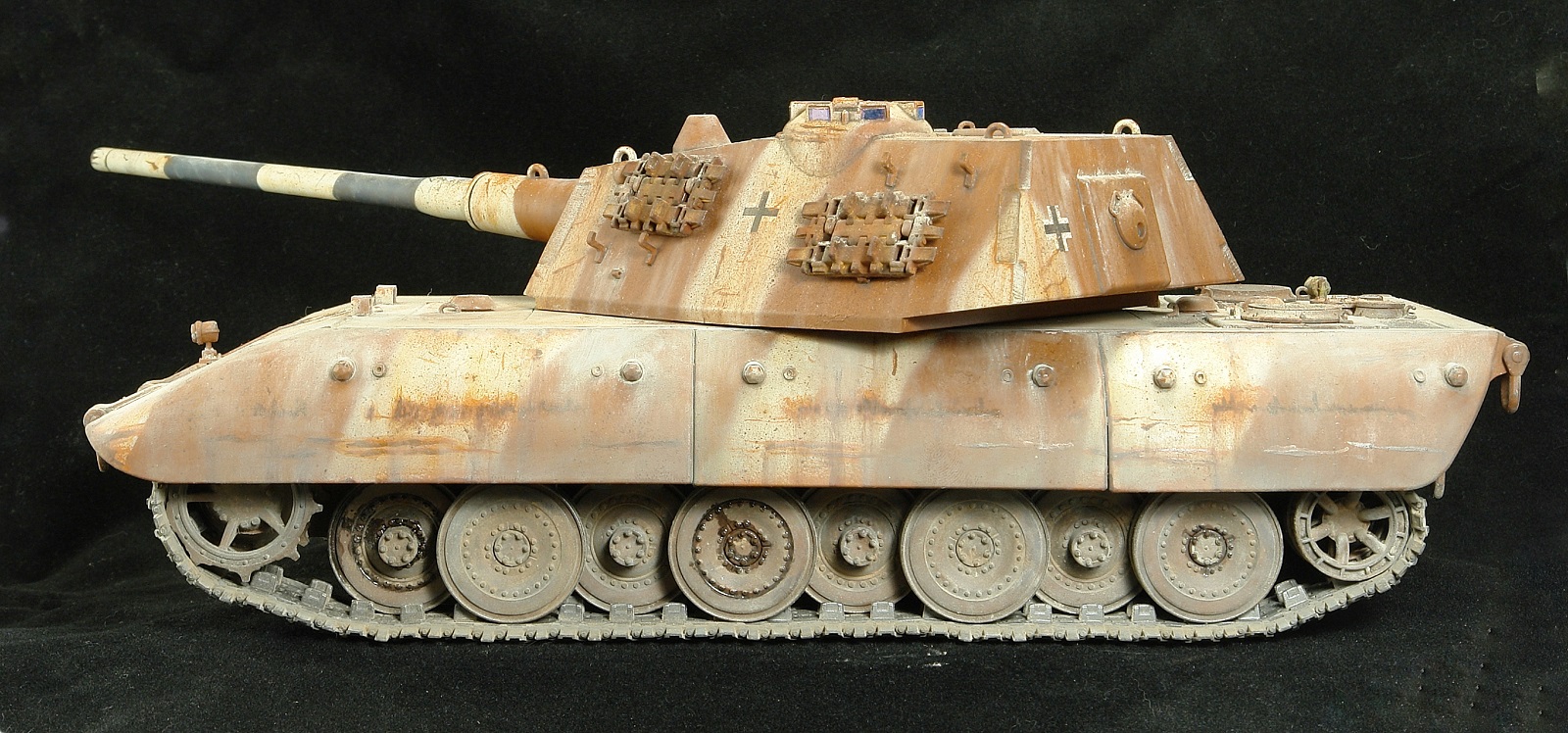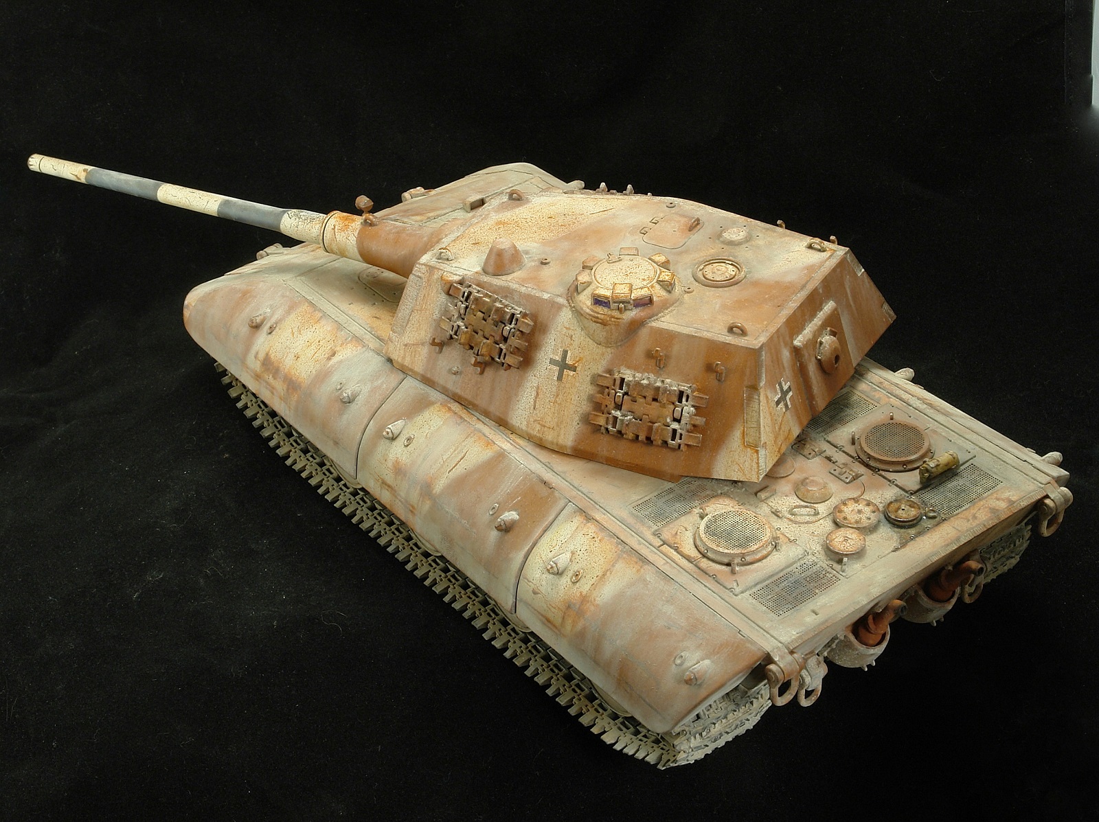 По деталировке: увы, но ориентироваться есть на что. Как минимум, на корпус Е-100. И мы можем увидеть, что у Вас отсутствует большое количество видимых на фото сварных швов: как минимум на стыке ВЛД и кормы с бортовыми деталями их стоило дать, щели на корме особо не доставляют. По той же башне - ком.башенку обваривать смысла как раз было мало, а вот колпак прицела - чётко как у Maus-a, он как раз приваривался. Квадратный выступ на башне на корме лучше б вообще срезали, он лишён смысла.