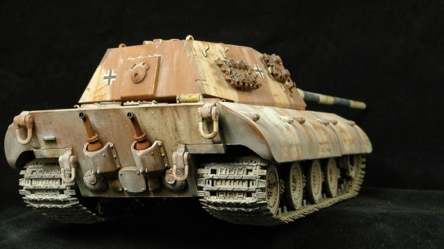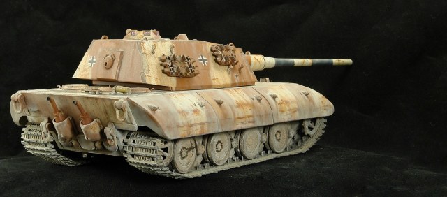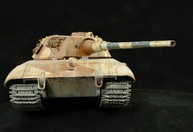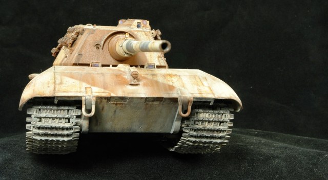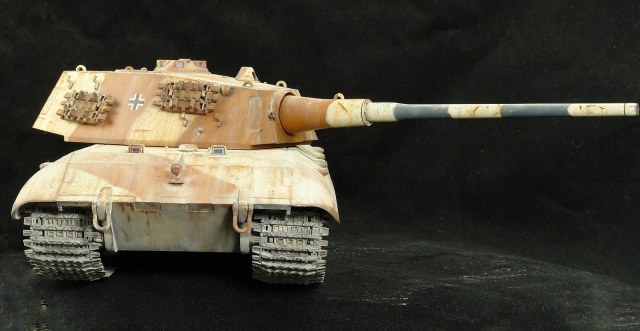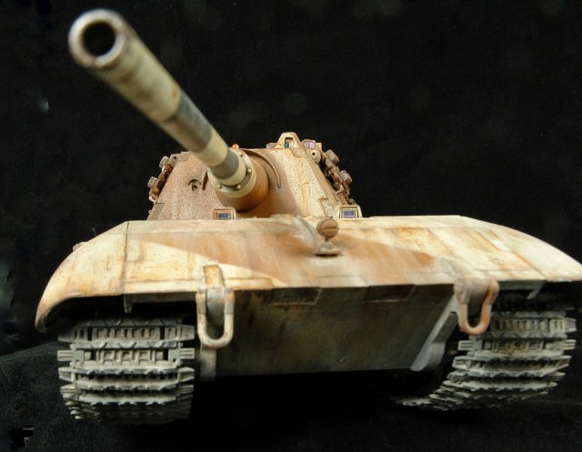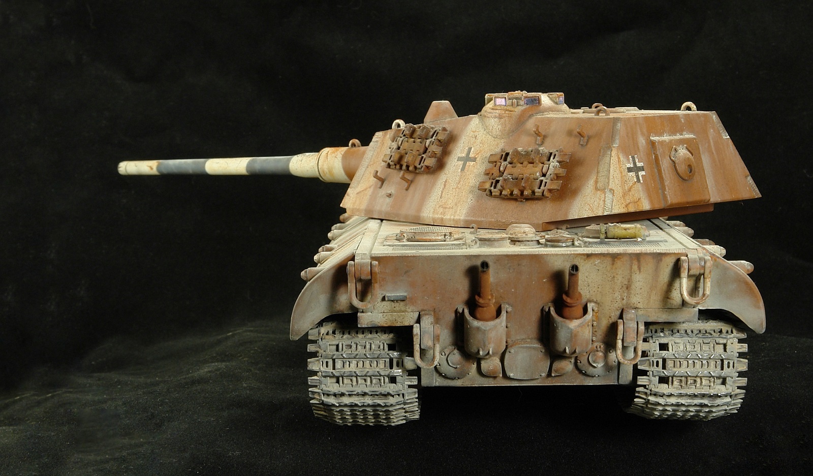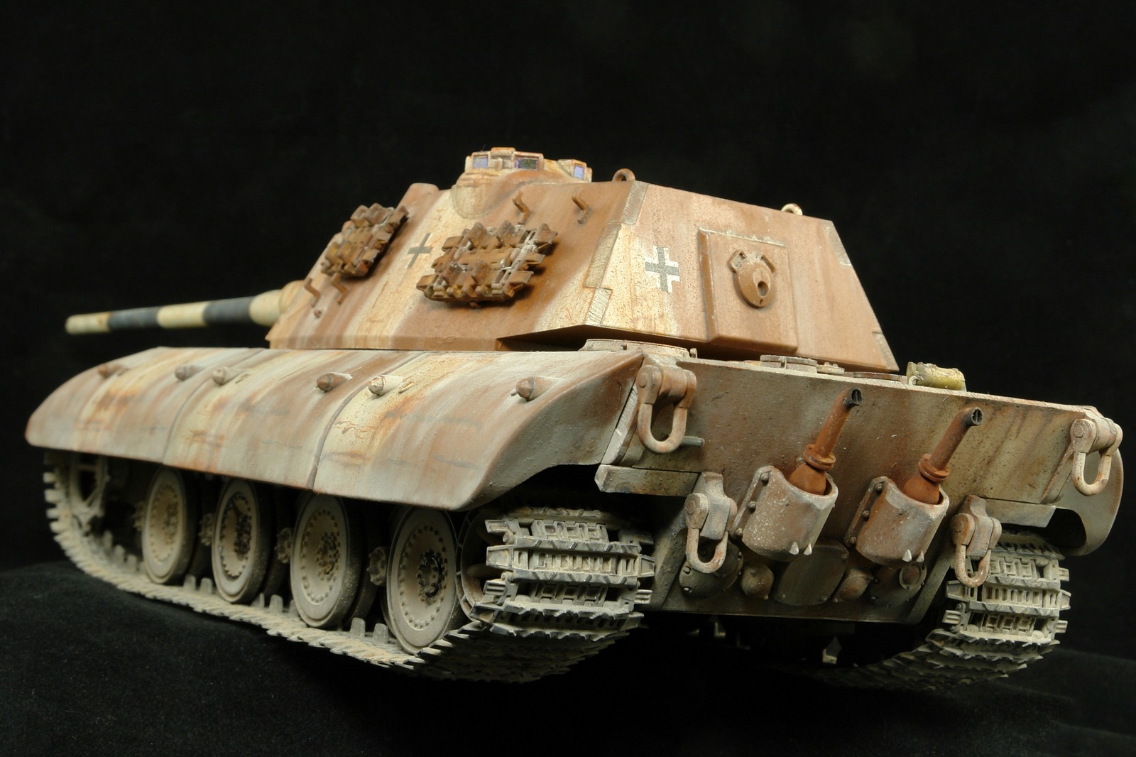 По деталировке: увы, но ориентироваться есть на что. Как минимум, на корпус Е-100. И мы можем увидеть, что у Вас отсутствует большое количество видимых на фото сварных швов: как минимум на стыке ВЛД и кормы с бортовыми деталями их стоило дать, щели на корме особо не доставляют. По той же башне - ком.башенку обваривать смысла как раз было мало, а вот колпак прицела - чётко как у Maus-a, он как раз приваривался. Квадратный выступ на башне на корме лучше б вообще срезали, он лишён смысла.
