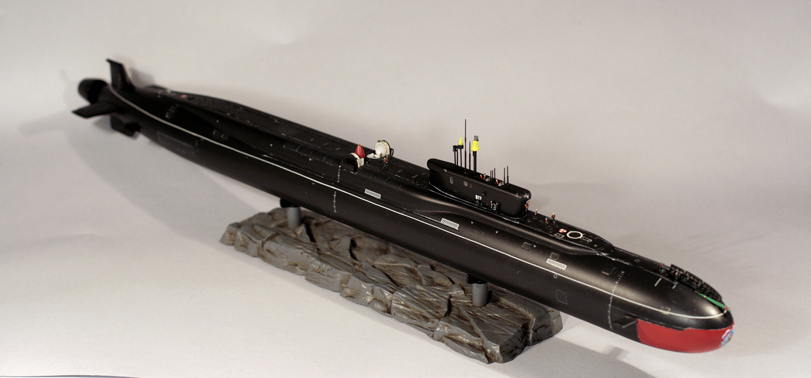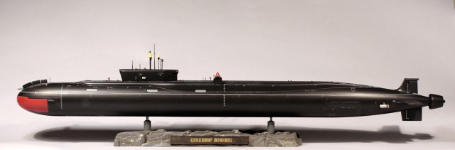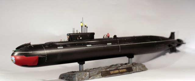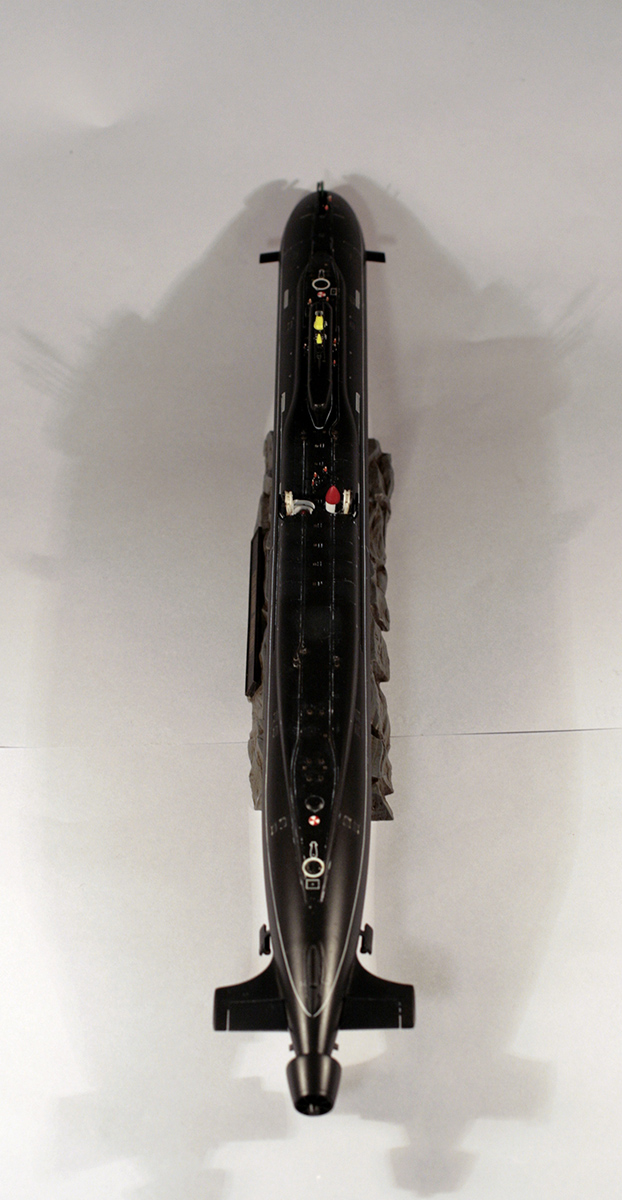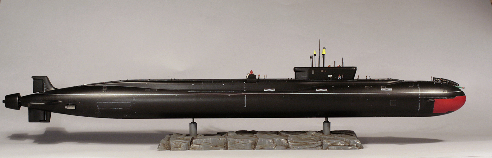 Покраска модели - Мастер-Акрилом и Валлехо. Глянцевый лак - Футура. Финишный матовый - Мастер-Акрил. Чуток смывки от MIG(с нею немного пролетел, смывка старая, стиралась с поверхности плохо, пришлось её прямо оттирать с уайт-спиритом, так что легла она неравномерно в итоге). Декали хорошие, но очень нежные. Пару отметок о погружении не уберег. Я в курсе,что красный обтекатель носа имел только "Юрий Долгорукий", но мне не хотелось иметь одноцветную черную модель на полке, так что я осознанно отошел от правды. Окрас ракет - по мотивам тестовых окрасок "Булав", исключительно потому что "цветасто".