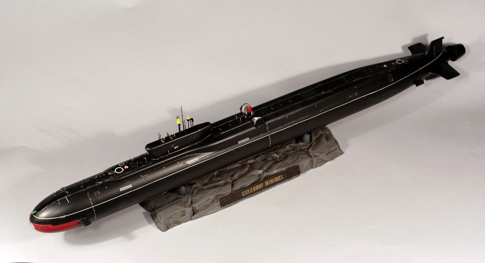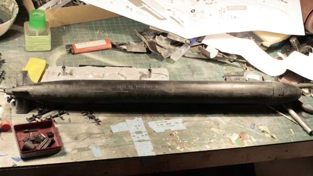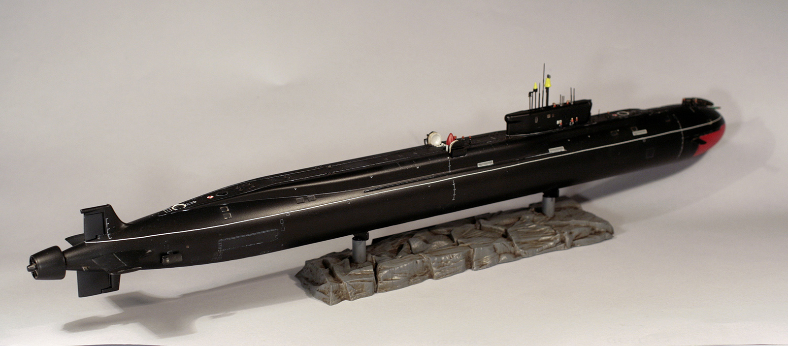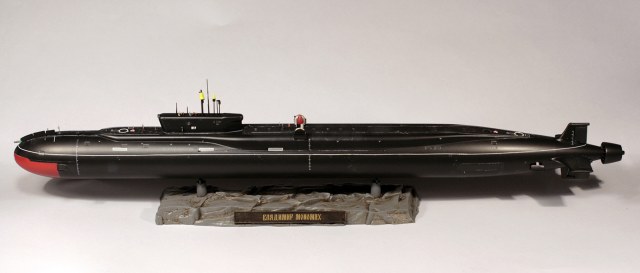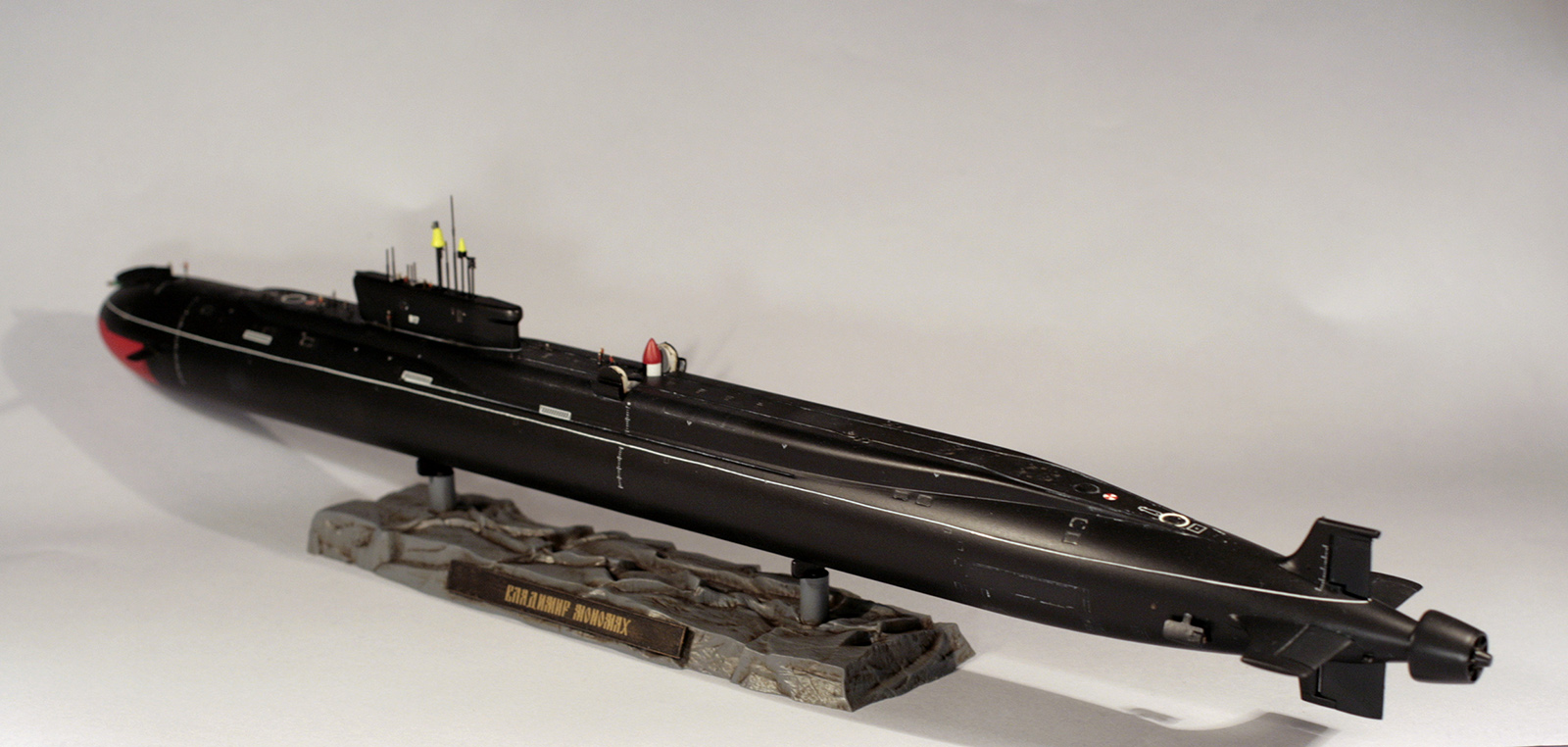 Покраска модели - Мастер-Акрилом и Валлехо. Глянцевый лак - Футура. Финишный матовый - Мастер-Акрил. Чуток смывки от MIG(с нею немного пролетел, смывка старая, стиралась с поверхности плохо, пришлось её прямо оттирать с уайт-спиритом, так что легла она неравномерно в итоге). Декали хорошие, но очень нежные. Пару отметок о погружении не уберег. Я в курсе,что красный обтекатель носа имел только "Юрий Долгорукий", но мне не хотелось иметь одноцветную черную модель на полке, так что я осознанно отошел от правды. Окрас ракет - по мотивам тестовых окрасок "Булав", исключительно потому что "цветасто".