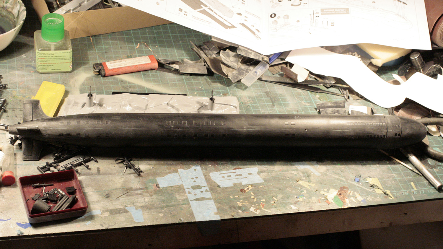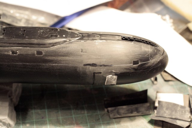Сборка модели заняла один вечер. Все стыковалось отлично. В сети ругались на стыковку носа. Я несколько отошел от инструкции и сначала склеил половинки носа с половинками корпуса. В итоге никаких проблем со стыковкой не было. Шпаклевки ушло минимальное количество, чисто ради получения идеальных швов между половинок корпуса.