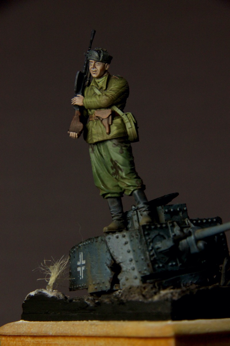 Добрый день! Хочу представить на ваш суд свою новую миниатюру от Evolution. Изначально планировалась обычная подставка, но в процессе работы воображение разыгралось и было принято решение сотворить что нибудь с башней от давно собранного pz 38(t) от ВЭ. Красилось все акрилом от Валехо. Приятного просмотра!