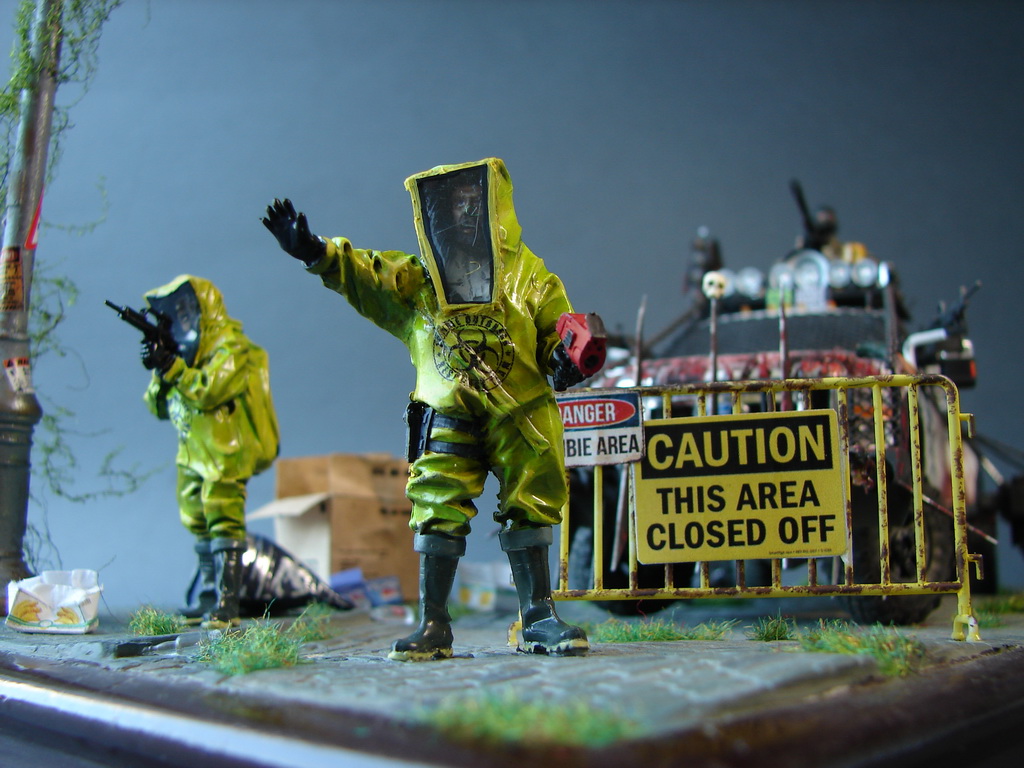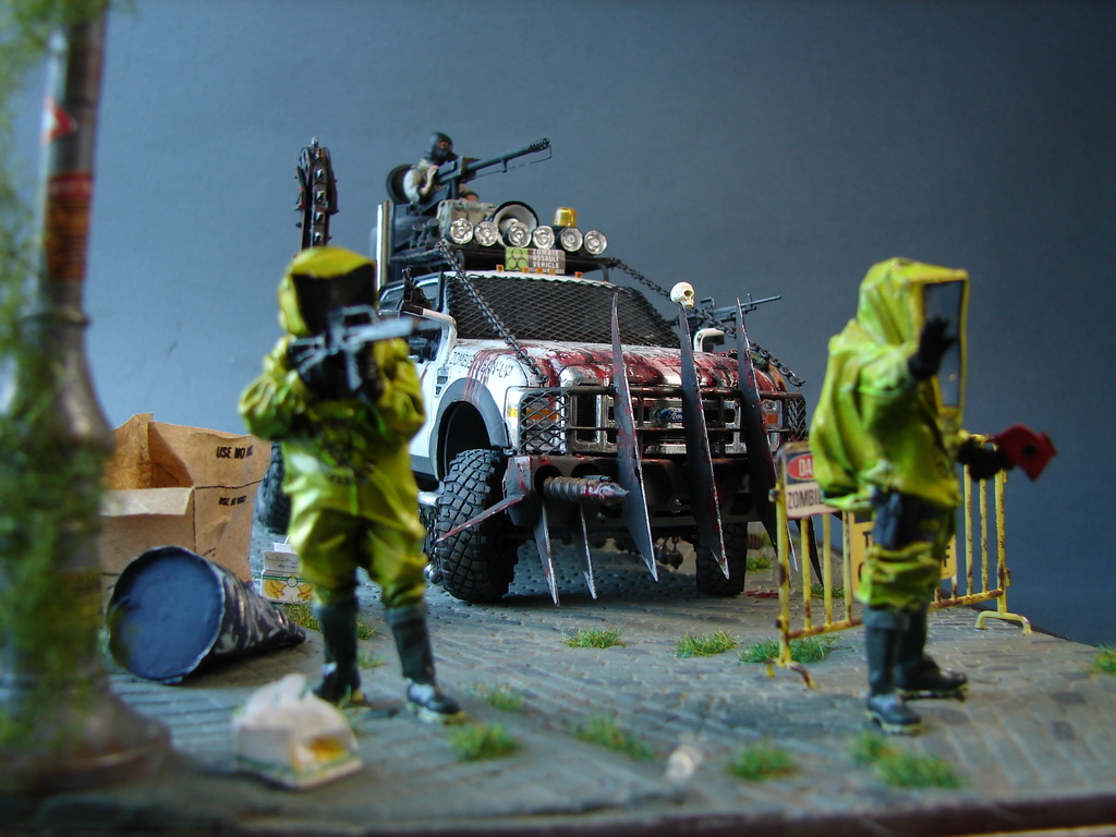 Мои поздравления автору работы. Диорама классная, треш в наличии, автомобиль - ну, просто нет слов, и навороты и роспись выше всяких похвал ! Фигурки также на высоте ! Только дорожная кладка каменная как-то чистенько выглядит, как будто на киностудии ее недавно подмели? Ну это чисто ИМХО, а так - просто СУПЕР !