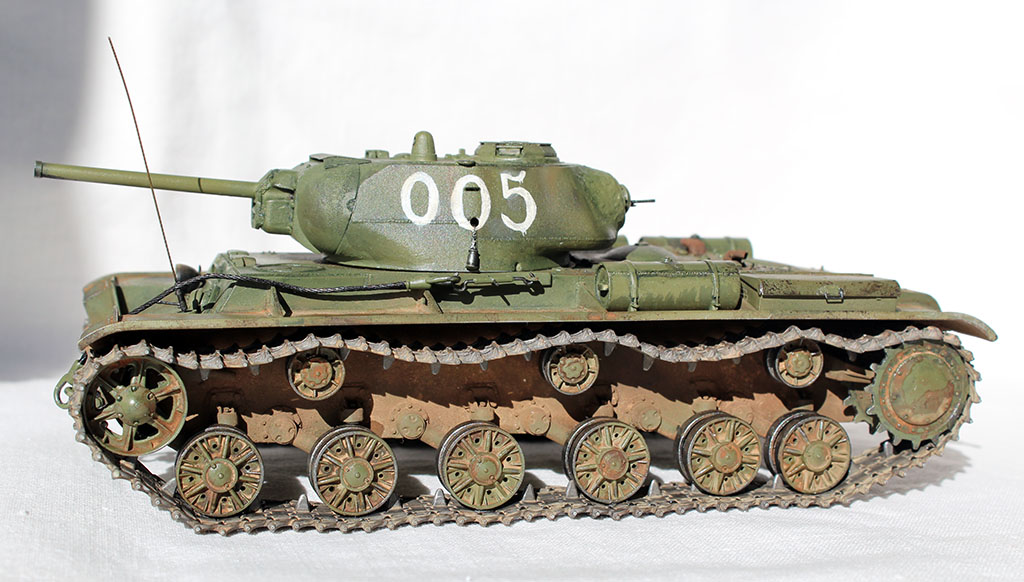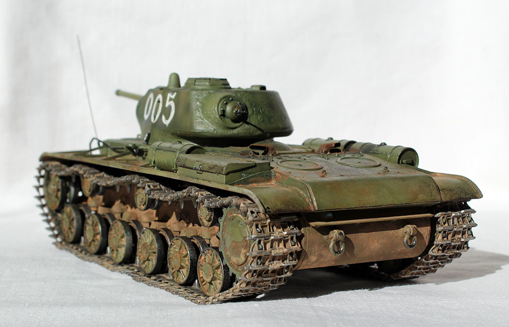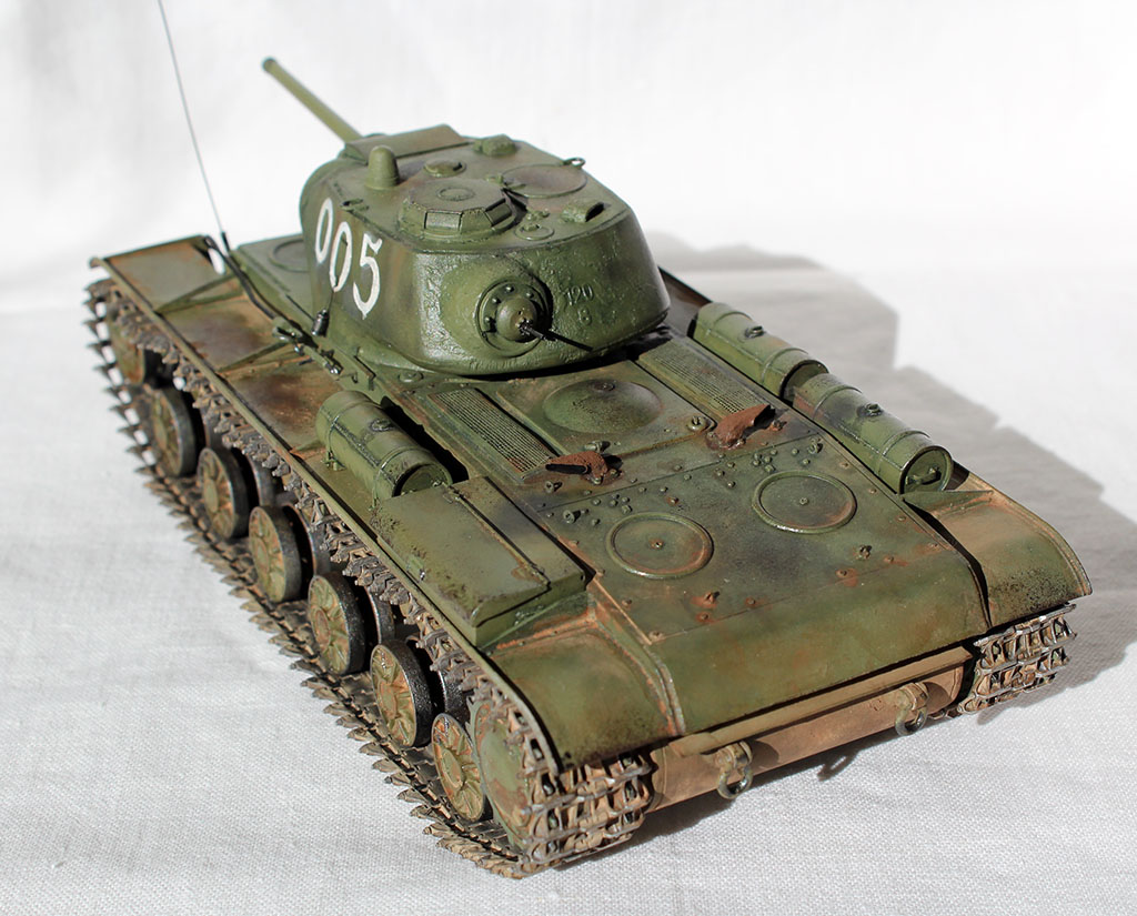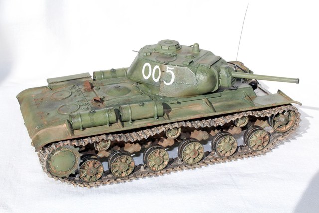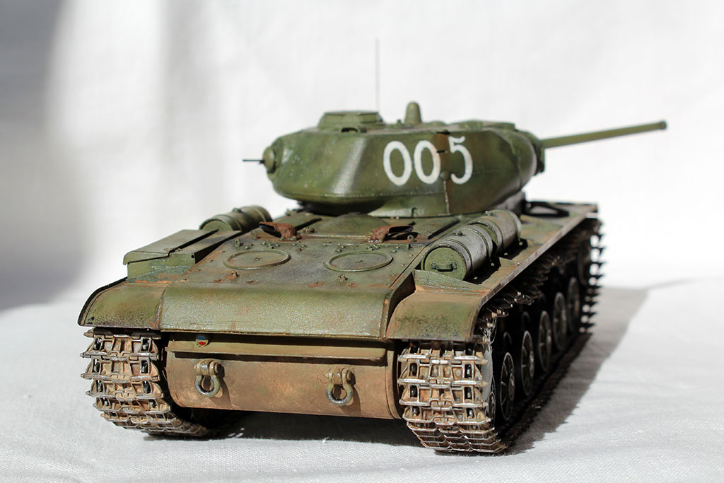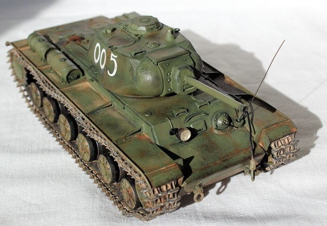Всех приветствую и представляю свой КВ-1С от "Восточного Экспресса". Модель доделывалась в рамках конкурса "Собрать Т-18", за что организаторам огромное спасибо - иначе не знаю, когда бы доделал. Из допов использовалось травление от Вояджера для КВ-85 (инструментальный ящик, пробка для револьверной бойницы, сетки и всякая мелочь), стволы для пушки (производителя не помню) и для пулеметов ( Magic Models). Траки смоляные - конечно, от Мастер Клаб (очень понравились, в отличии от их же металлических для Т-26). Выхлопные патрубки - "Москит". Грунт из тамиевского баллончика, базовый цвет - осветленная Тамия XF-81, лаки - Гюнза акрил, смывки от разных производителей, как и пигменты. Номера накрасил кистью -темперой. За прототип был взят ранний КВ-1с лейтенанта А.Г.Парфенова из 1536 тяжелого самоходно-арт. полка. Для этой машины характерны "облегченные" гусеницы со скосами, отсутствие поручней на корпусе и башне, дополнительная броненакладка на маске пушки. Ну и номер интересный - "005"...