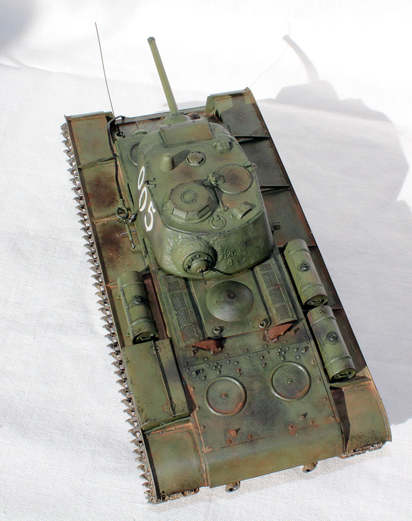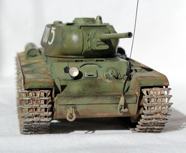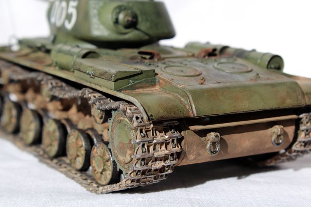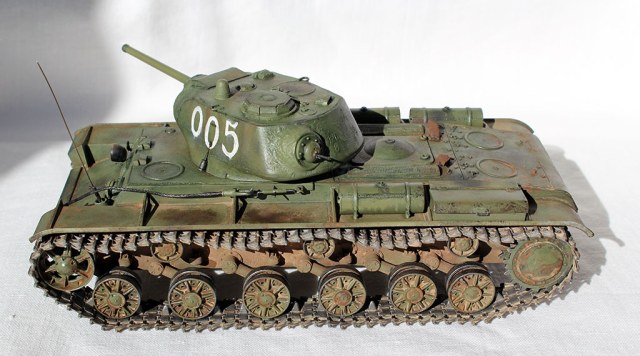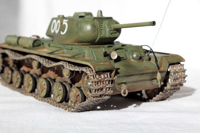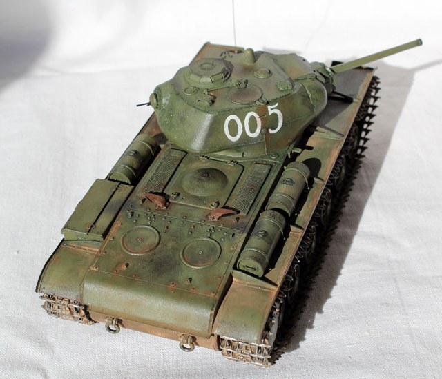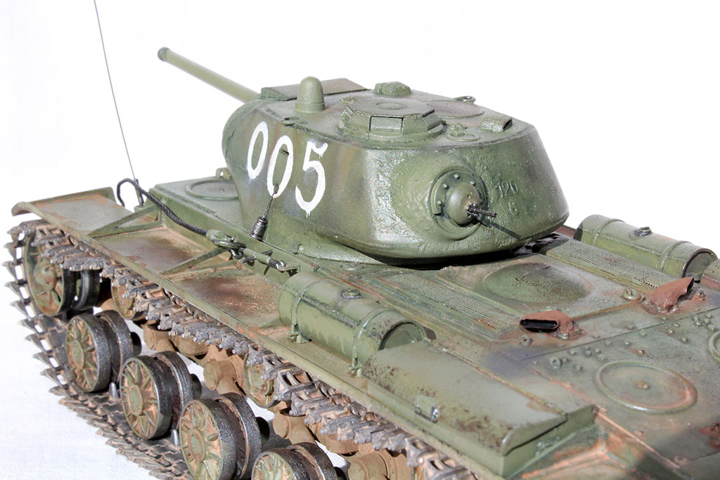 Всех приветствую и представляю свой КВ-1С от "Восточного Экспресса". Модель доделывалась в рамках конкурса "Собрать Т-18", за что организаторам огромное спасибо - иначе не знаю, когда бы доделал. Из допов использовалось травление от Вояджера для КВ-85 (инструментальный ящик, пробка для револьверной бойницы, сетки и всякая мелочь), стволы для пушки (производителя не помню) и для пулеметов ( Magic Models). Траки смоляные - конечно, от Мастер Клаб (очень понравились, в отличии от их же металлических для Т-26). Выхлопные патрубки - "Москит". Грунт из тамиевского баллончика, базовый цвет - осветленная Тамия XF-81, лаки - Гюнза акрил, смывки от разных производителей, как и пигменты. Номера накрасил кистью -темперой. За прототип был взят ранний КВ-1с лейтенанта А.Г.Парфенова из 1536 тяжелого самоходно-арт. полка. Для этой машины характерны "облегченные" гусеницы со скосами, отсутствие поручней на корпусе и башне, дополнительная броненакладка на маске пушки. Ну и номер интересный - "005"...
