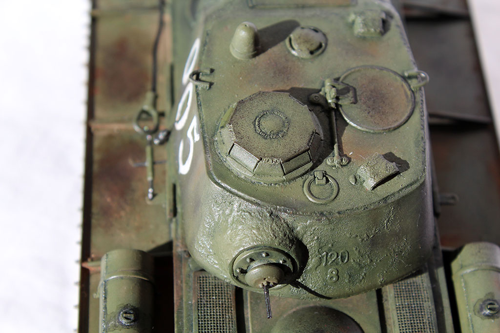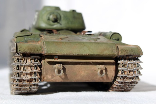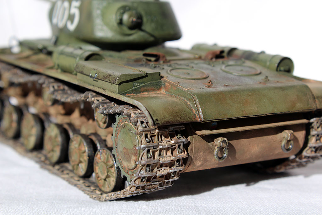 Позвольте с вами подискутировать. Если Вы , Александр, думаете, что на фотографиях видно цвет материала траков (смолы), то Вы ошибаетесь. Они грунтованы и покрашены в базу - тамиевский "темный металл". После пигментов слегка пройдены "хром сильвер". Это такое мое видение металлических траков. Мне кажется, они не должны ярко сверкать и блестеть. Но это уже дело вкуса...