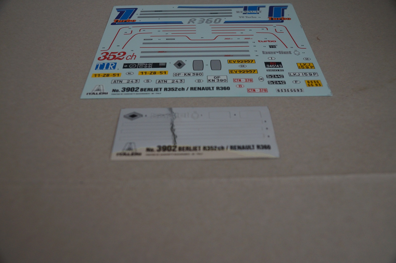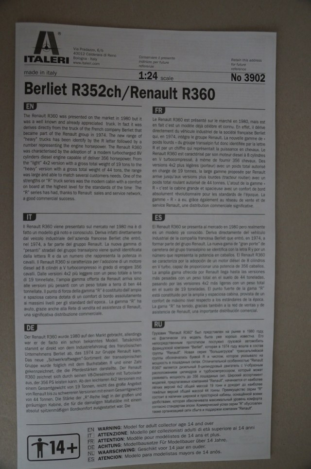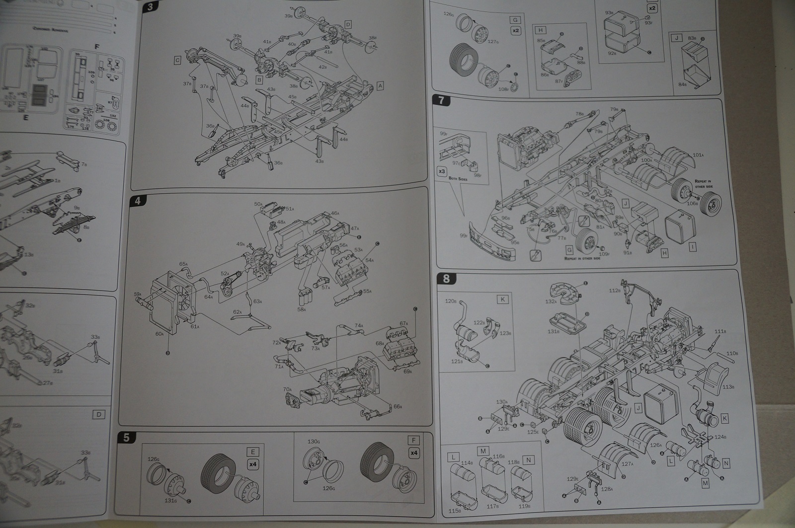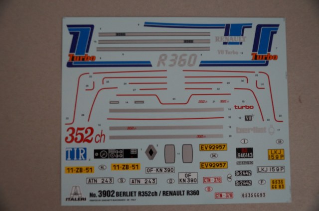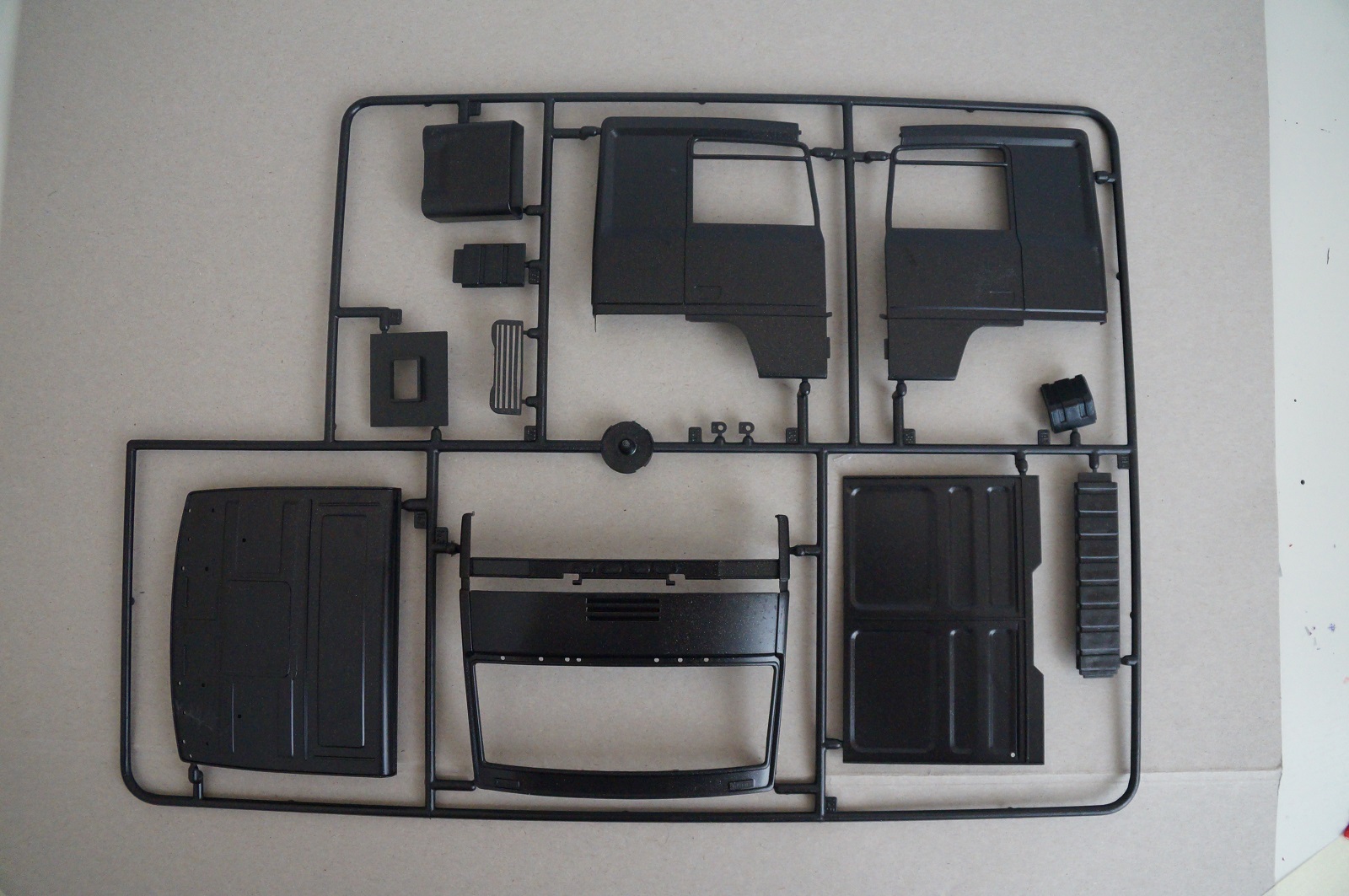 В большой солидной коробке стандартный италовский набор для камионов масштаба 1/24 - 6 литников с платиком, 1 прозрачный, 1 хромированный, 8 штук шин из резиноподобного материала (с техническими надписями), декаль и лист самоклеющейся серебристой пленки. Про копийность ничего не скажу, но на машину с фирменного буклета похоже (в отличие от например Скании Гриффина, где жуткая отсебятина). Собираемость у итальянских грузовиков, особенно у кабин, достаточно средняя (помню ту же Сканию, где панели кабин тупо не сошлись миллиметра на 4 после вклейки интерьера).