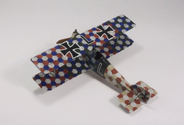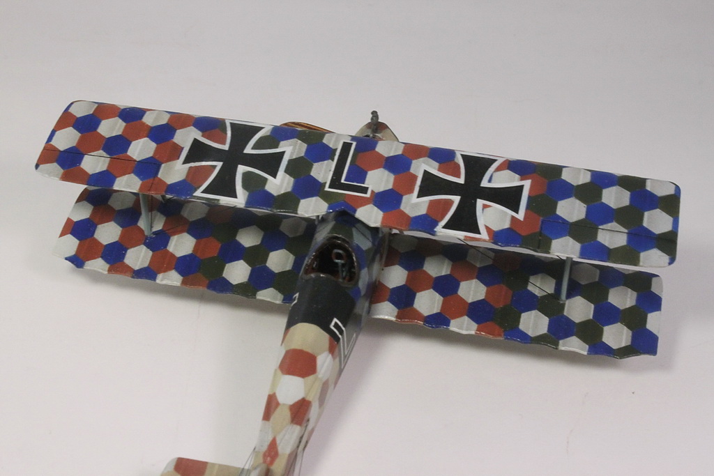 Заноза Авиатиков - это камуфляж, исполненный в виде гексагональной сетки. Можно, конечно, и другой камо найти, их есть немало, но возникают сложности в подборе соответствия окрас/модификация. В прошлый раз я шестиугольники накрашивал кисточкой вручную, тогда аэрографа у меня еще не было. На сей раз подошел к делу более ответственно, и использовал маски. Процесс был трудоемким и долгим (в конце есть фото процесса - и после чернового окраса каждый гекс еще отдельно корректировался). Сразу скажу, что цвета могут быть предметом обсуждения, но этот вариант на форумах, скажем так, "набирает большинство" экспертных мнений. Нет также полной ясности с буквой L на верхнем крыле, и даже цветом полос на фюзеляже (некоторые полагают, что они были красные, а не черные), но что делать - когда нет стопроцентно ясного вывода, нужно принимать волюнтаристские решения.
