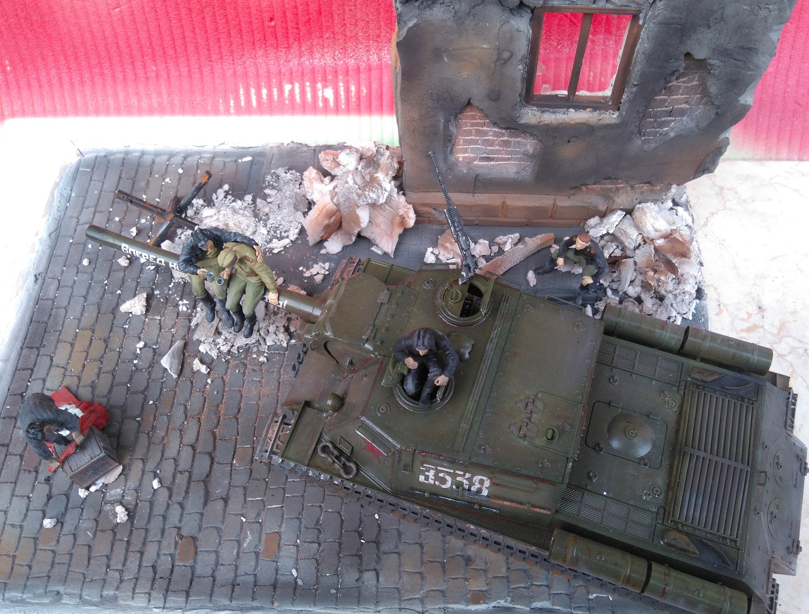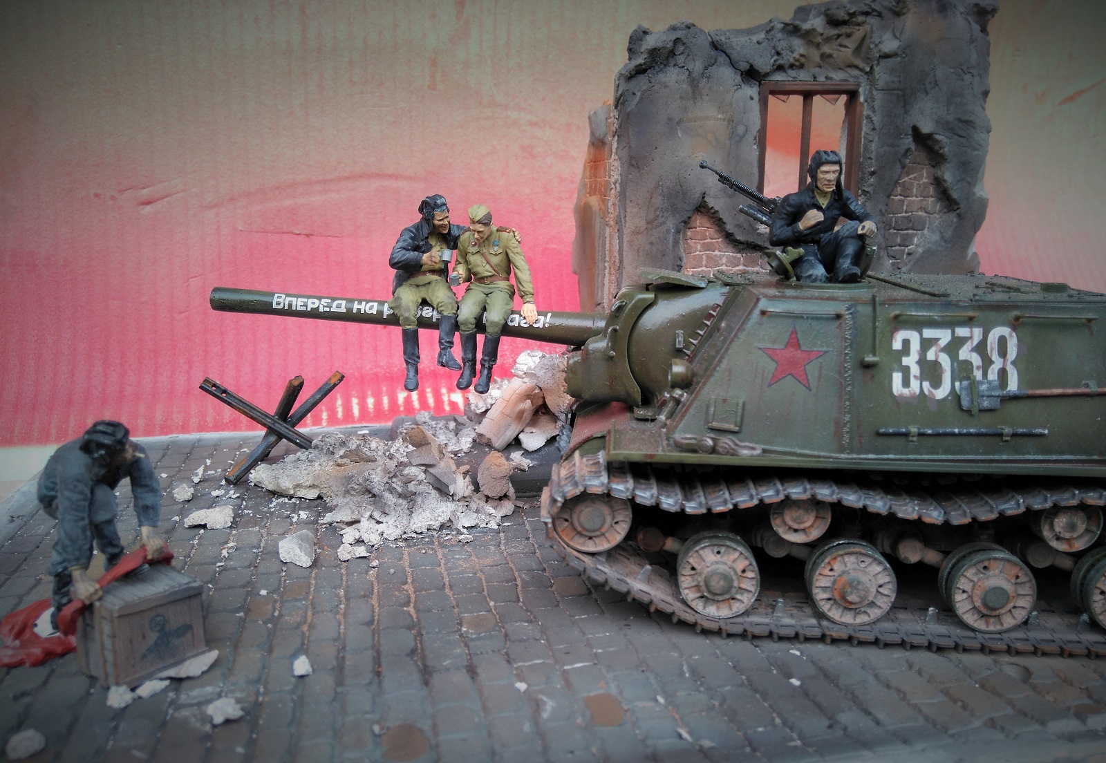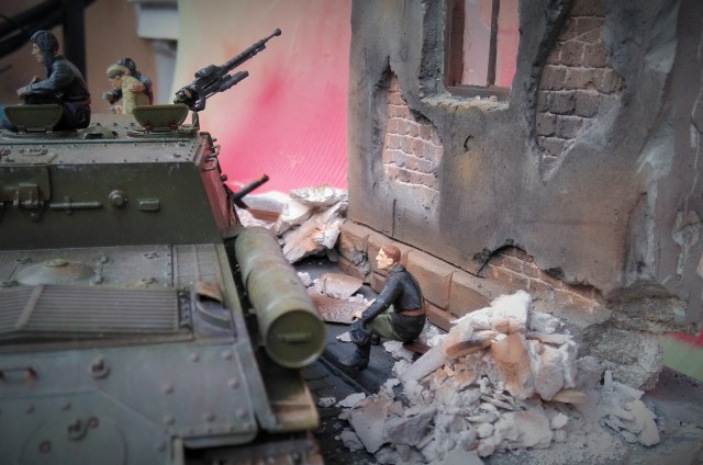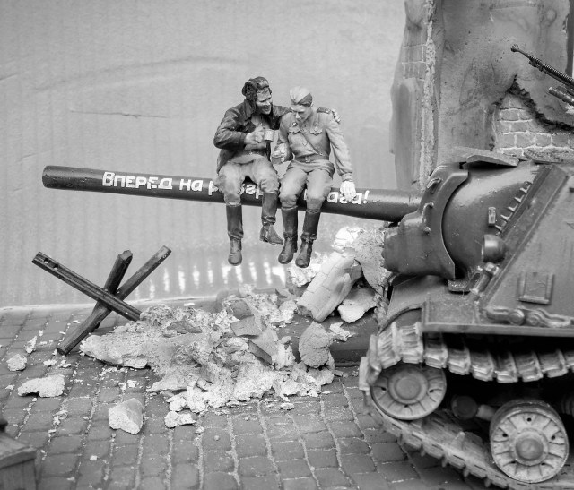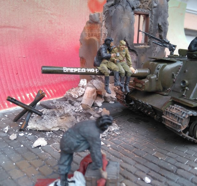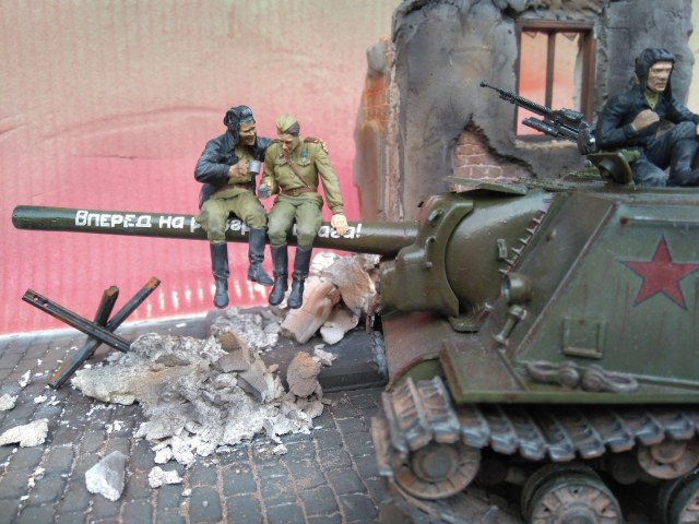 Фигурки от производителя, конечно, классные, но вот он рекомендует бойцов-пИвцов располагать на стволе. Возникает вопрос, а кто наливает в кружки и где вообще пузырь? Солдатик в отличие от танкиста уже готов и вот-вот вспорхнет с насеста. Но это не к мастеру данной работы. Убедительнее их было бы расположить на башне или корпусе танка, где и пузырь с закусью под боком, да и навернуться с насеста не придется. Фантастика ! Танкист в люке, - откуда этот страх взялся? Он с фигурками от Сталинграда ну совсем не гармонирует. Как-то каждый сам по себе. Фон нужен другой. Мостовая очень понравилась. Штукатурка на здании толста. Непонятно, что с верхней частью разрушенного здания, смотрится как окрашенные лохмотья. Извините, ежели что... В любом случае видно, что автор очень старался и вложил душу в эту работу. Рекомендую не завершать совсем эту работу, а усовершенствовать ее художественную часть (фон, танкист в люке, штукатурка на здании и т.п.)