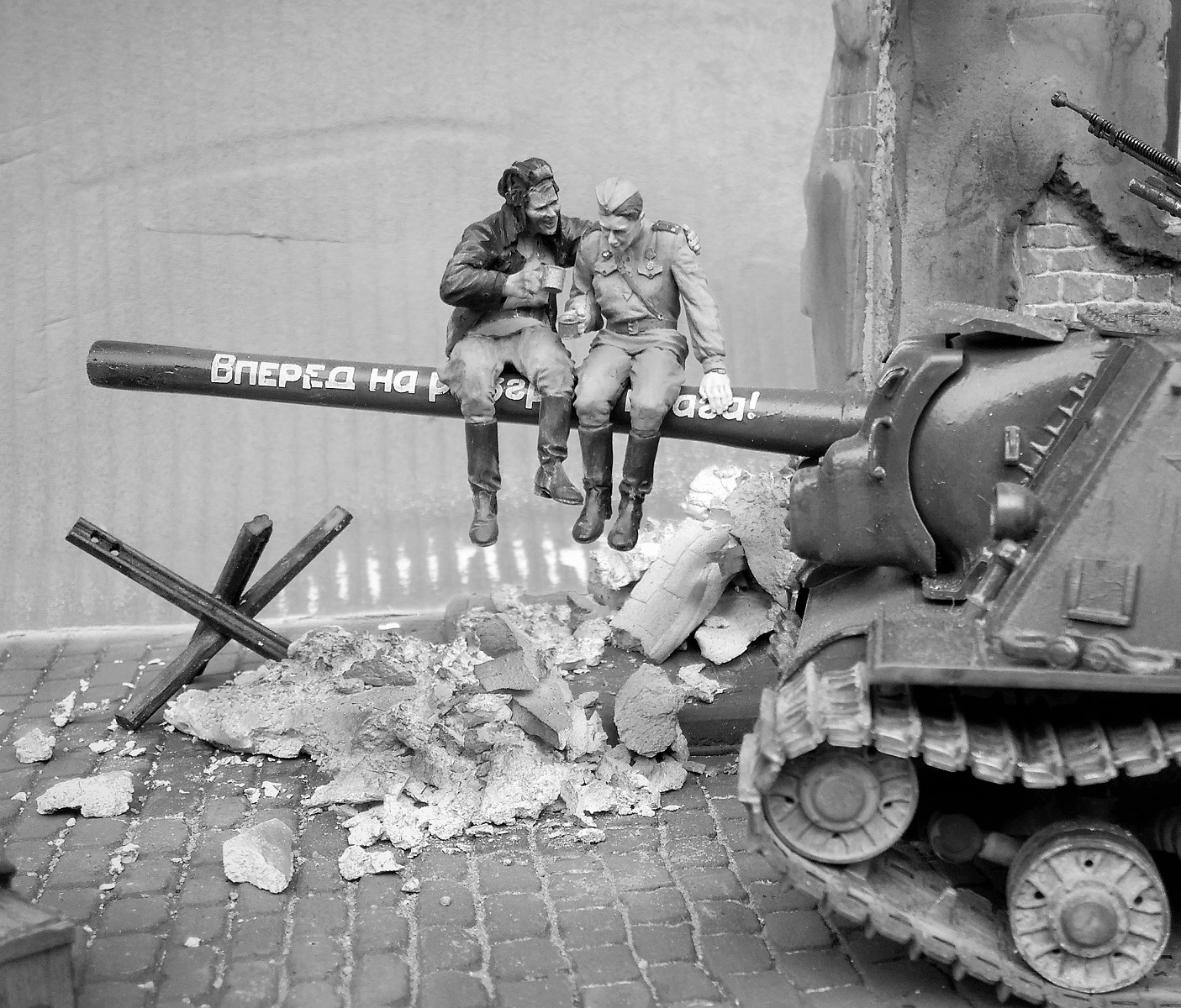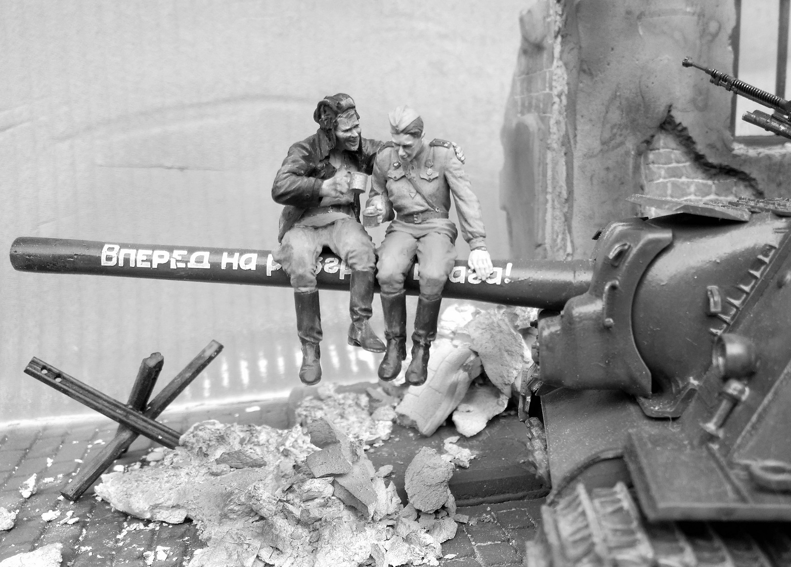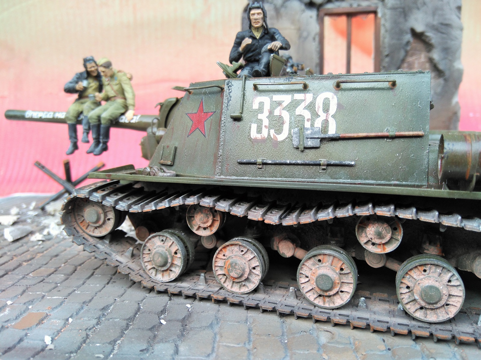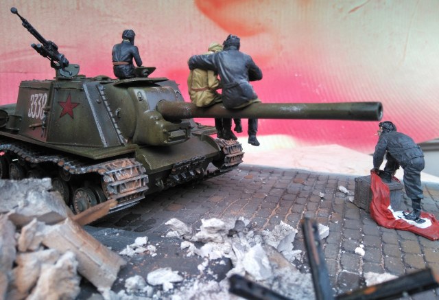 Фигурки от производителя, конечно, классные, но вот он рекомендует бойцов-пИвцов располагать на стволе. Возникает вопрос, а кто наливает в кружки и где вообще пузырь? Солдатик в отличие от танкиста уже готов и вот-вот вспорхнет с насеста. Но это не к мастеру данной работы. Убедительнее их было бы расположить на башне или корпусе танка, где и пузырь с закусью под боком, да и навернуться с насеста не придется. Фантастика ! Танкист в люке, - откуда этот страх взялся? Он с фигурками от Сталинграда ну совсем не гармонирует. Как-то каждый сам по себе. Фон нужен другой. Мостовая очень понравилась. Штукатурка на здании толста. Непонятно, что с верхней частью разрушенного здания, смотрится как окрашенные лохмотья. Извините, ежели что... В любом случае видно, что автор очень старался и вложил душу в эту работу. Рекомендую не завершать совсем эту работу, а усовершенствовать ее художественную часть (фон, танкист в люке, штукатурка на здании и т.п.)