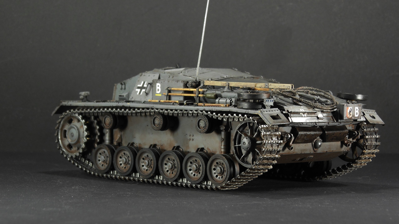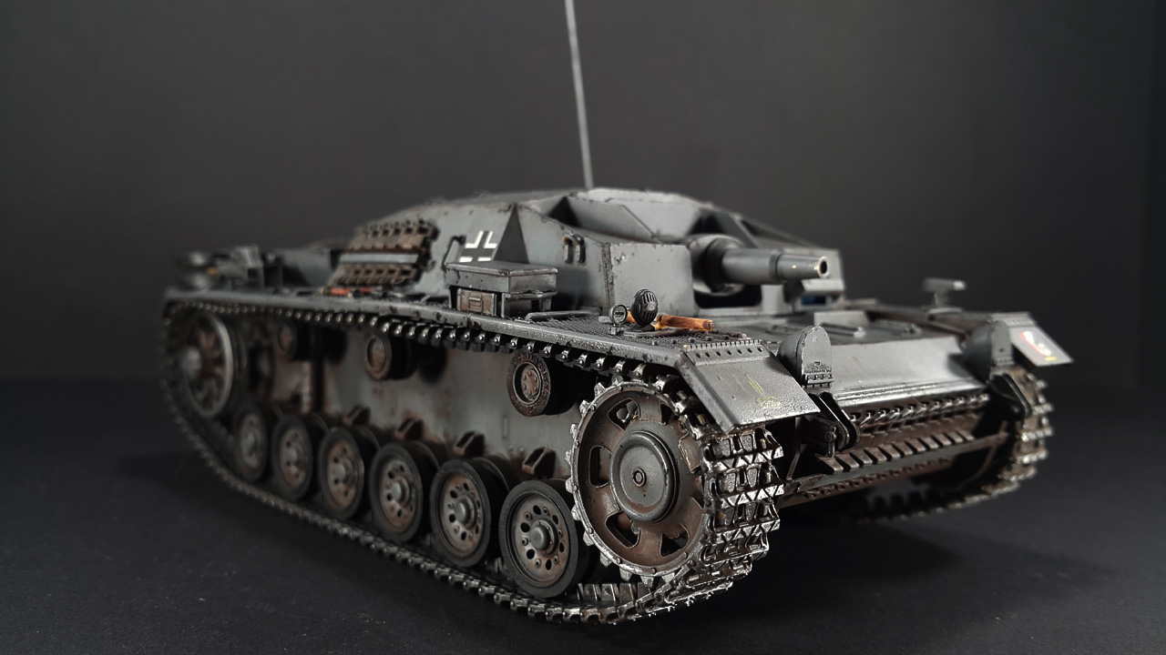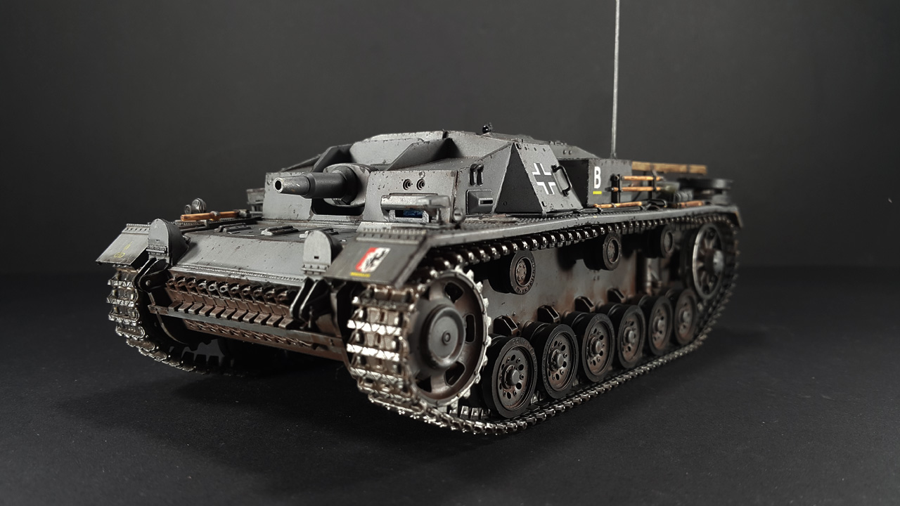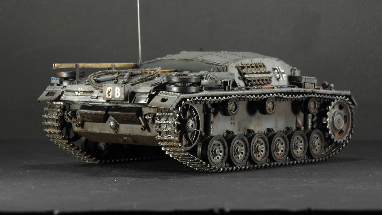 Итак, наконец-то мои давно чесавшиеся руки добрались до Stug III. Это, конечно, не совсем то, что хотелось (а хотелось поздний Штуг с комбашенкой), но тоже машинка симпатичная. Особенно в фирменном Schwarz Grau и c 7,5cm Kwk 37 L\24.