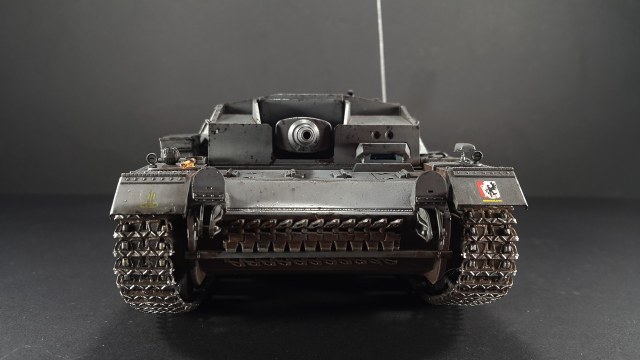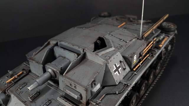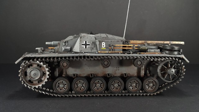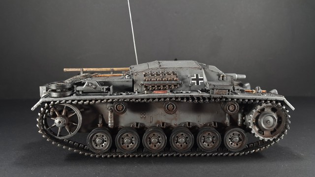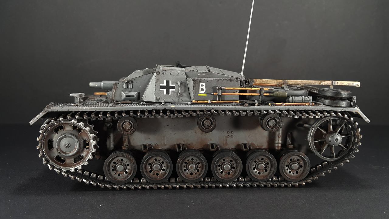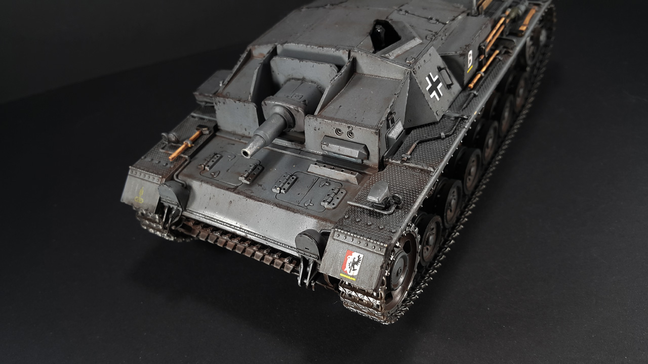 Итак, наконец-то мои давно чесавшиеся руки добрались до Stug III. Это, конечно, не совсем то, что хотелось (а хотелось поздний Штуг с комбашенкой), но тоже машинка симпатичная. Особенно в фирменном Schwarz Grau и c 7,5cm Kwk 37 L\24.