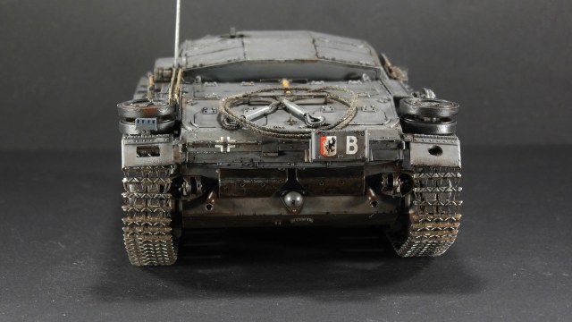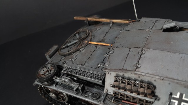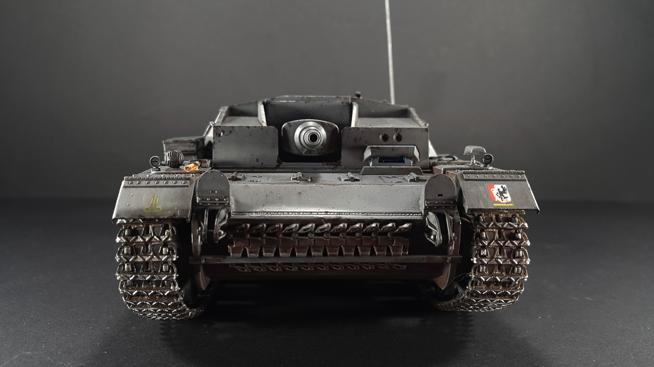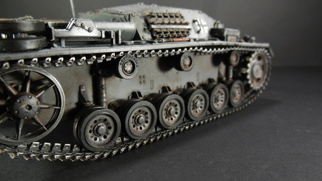 Симпатичный Штуг. Под задними крыльями должны ещё быть грязевые щитки, тогда не будет вот этих сквозных дыр, да и сточить их надо было до масштабной толщины.
