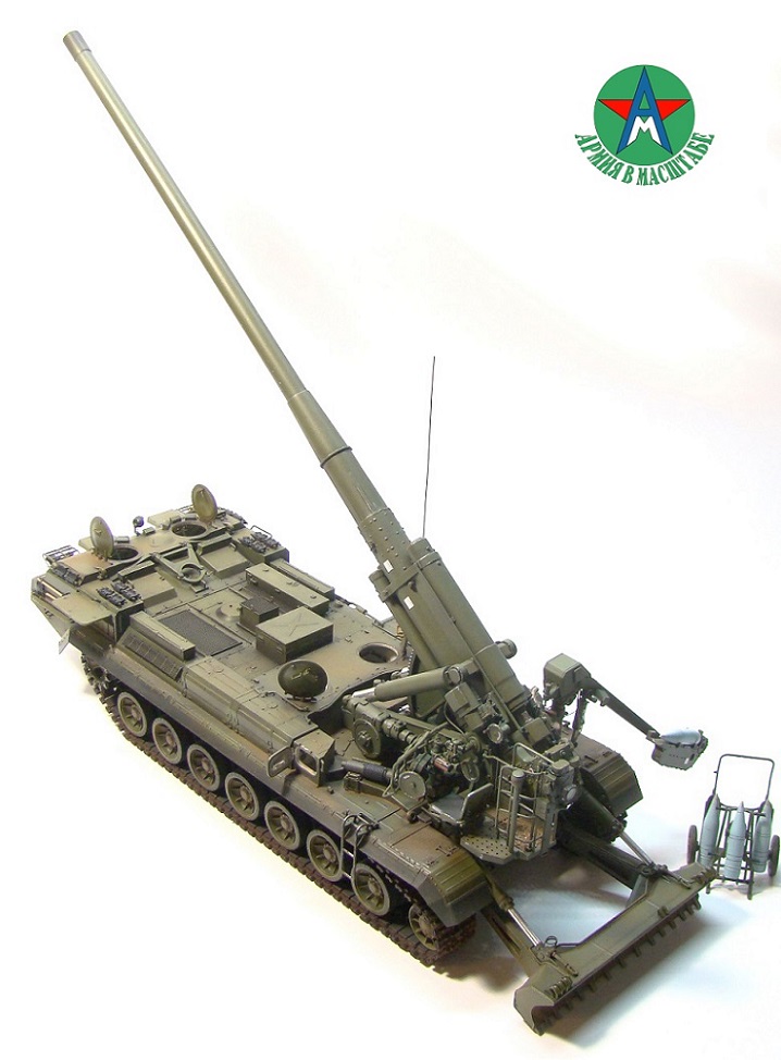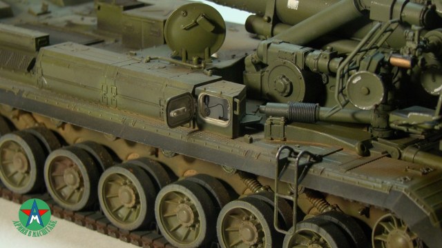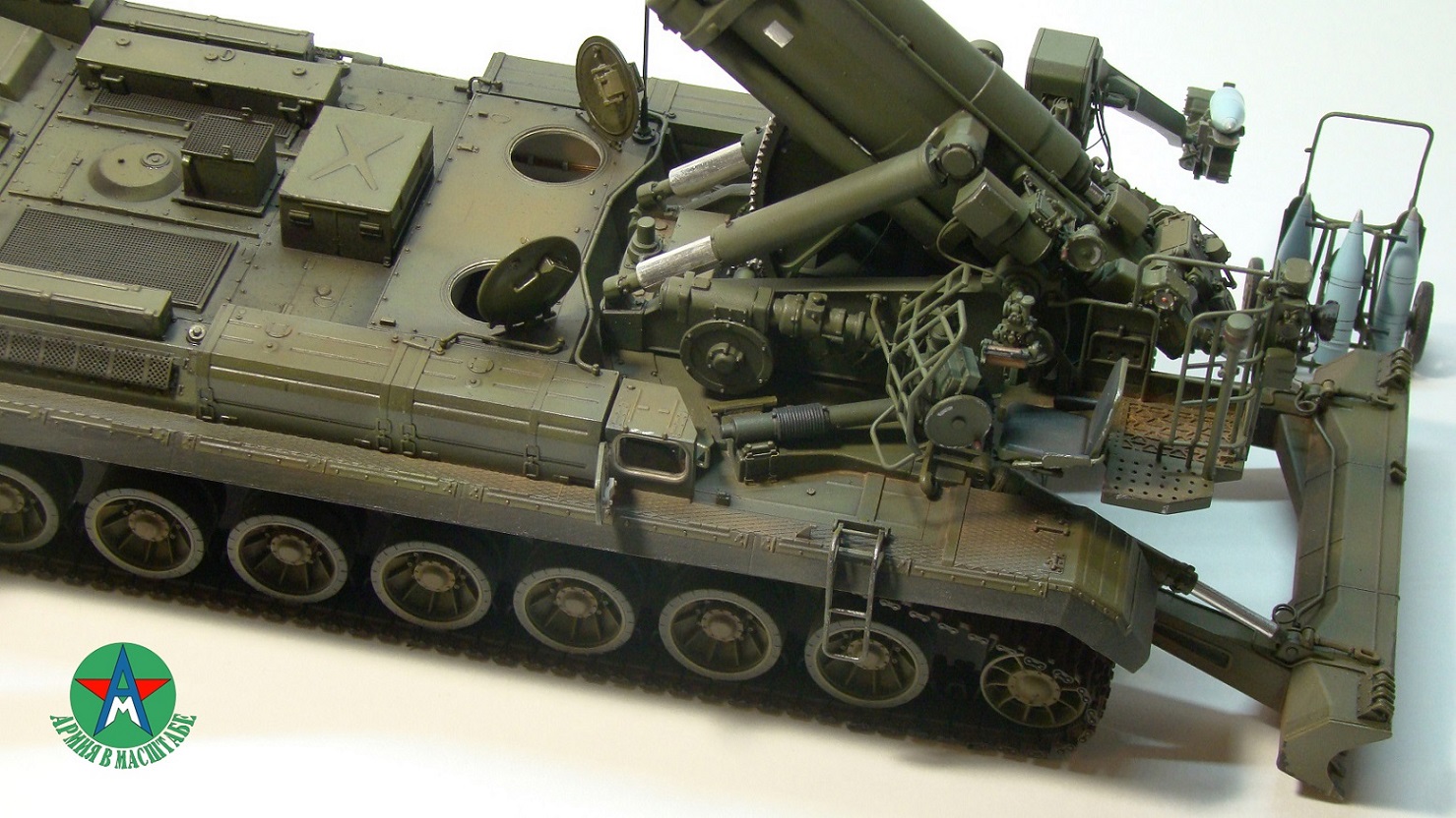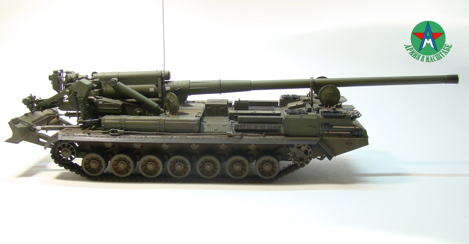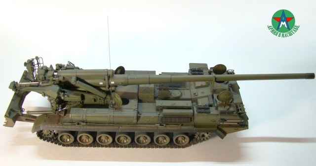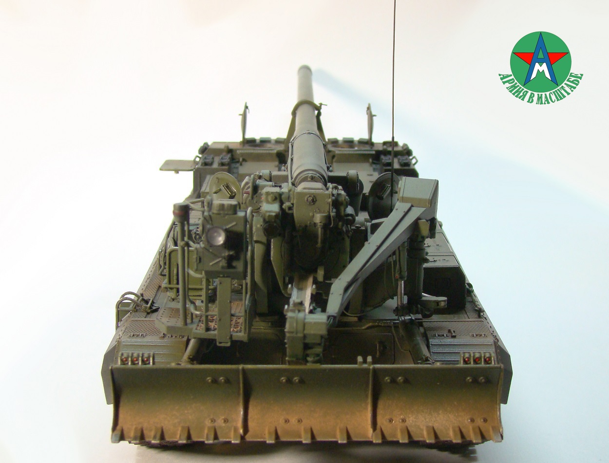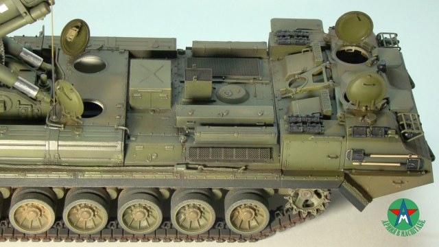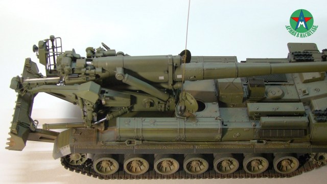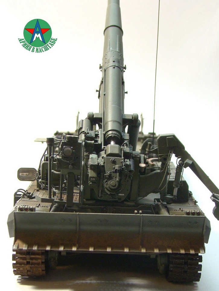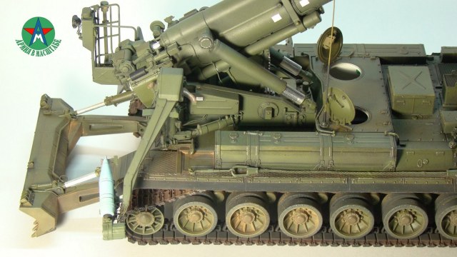 Модель собирал с минимальным количеством шпатлёвки, и с большим количеством доработок. Полностью переделал отсек арт расчёта, производитель даёт его не правильным, сделал заднюю часть гусеничной ленты подвижной, для возможности перевода из походного положения в боевое, сделал имитацию гидро тробок, проводки, штоки на подающе-зарядном механизме металлические.