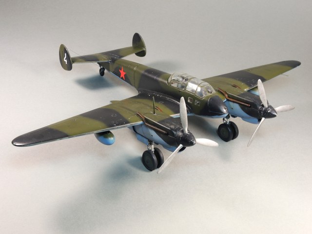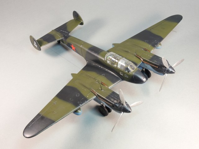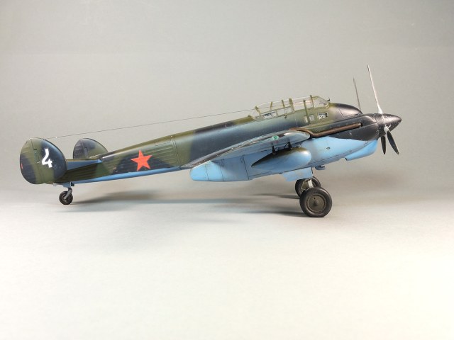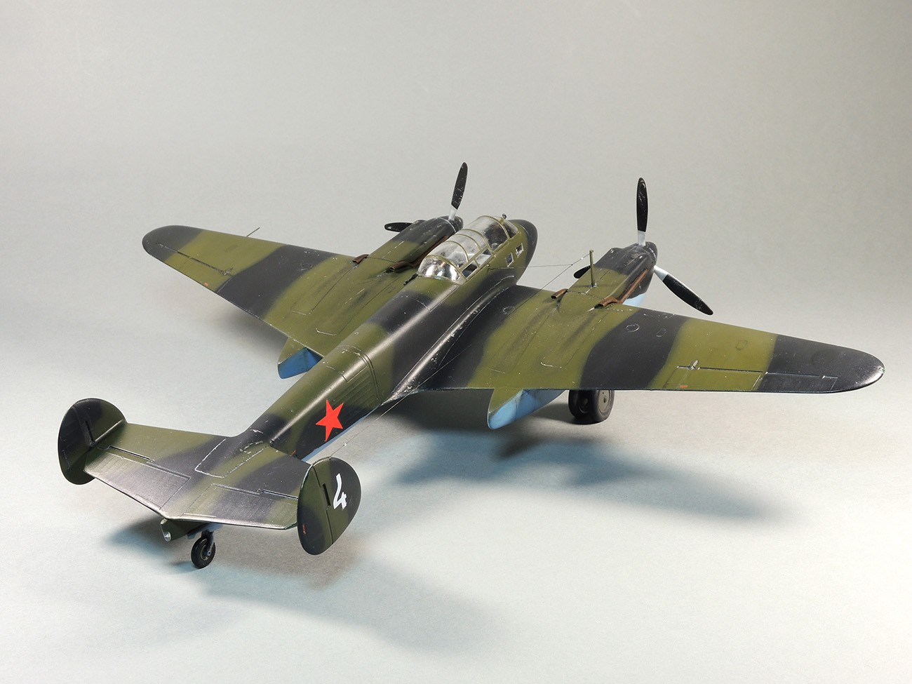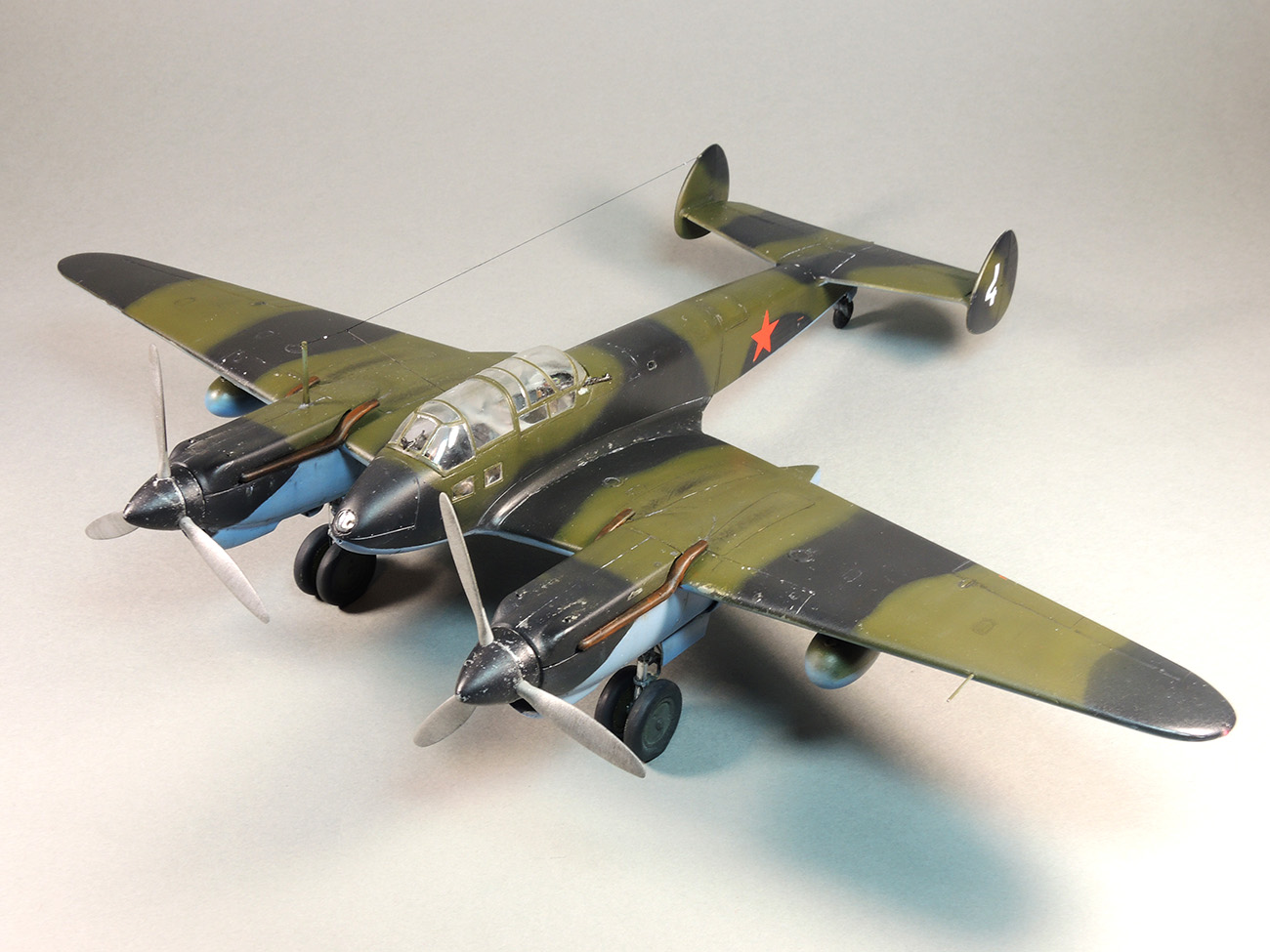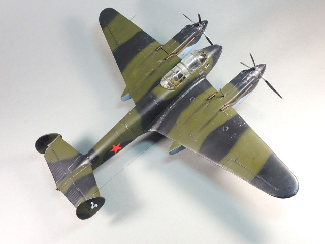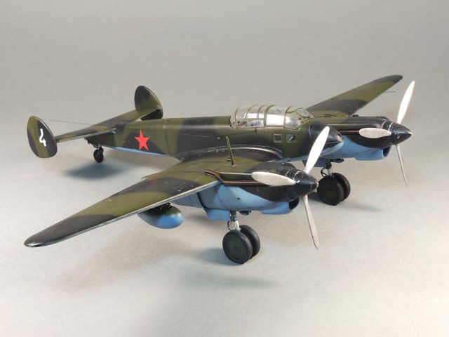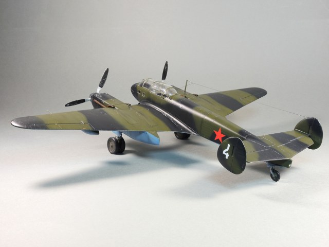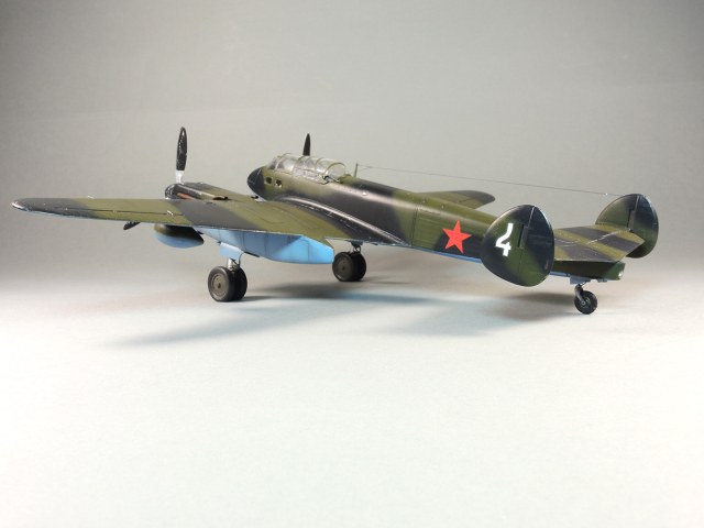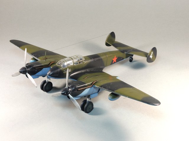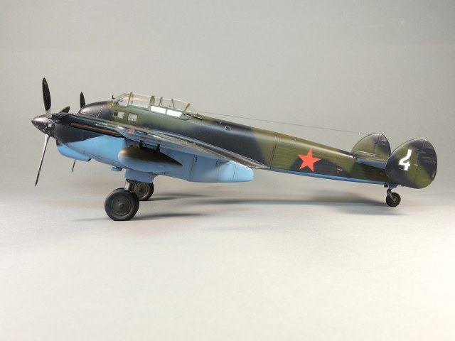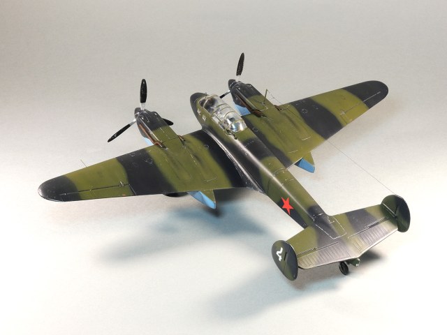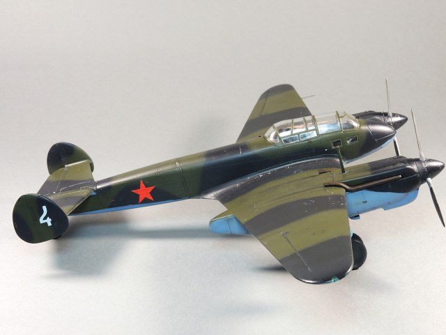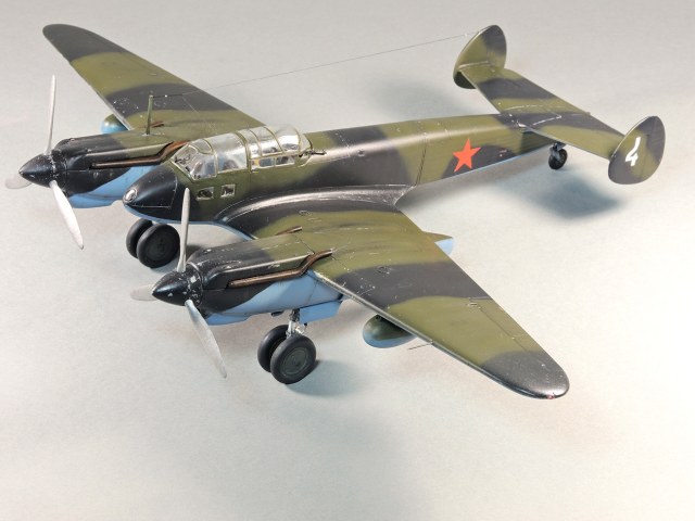 Представляю модель самолета Як-4. На фотографиях Отечественной войны этого самолета не видно победных звездочек, нет каких либо особых окрасок, свидетельствующих о том, что эта машина принадлежала одному из советских асов. Большинство этих самолетов уничтожено в первые месяцы войны. Но это не значит, что Як-4 не внес свой вклад в Победу. Есть и на счету экипажей этих машин удачные боевые вылеты, и сбитые самолеты, и удачно проведенные вылеты по ведению разведки. Оригинальность и необычность конструкции этого самолета явились основанием для желания сделать эту модель и иметь в своей коллекции. О модели. В целом нормальная модель. Толстоваты кромки крыльев, которые пришлось стачивать. Достаточно сложный фонарь, который состоит из 5-ти элементов, что понятно, затрудняет работу по склеиванию этих частей. Остальное – все обычное. В порядке дополнения сделал имитацию двигателя в левой мотогондоле. Добавлены БАНО, мачта антенны их зубочистки. Сама антенна из бантика. Самолет не соответствует конкретному прототипу. Просто самолет Н-ской части. Камуфляжная окраска в некоторой части моя фантазия. Да, Як-4 были и в камуфляже. Но на фото, которые нашел, не видно пятен на крыльях. Поэтому в большей части информация о окраске взята со схемы по окраске Як-4 (двухмоторный самолет, очень на него похожий), ну и что-то с фото.