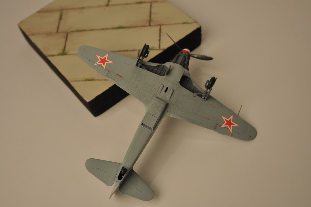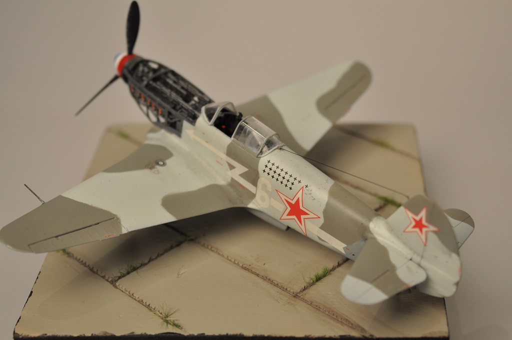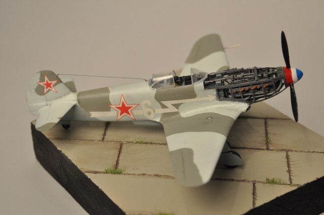 На будущее, что бы ошибка не стала системной, систематической: Все "нутро" получилось германского цвета РЛМ-66. На советских самолетах интерьерный цвет светло серый. Такой примерно, как светлые пятна Вашего "придуманного" камуфляжа. :-))) Самолет в "расчехленном" виде логично показывать на "отстойной" площадке. Под колесами - колодки, заземление, в воздухозаборниках - заглушки, швартовка, снятые капоты рядом лежат на расстеленном брезенте. В кабине - скорее всего не пилот, а техник. Ну и всякий прочий "техобслужный антураж" вокруг. Так модель будет смотреться логично-оправданно.