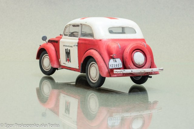 Сама модель от фирмы ICM, думаю многим знакома, мало чем отличается от других авто от этого производителя – не всегда разумное членение деталей, мягкий пластик и т.д. От себя дополнил мелкими деталями – дворники, зеркало, табличка и др.
