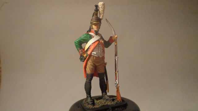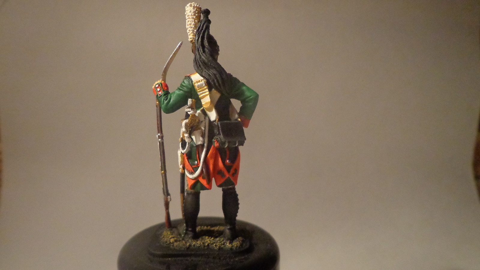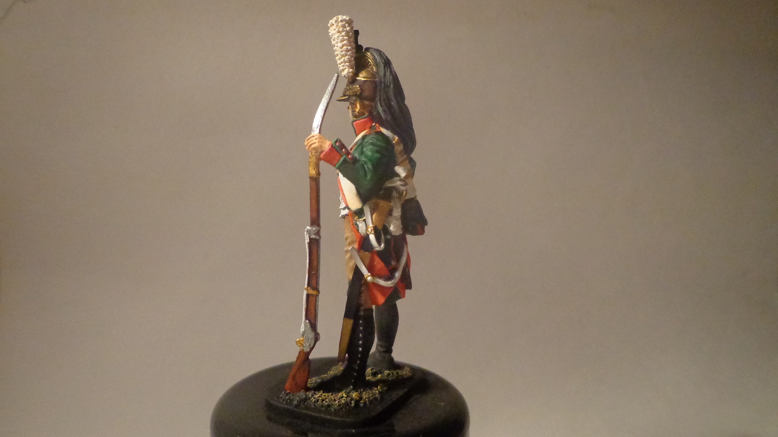 Всем здравствуйте! Представляю на Ваше обозрение свою вторую работу,выполненную акрилом "Ладога" и "Звезда". Взяв в руки миниатюру,сразу же столкнулся с трудностями- 1.это штык. За неимением опыта побоялся что-либо с ним сделать. 2. Задувая грунтом, фигурка покрылась "пузырями". В спешке пришлось смывать Уайт-спиритом и по еще не высохшей модели наносить заново. На мой взгляд, лег более менее.