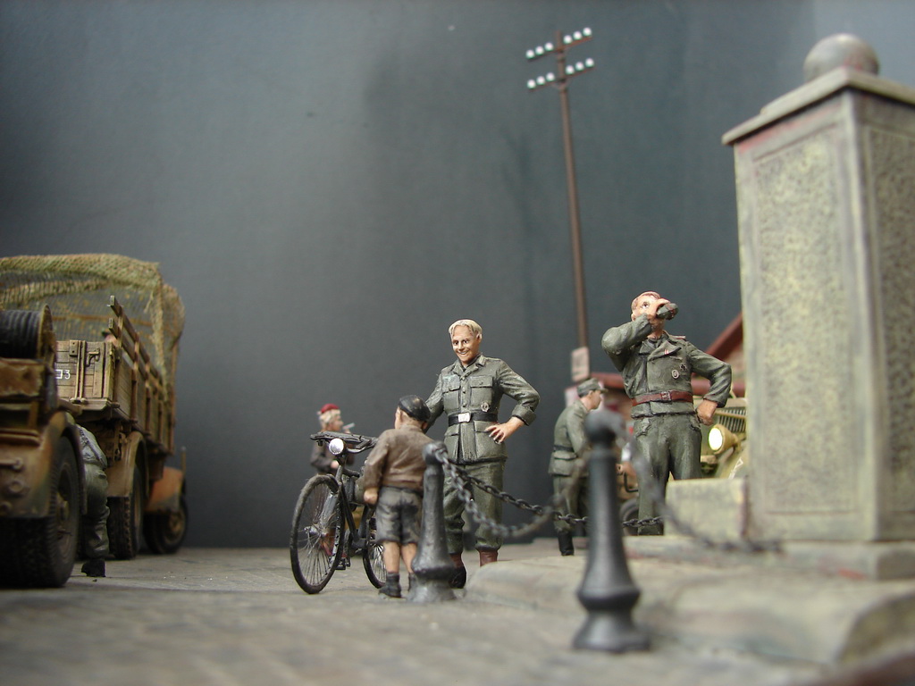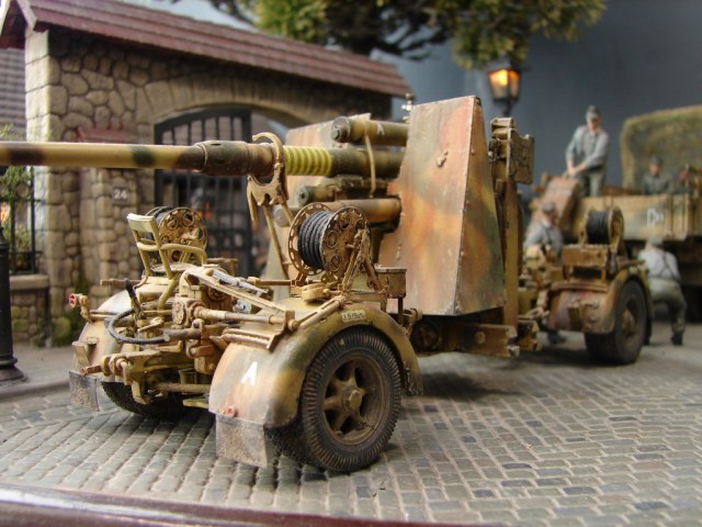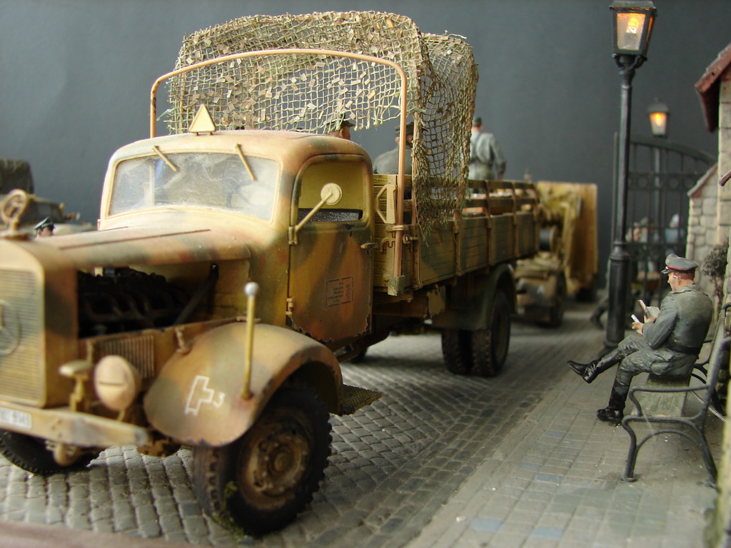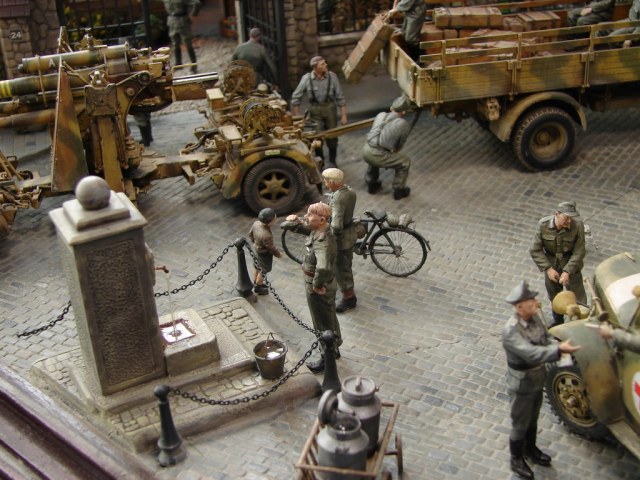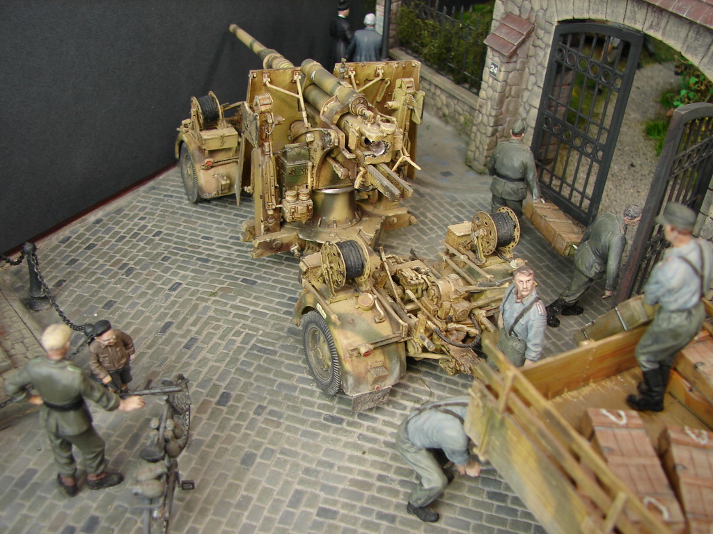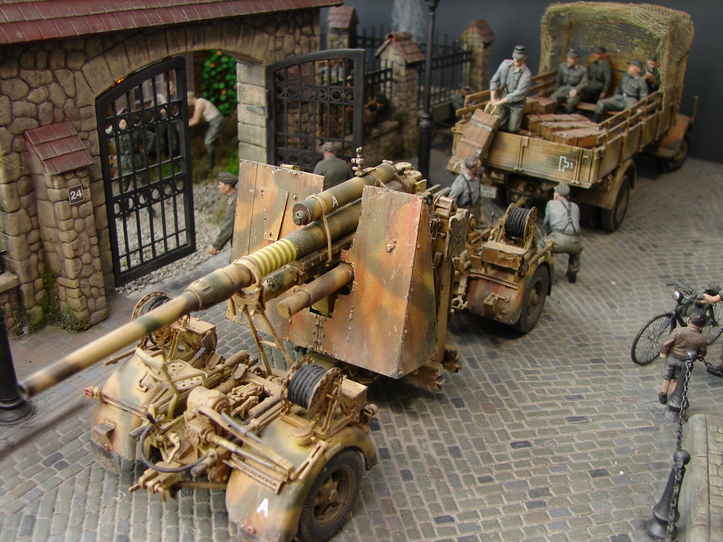 В преддверии киевской выставки,заставил себя доделать свою древнюю "виньетку".Начинал я ее 7 лет назад.Как и подобает начинающему диорама строителю-захотел впихнуть "невпихуемое" на одну подставку,размеры которой продиктованные моим углом для моделей.Скажу,что -немцы и,вообще,тема ВВ2-не моя.Свою "любовь" к технике того периода я как то удовлетворил в детстве,собрав танки от "Огонька")))И даже ,хлынувшие в перестроичные годы полчища моделей разнообразной техники тех лет,так и не возбудили во мне интерес.((( Но есть одно-"но".Нравятся мне весьма аутентичные вещи Германии того периода...Не знаю почему,но это -Флак 8.8 ,Штуг и разнообразные немецкие грузовики.Советская техника тоже имеет своих аутентичных героев,но они у меня оставлены на другой проект.)